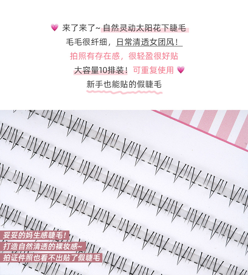 十排装大容量太阳花下睫毛假睫毛 仿真自然单簇分段透明梗假睫毛