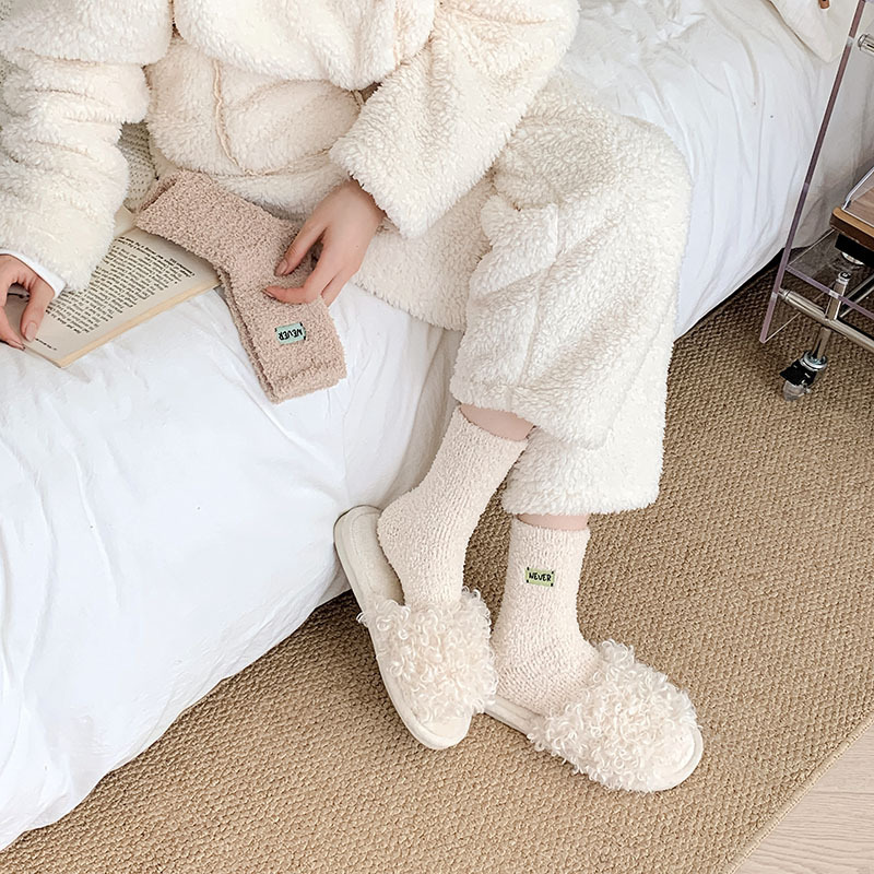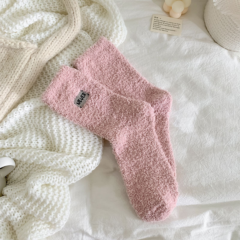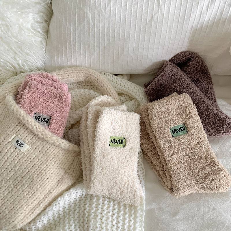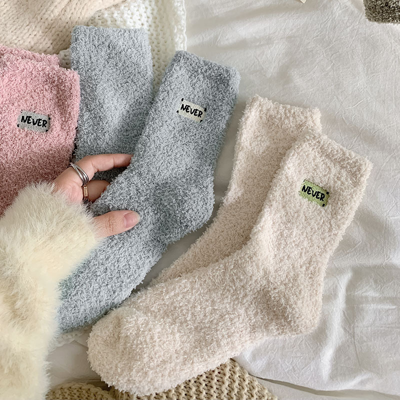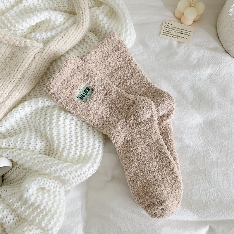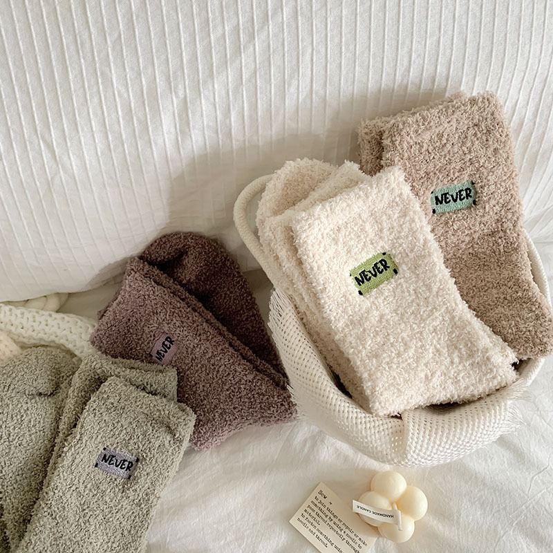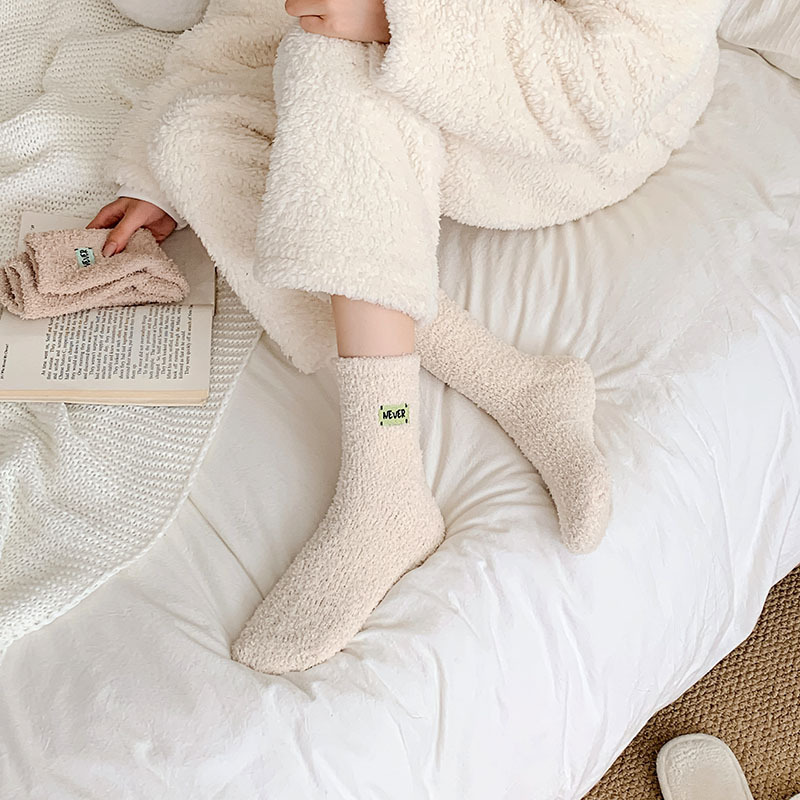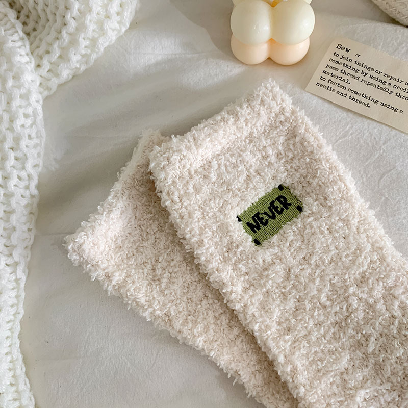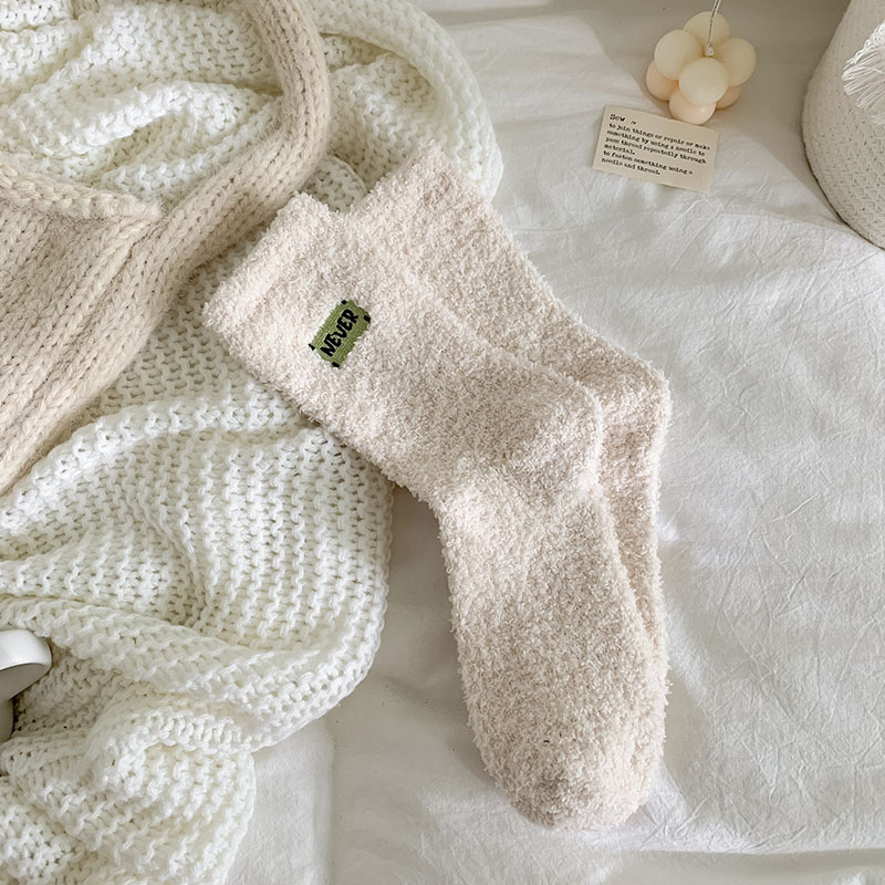 冬季 新品珊瑚绒袜子日系纯色字母刺绣半边绒女中筒袜保暖睡眠袜