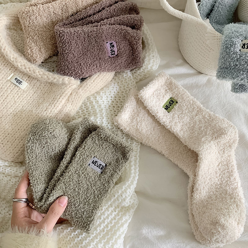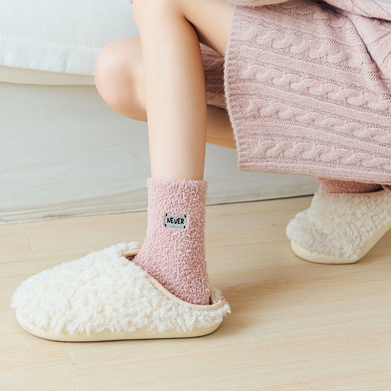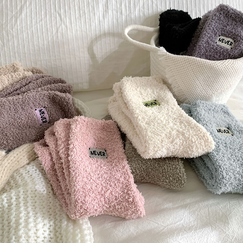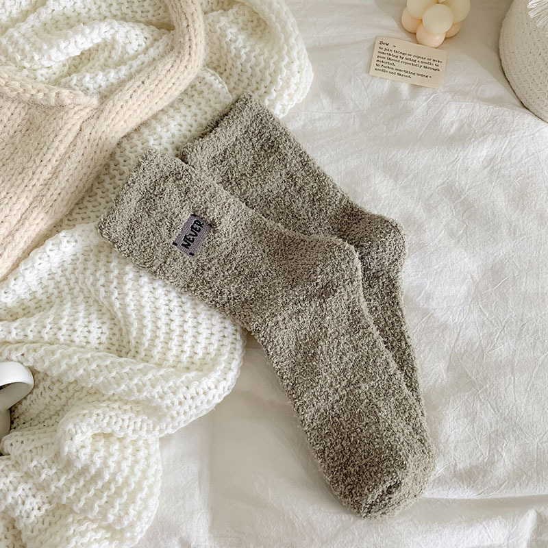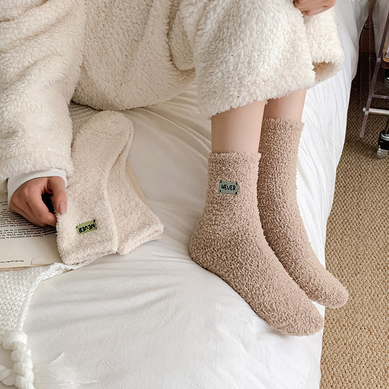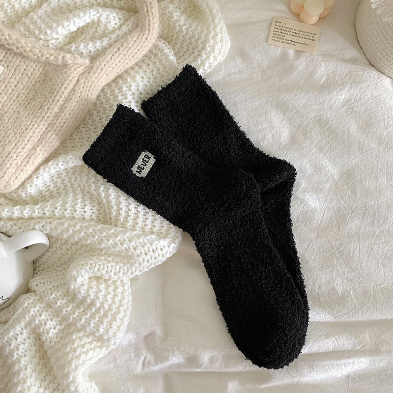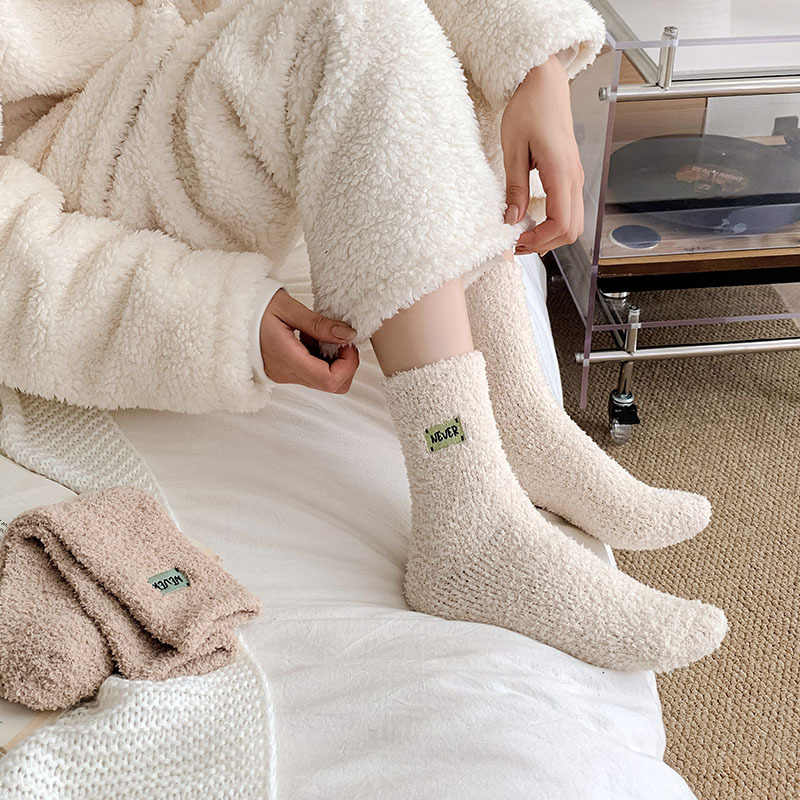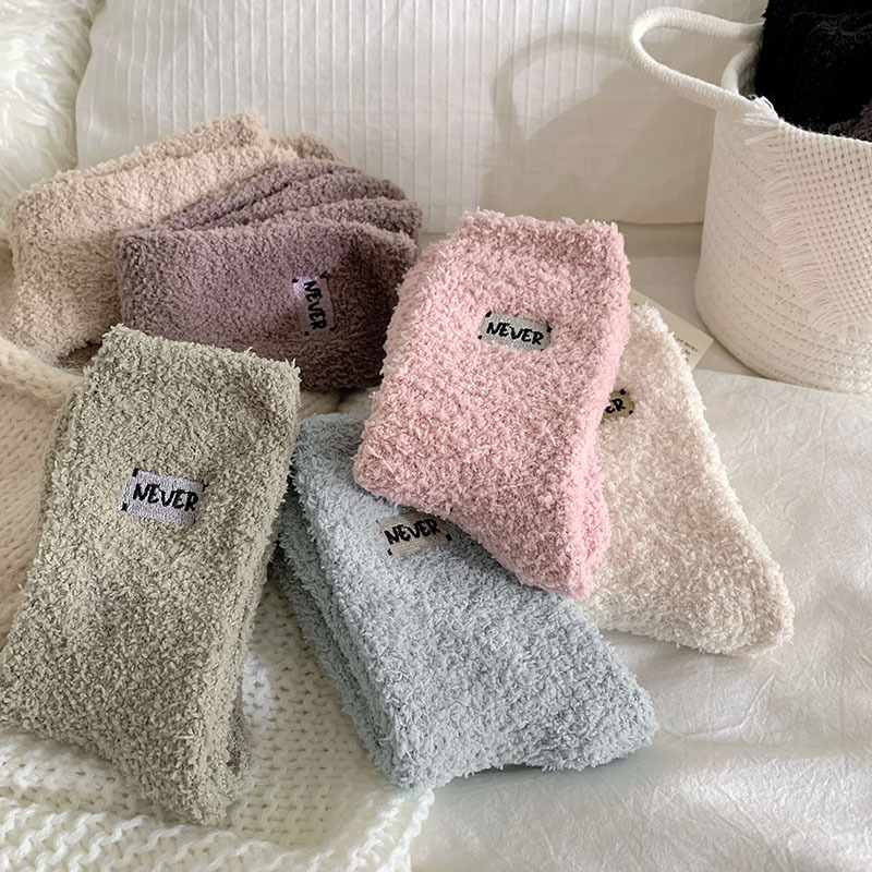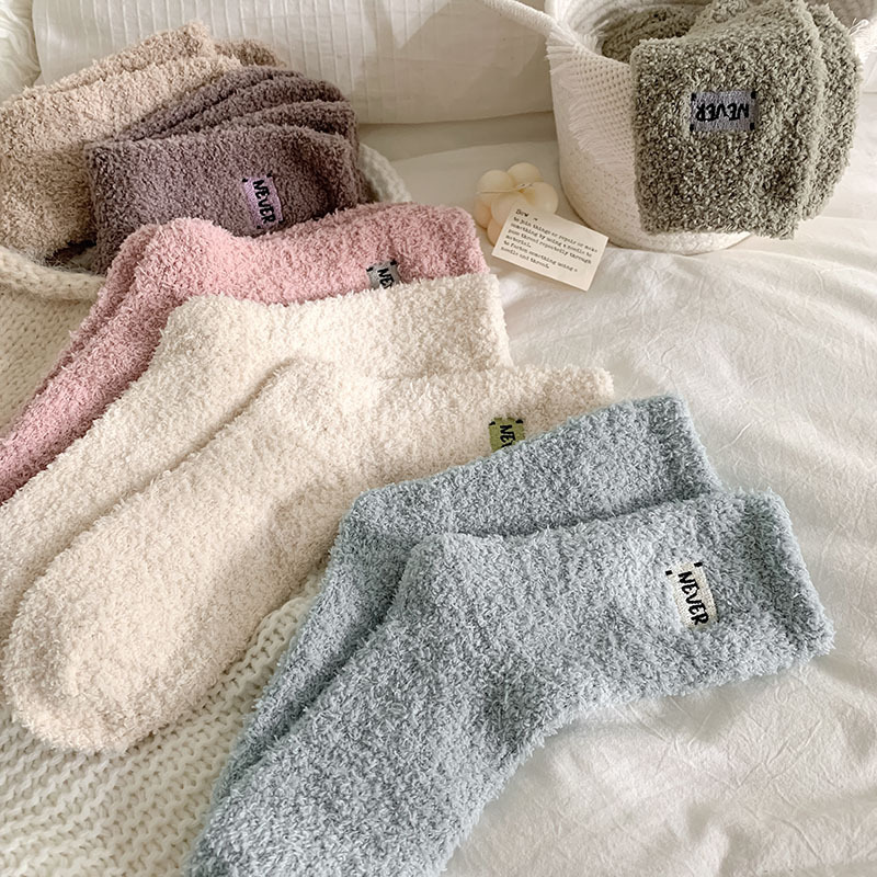 冬季 新品珊瑚绒袜子日系纯色字母刺绣半边绒女中筒袜保暖睡眠袜