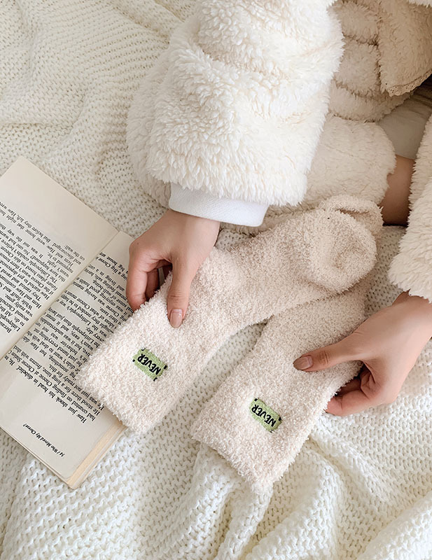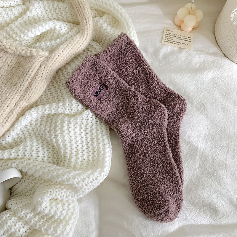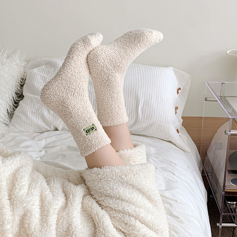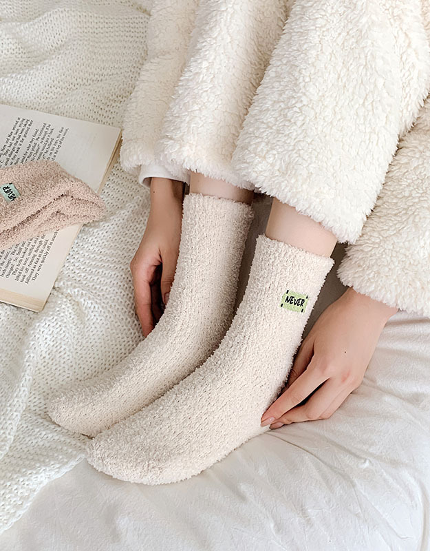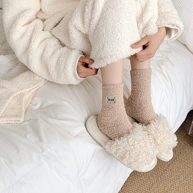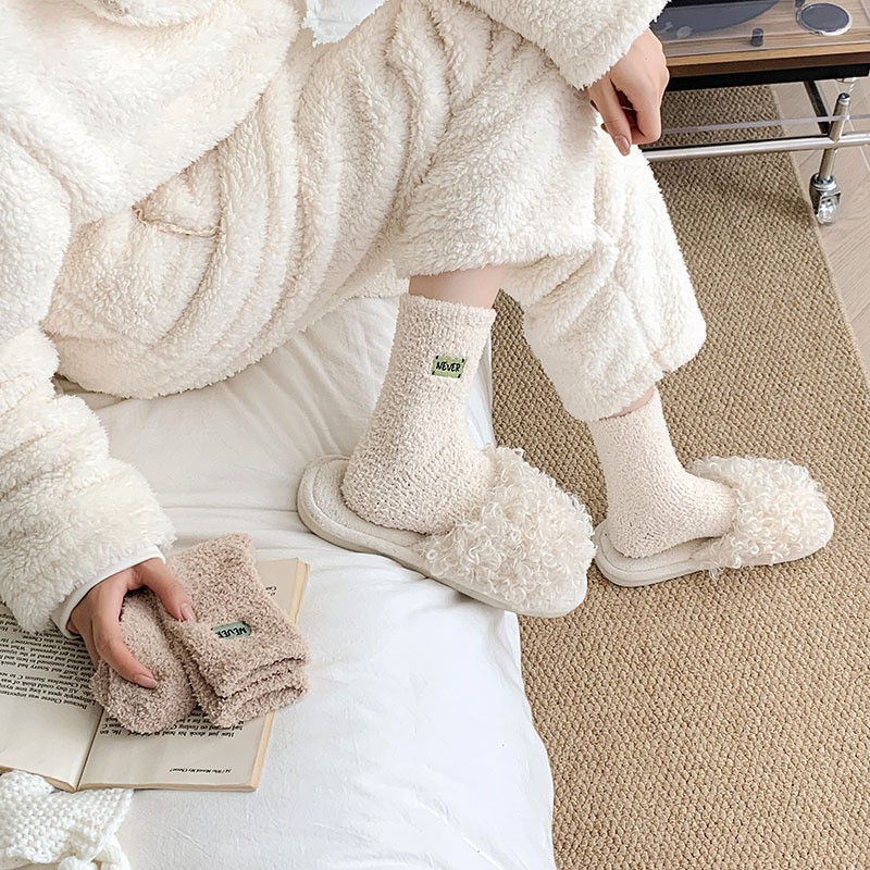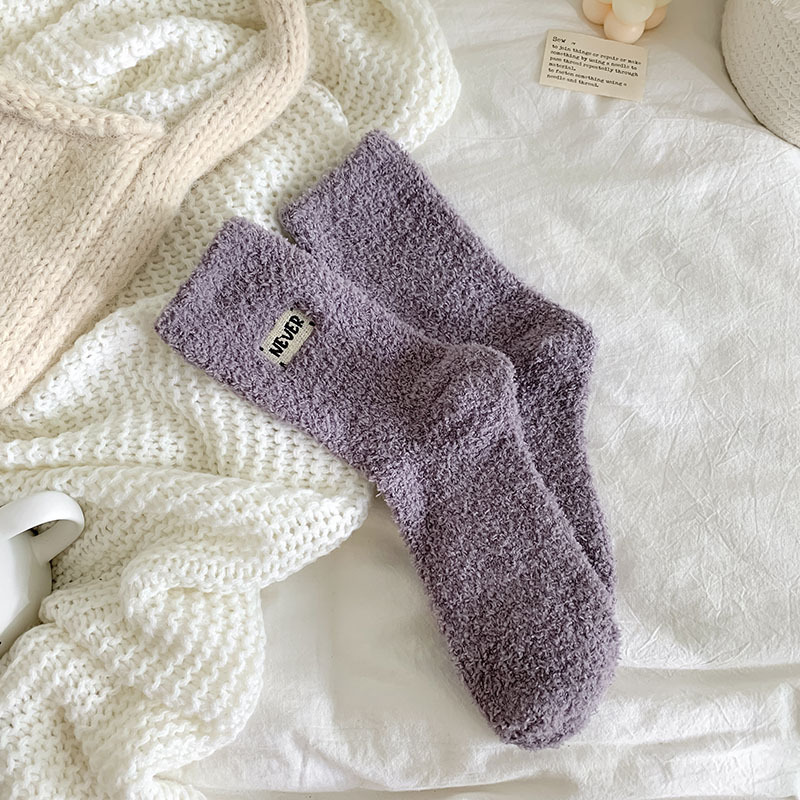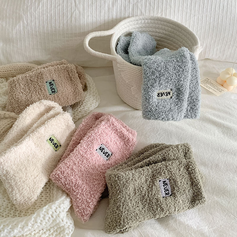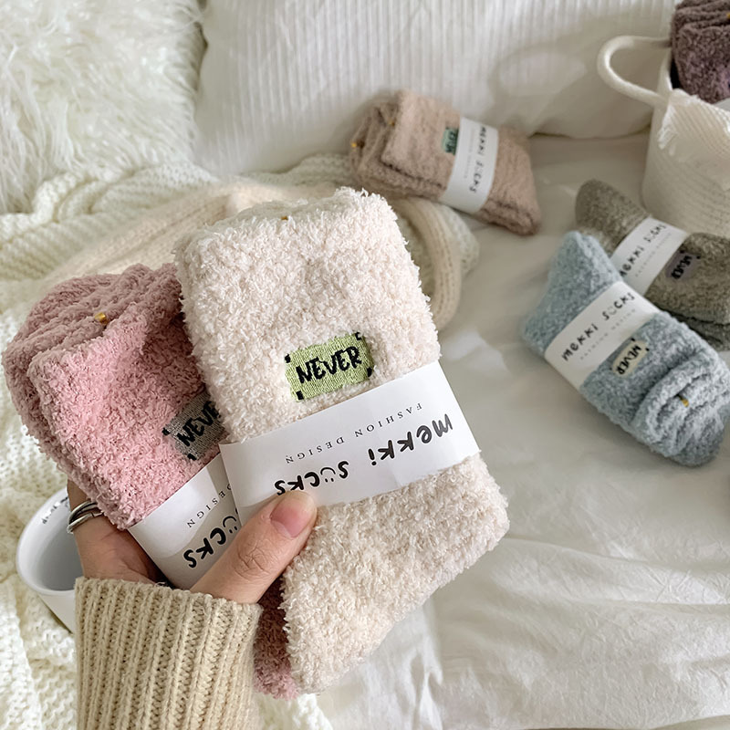 冬季 新品珊瑚绒袜子日系纯色字母刺绣半边绒女中筒袜保暖睡眠袜