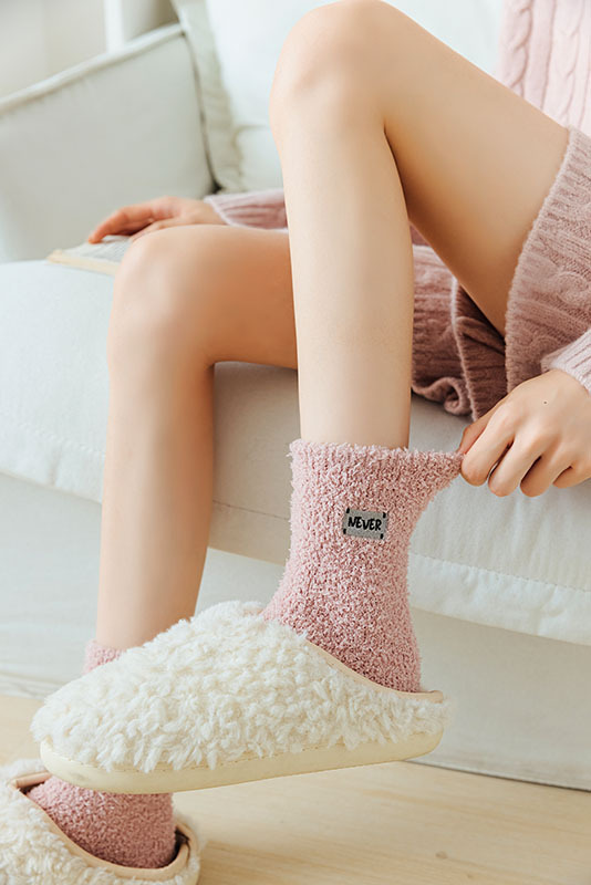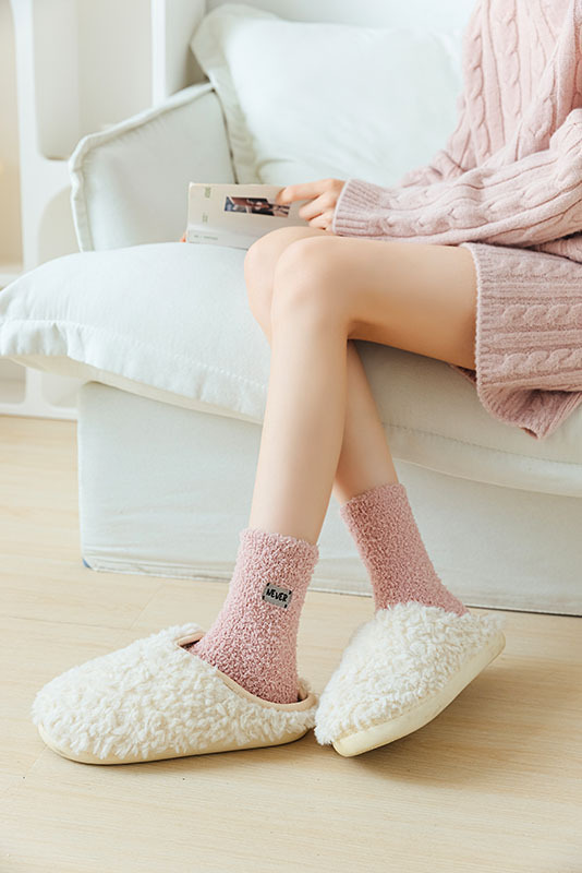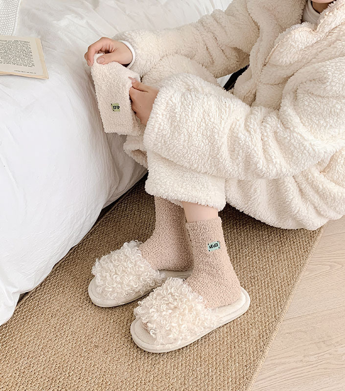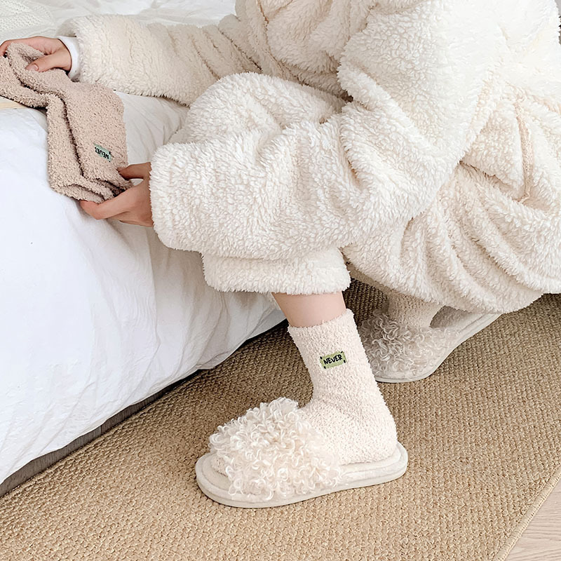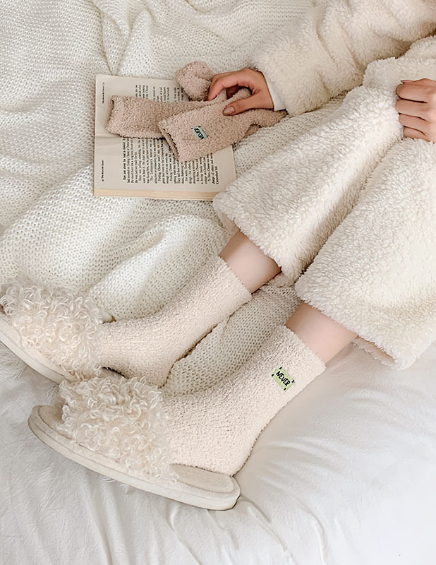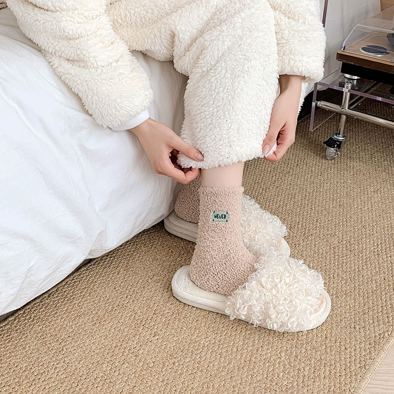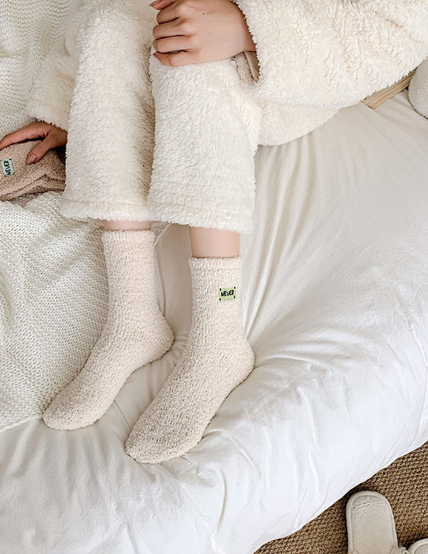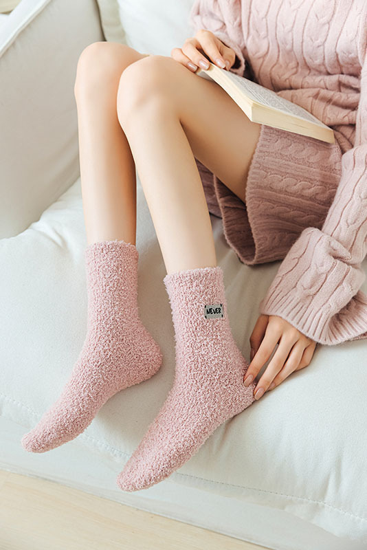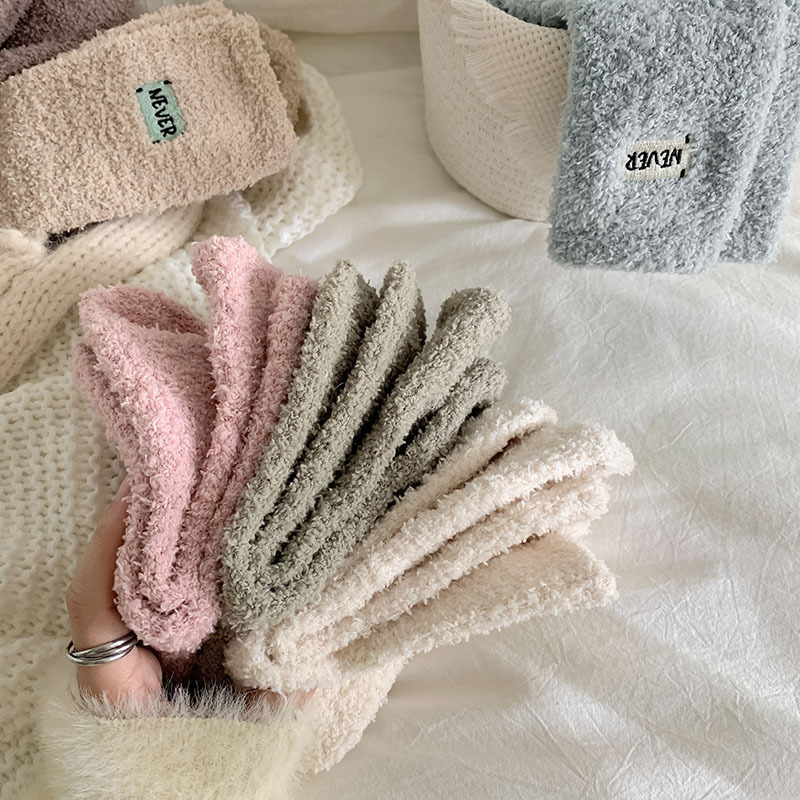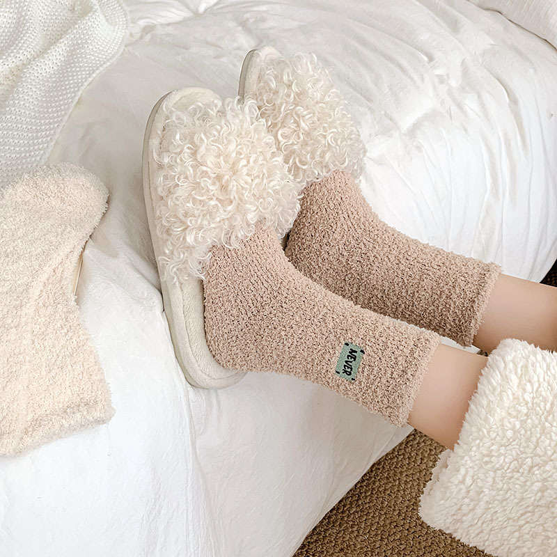 冬季 新品珊瑚绒袜子日系纯色字母刺绣半边绒女中筒袜保暖睡眠袜