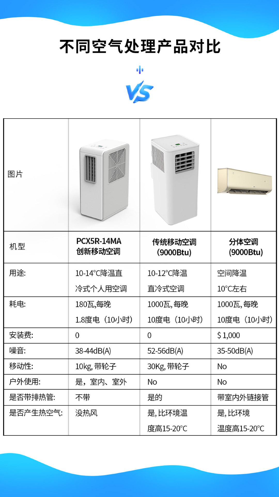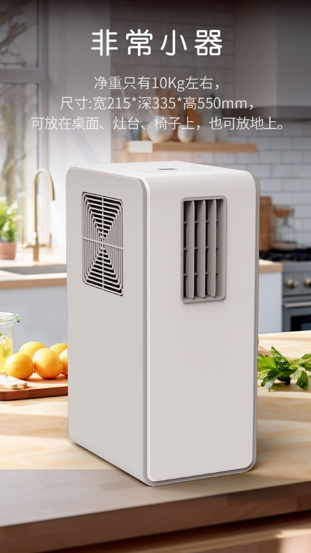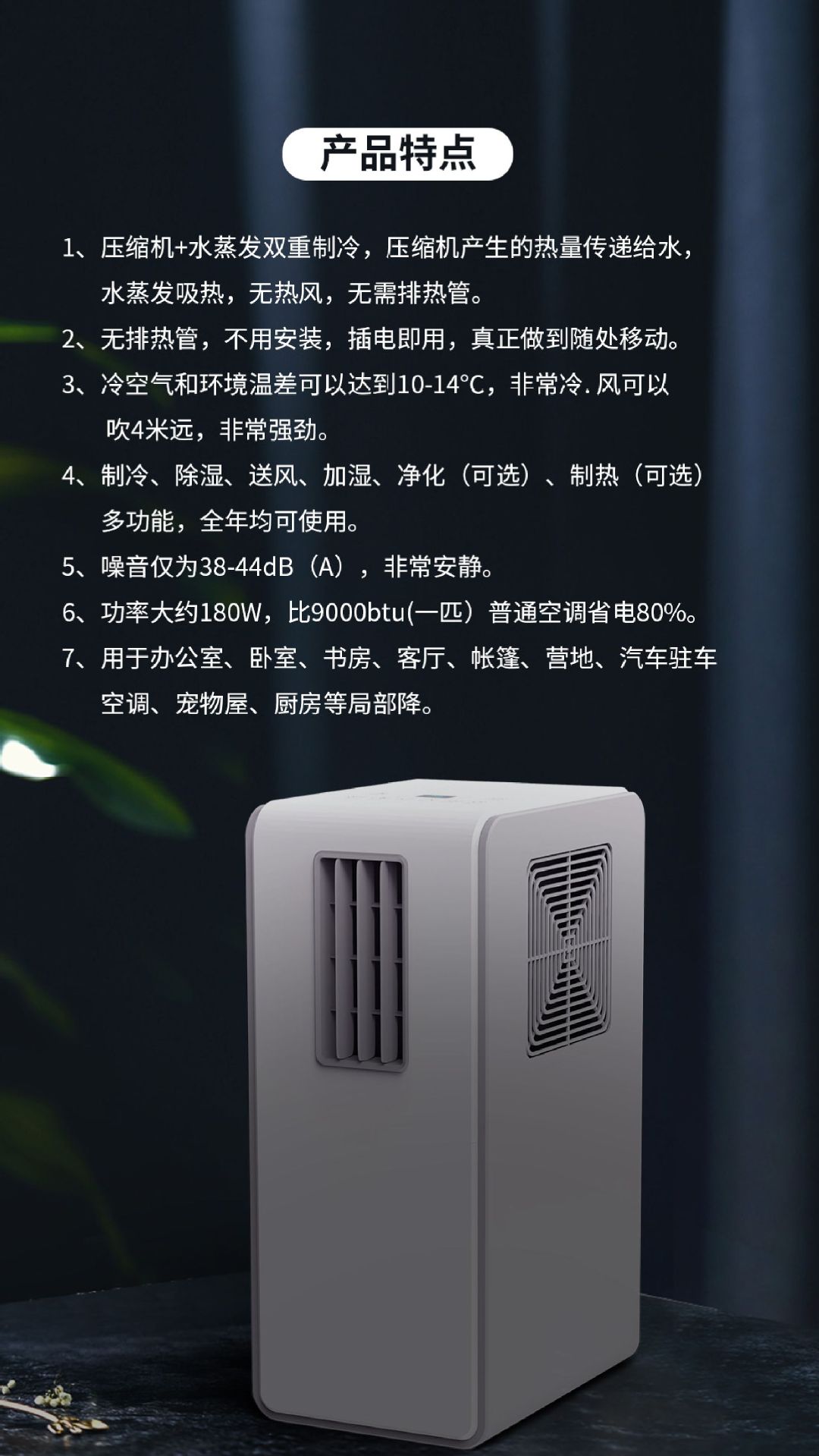 本产品是公司最新开发产品 压缩机制冷,方便在厨房 卧室临时使用,也可以随身携带到户外使用,无排热管道 真正做到了可以随时移动的空调.有兴趣的可以私聊