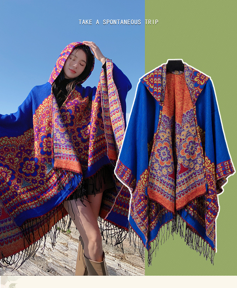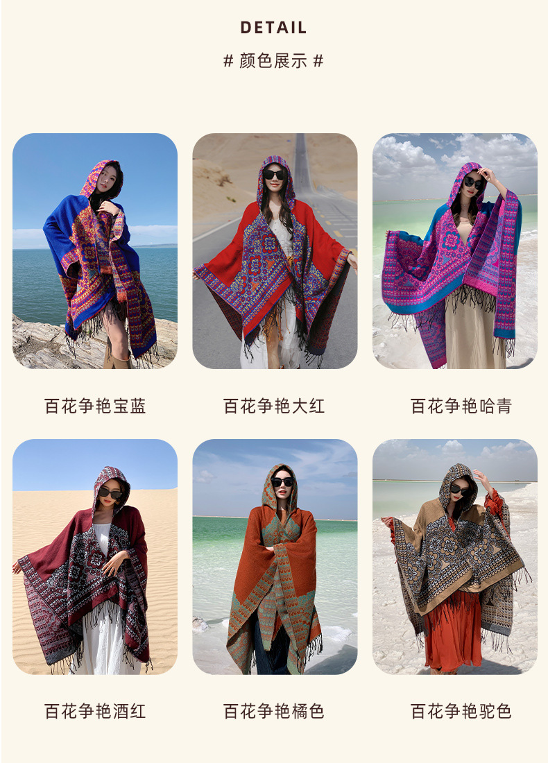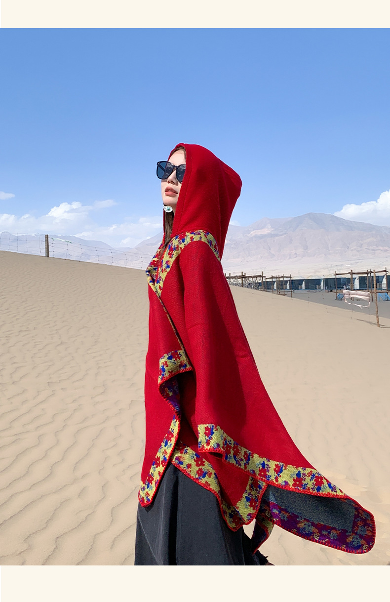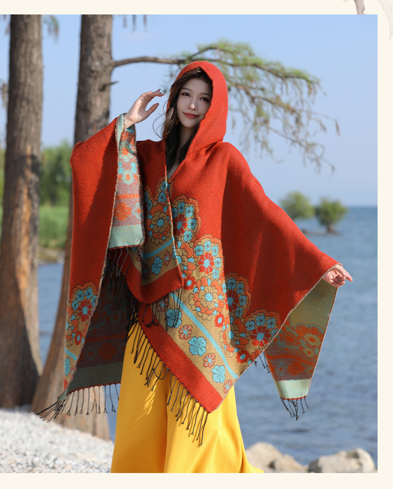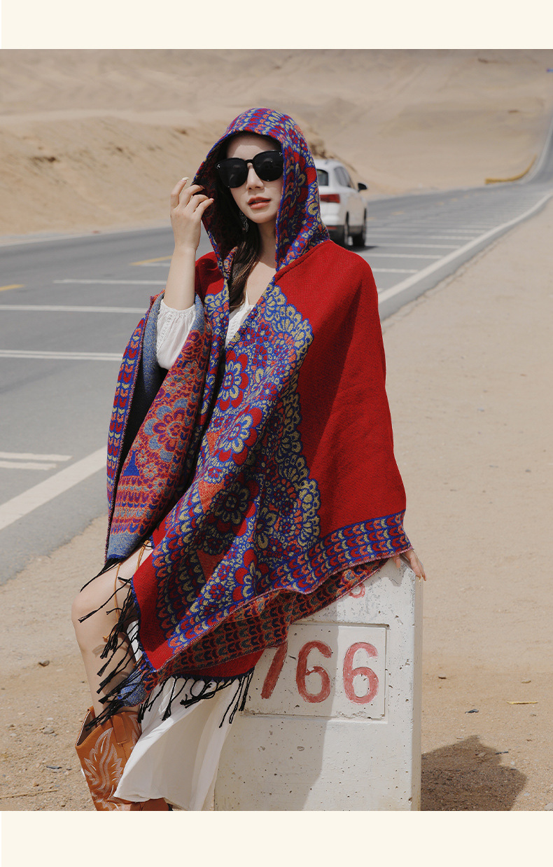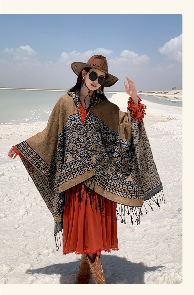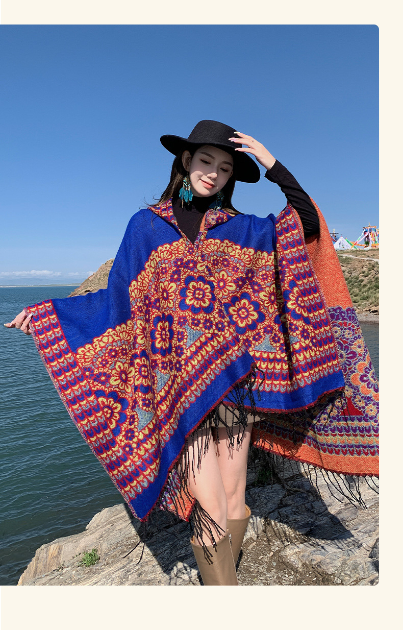 新款披肩民族风云南旅游穿搭夏天围巾女开衫外搭连帽斗篷流苏披风