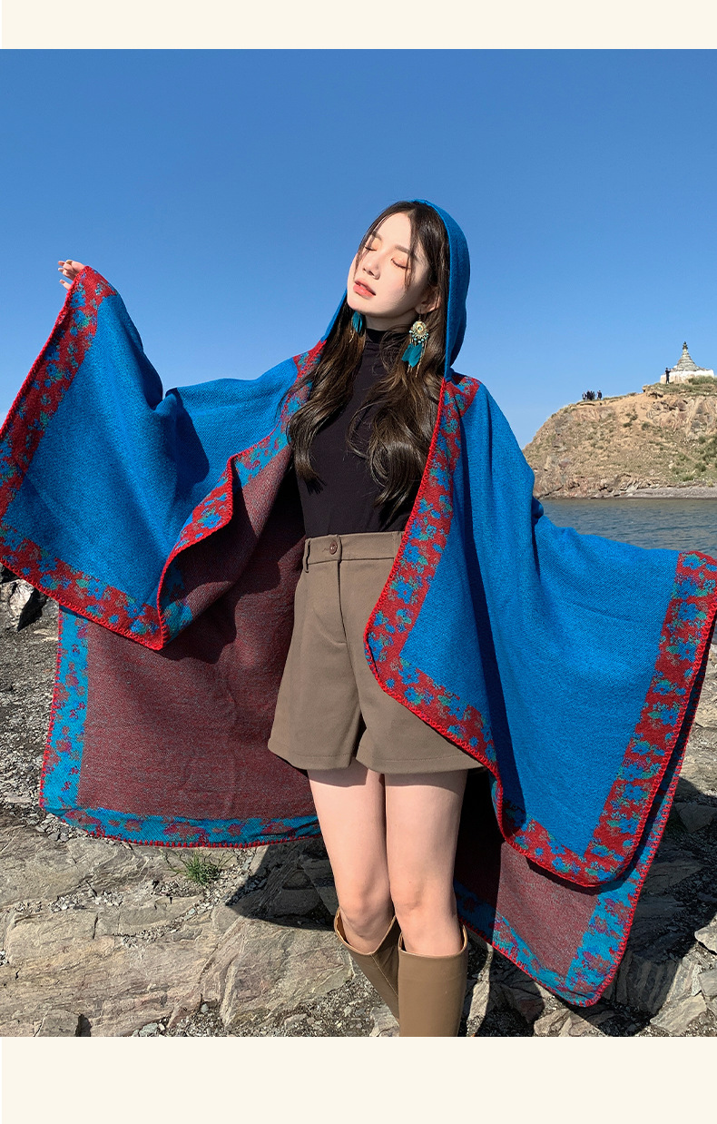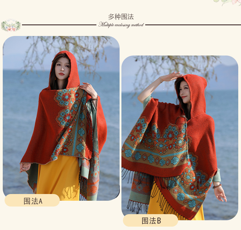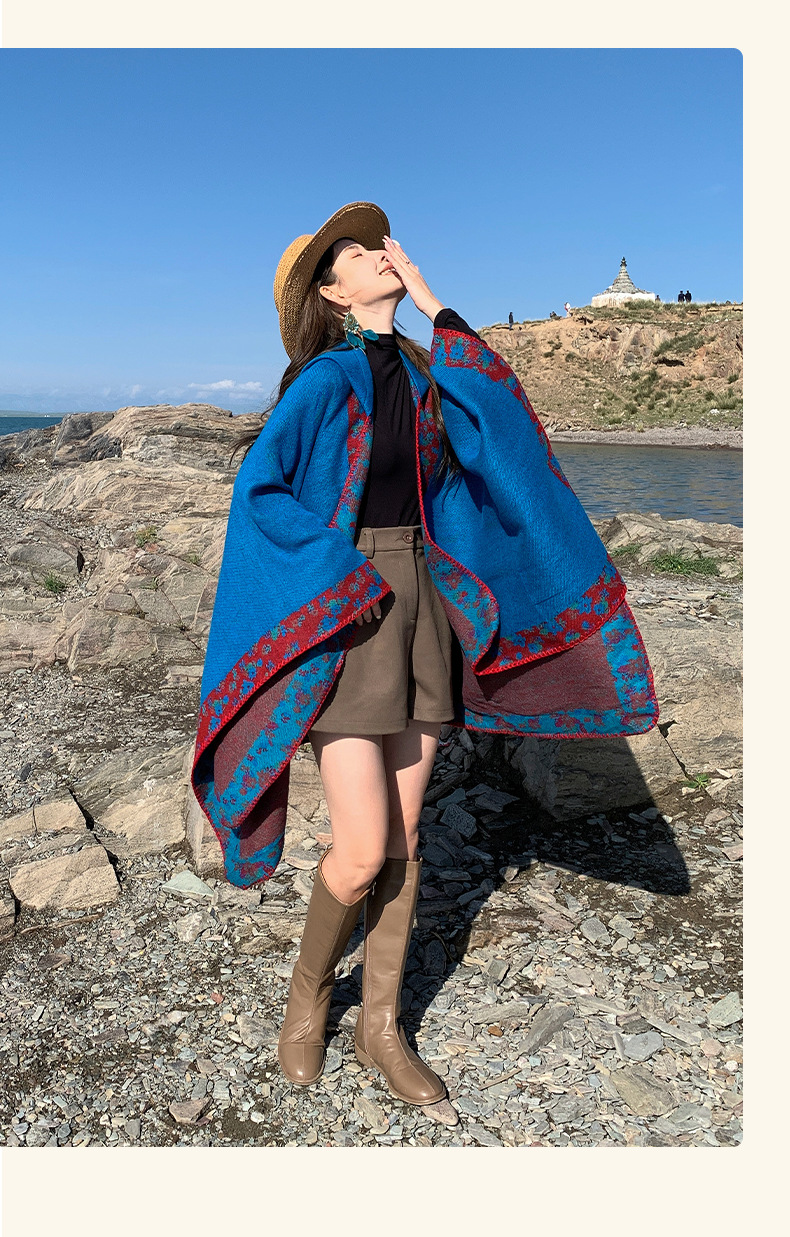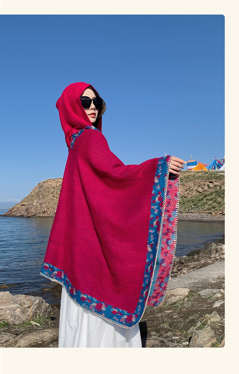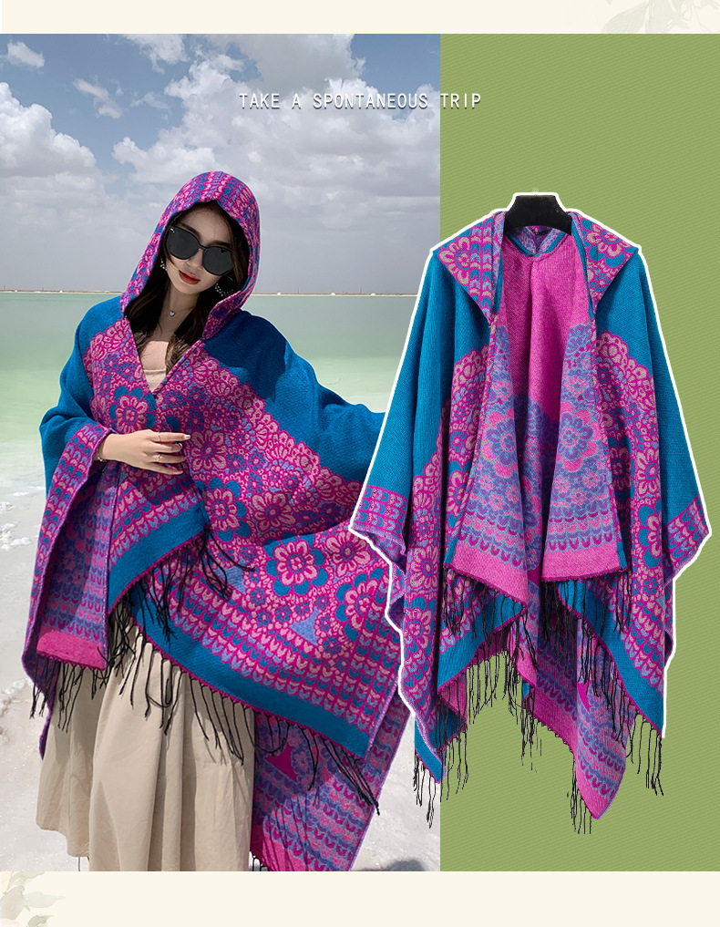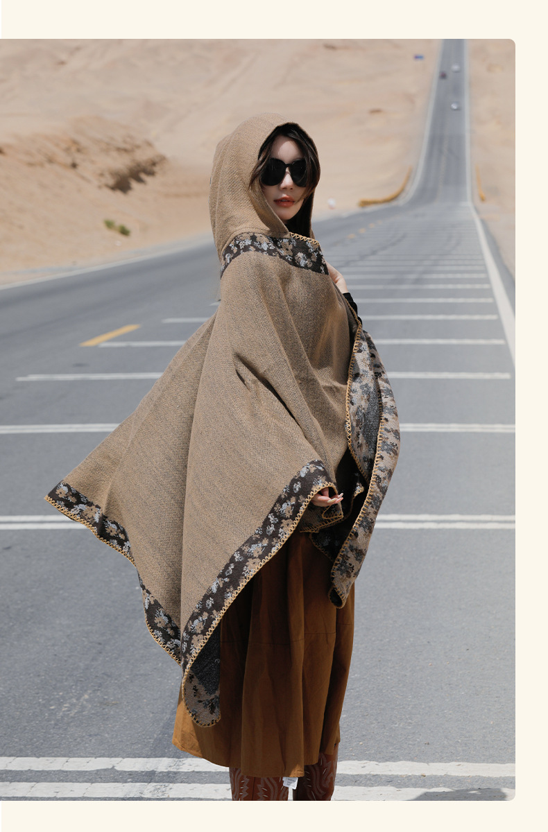 新款披肩民族风云南旅游穿搭夏天围巾女开衫外搭连帽斗篷流苏披风
