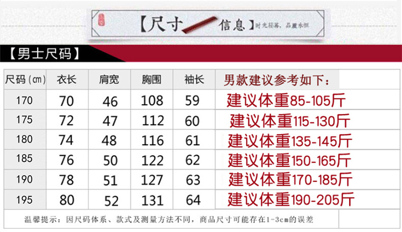 | 185 (75.00 kg-82.50 kg(185(150-165斤)) | USD $0.0 | 9998 set available |