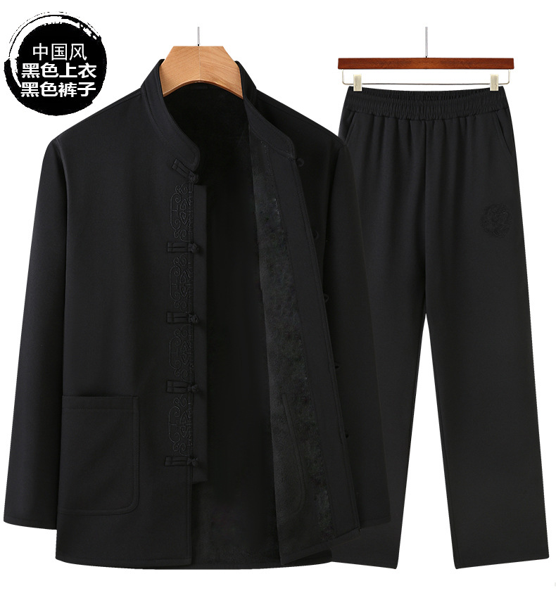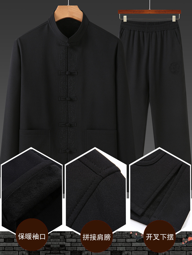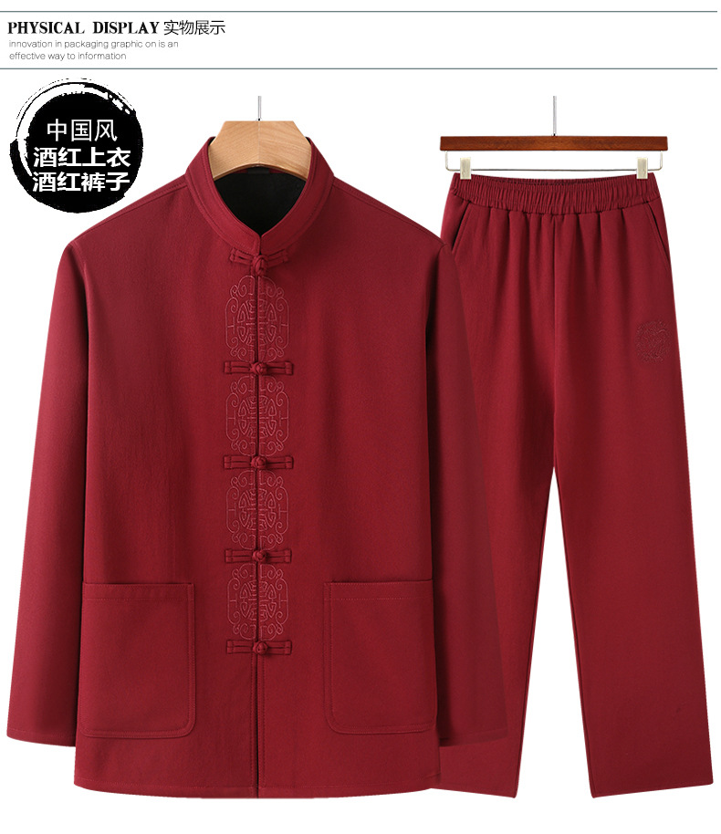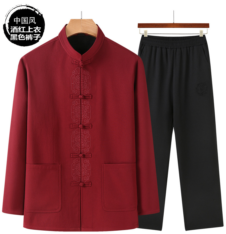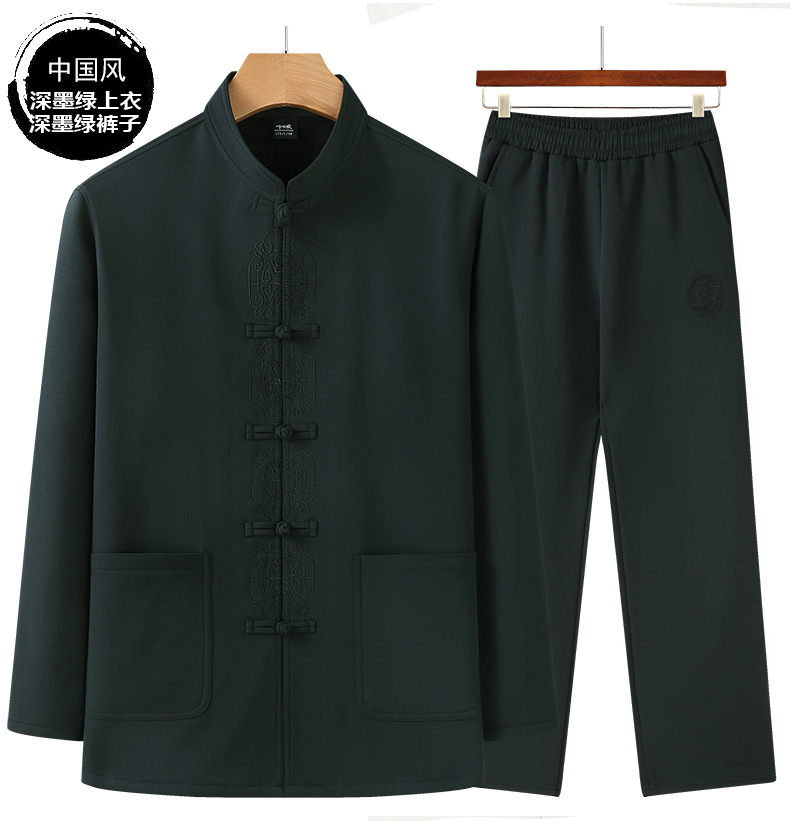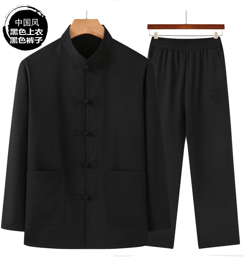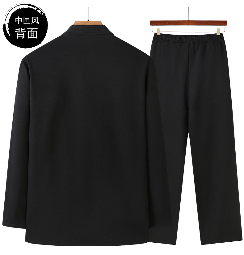 老人秋装长袖t恤男士中老年中国风唐装两件套宽松大码棉麻爷爷装