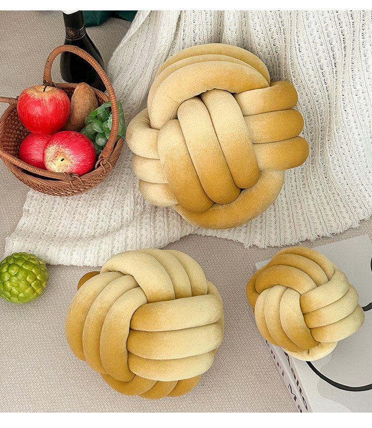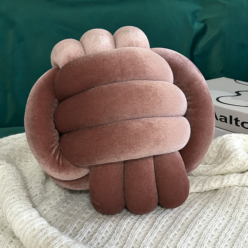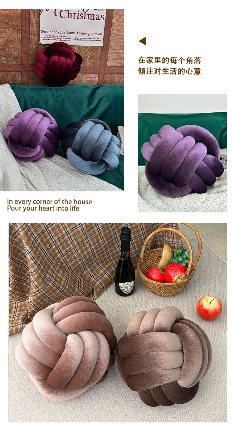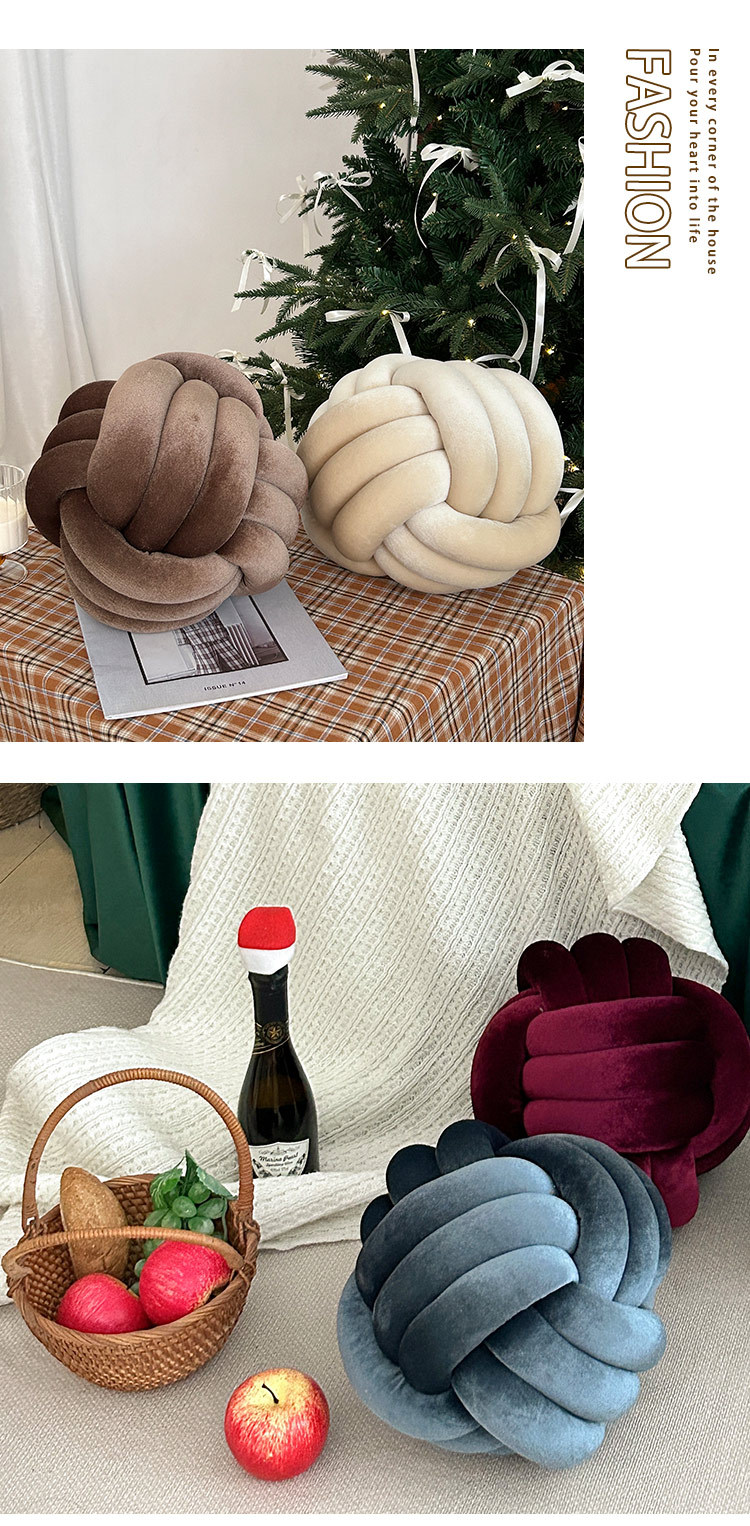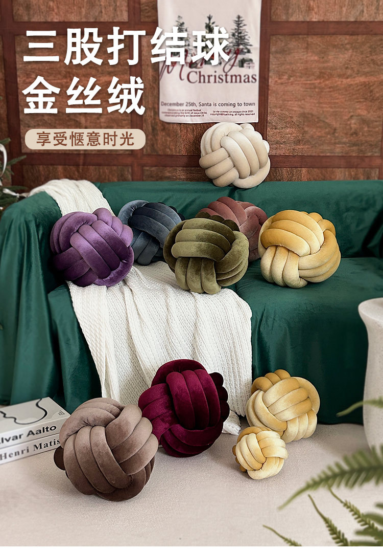 北欧ins抱枕三股绳打结球抱枕手工编织金丝绒靠枕靠垫knot飘窗垫