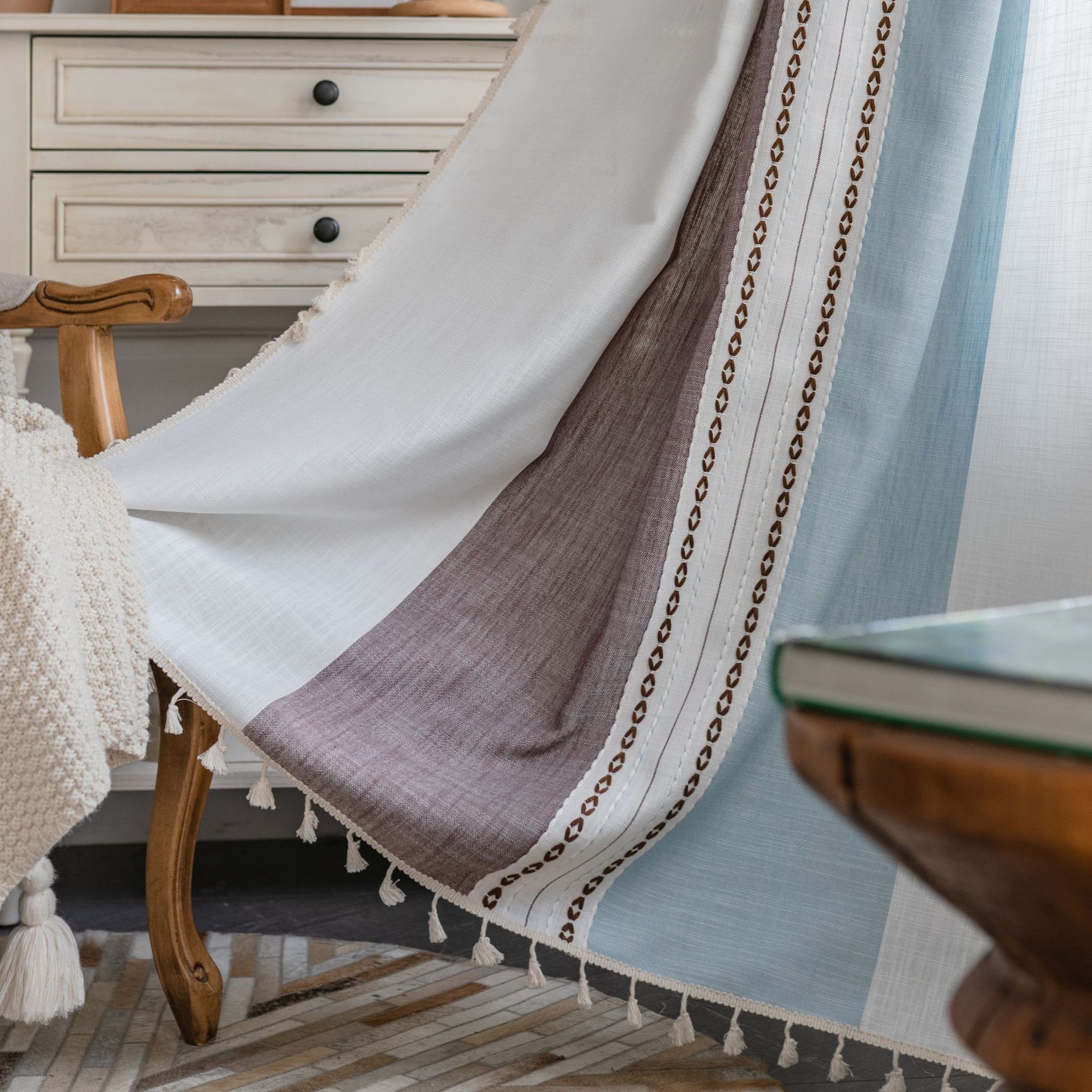 外贸跨境热卖撞色窗纱提花工艺窗帘半遮光遮阳乡村风格客厅飘窗