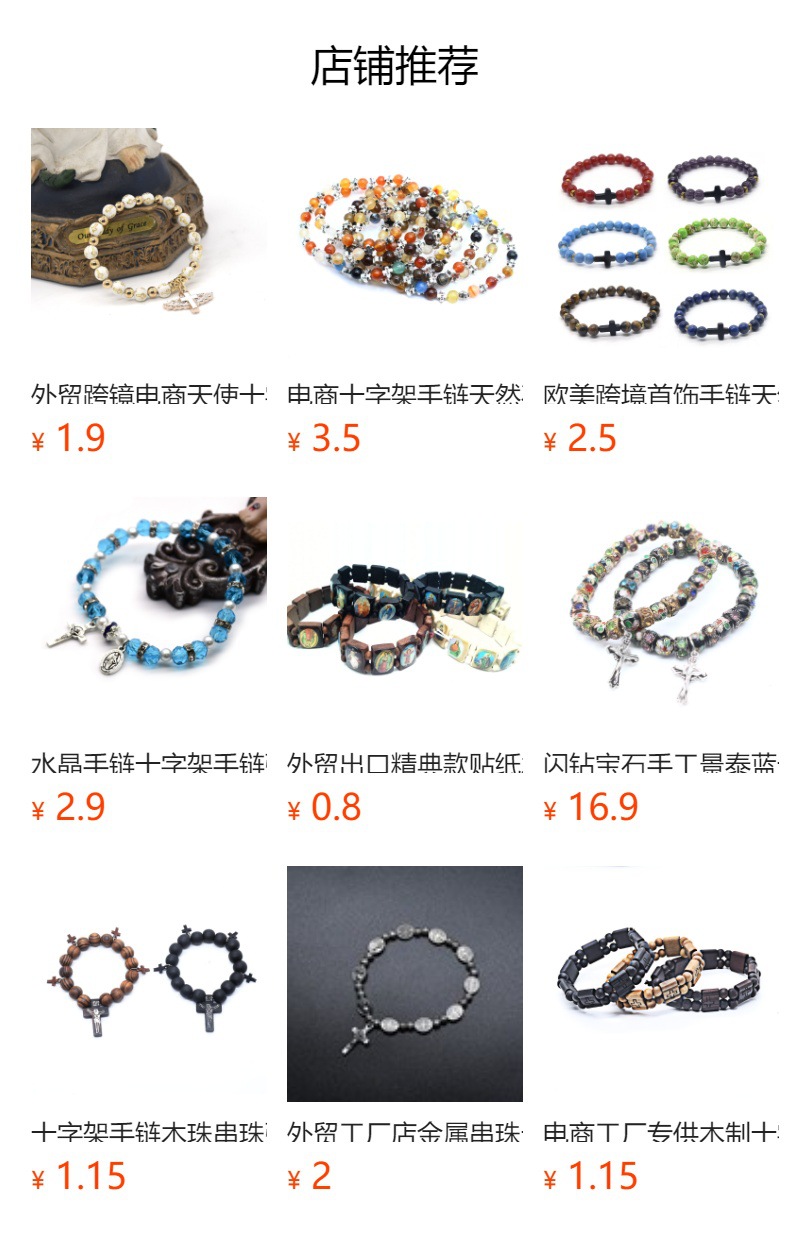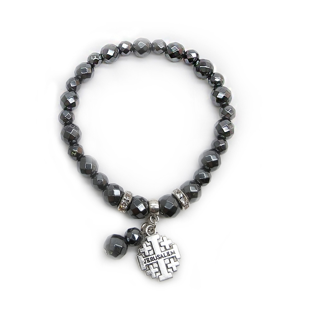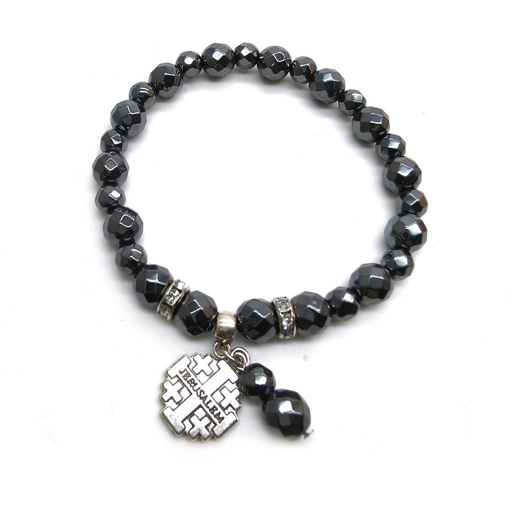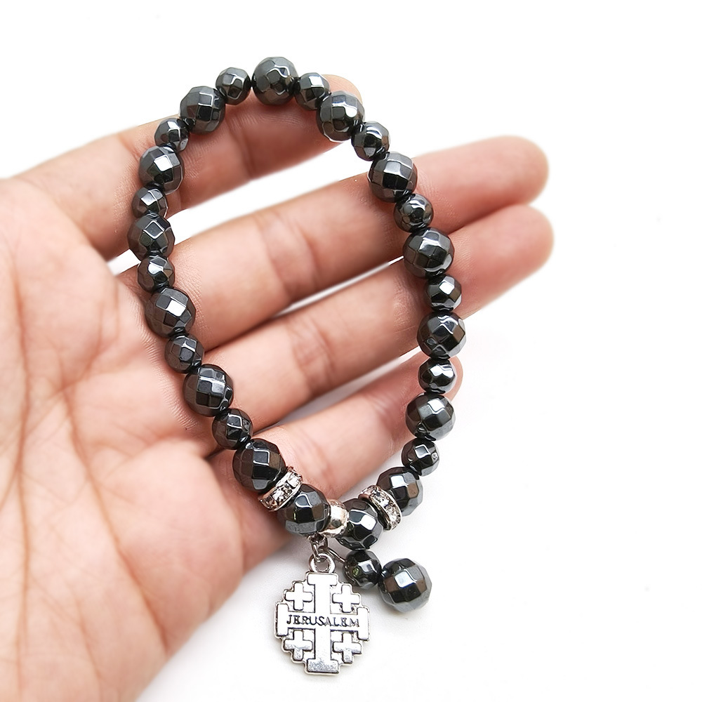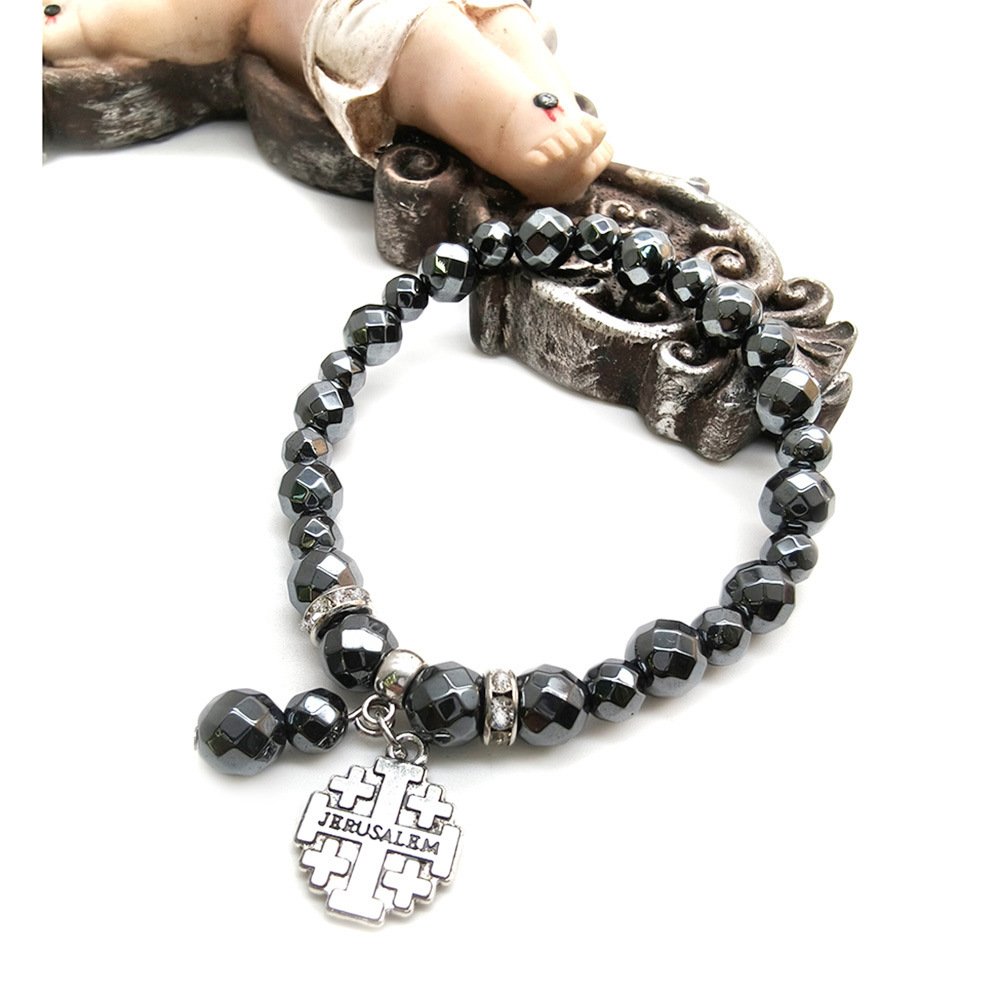 十字JERUSALE黑胆石吊坠手链黑色赤矿石弹力手环跨境专供外贸电商