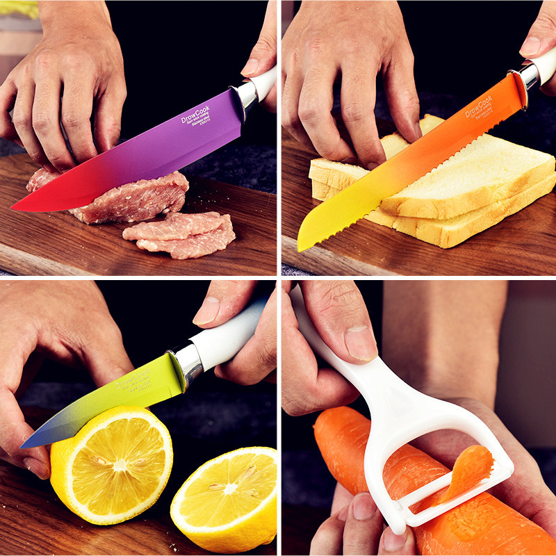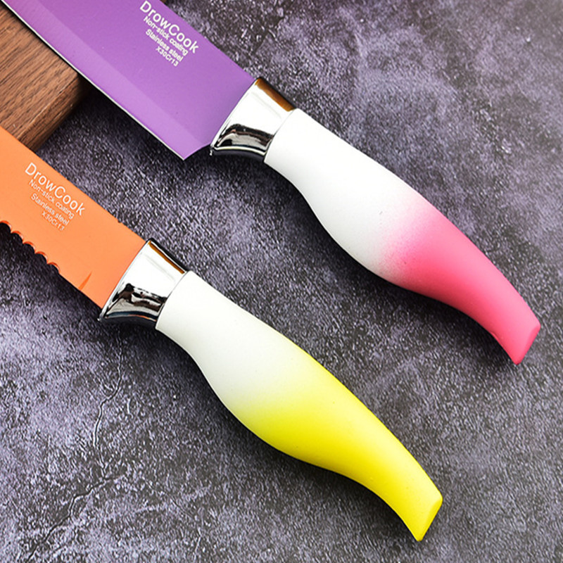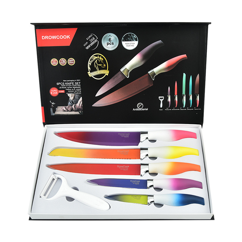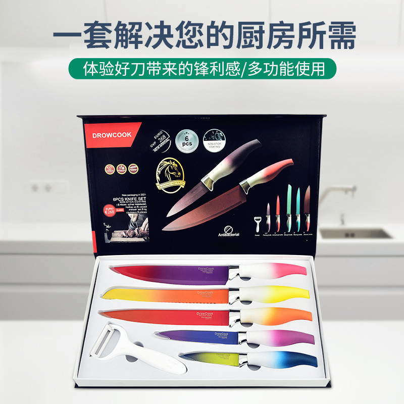 跨境厨房家用套刀电镀头不锈钢刀具彩色海马柄6件套礼品彩盒套装