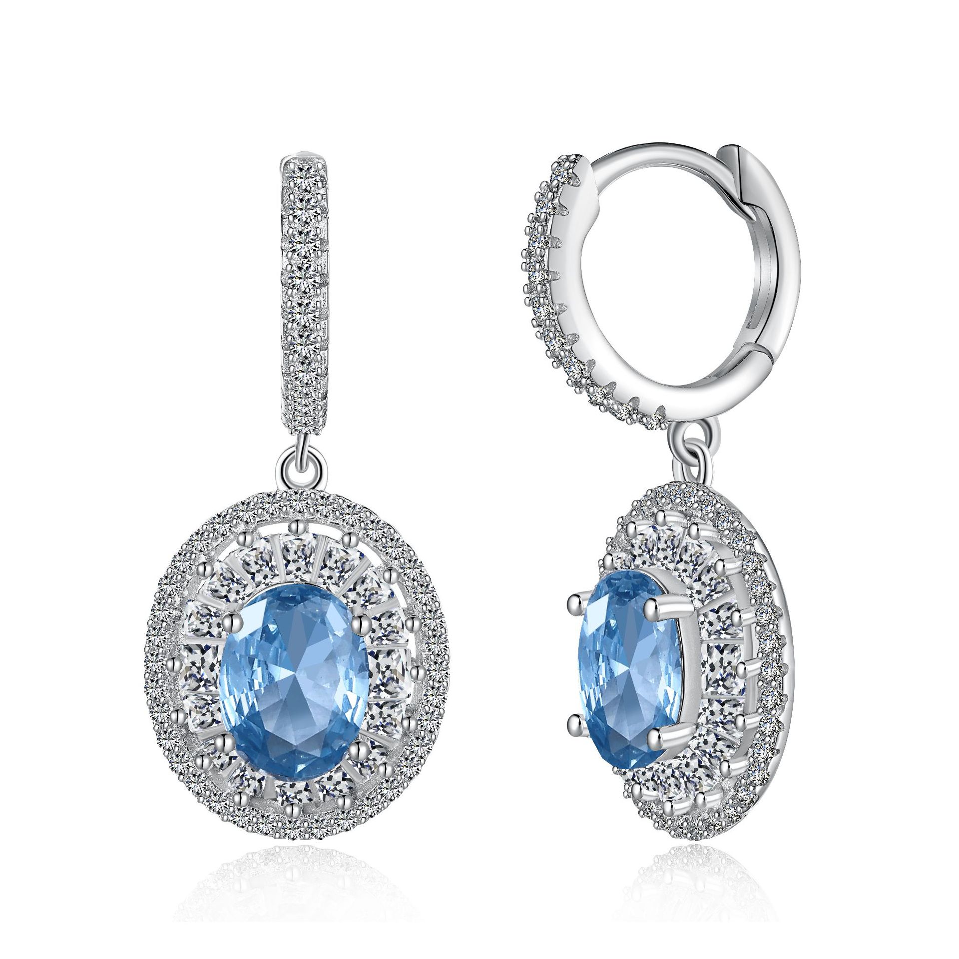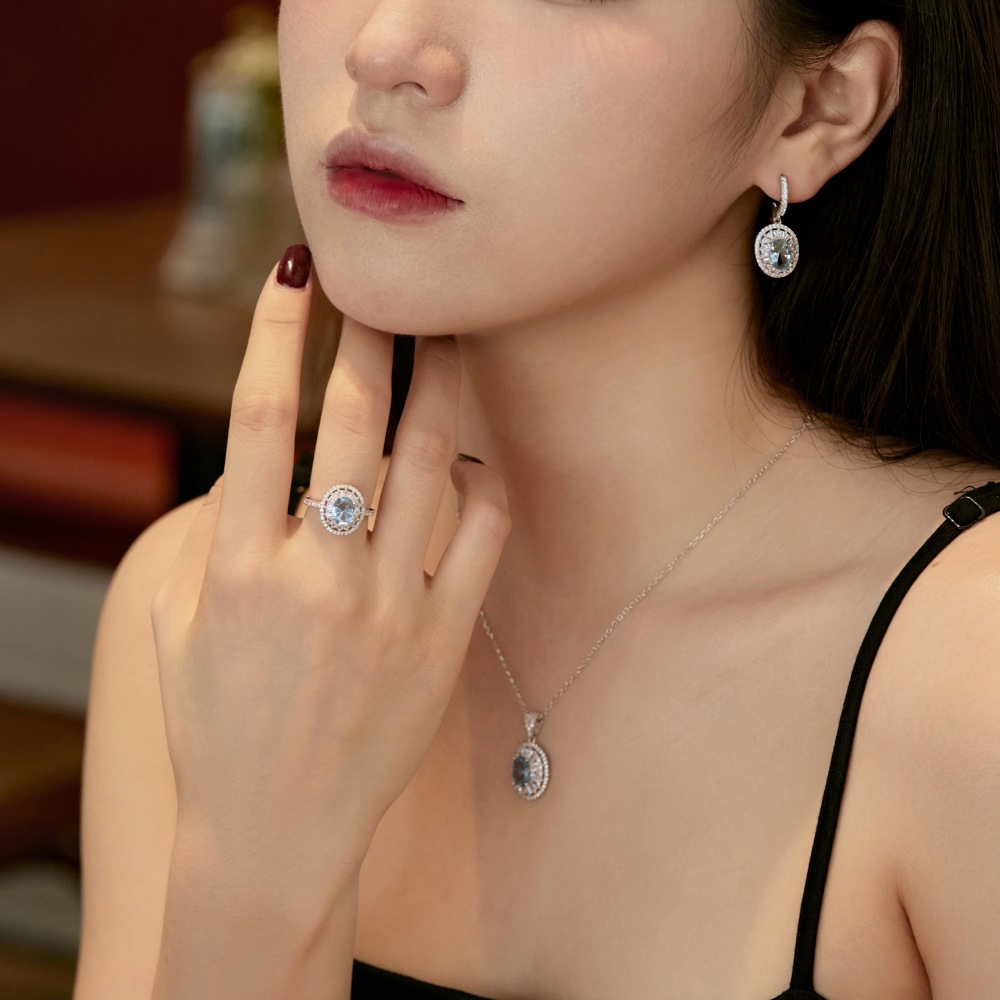S925纯银蓝色锆石戒指耳环项链女三件套满钻椭圆海蓝宝石首饰套装