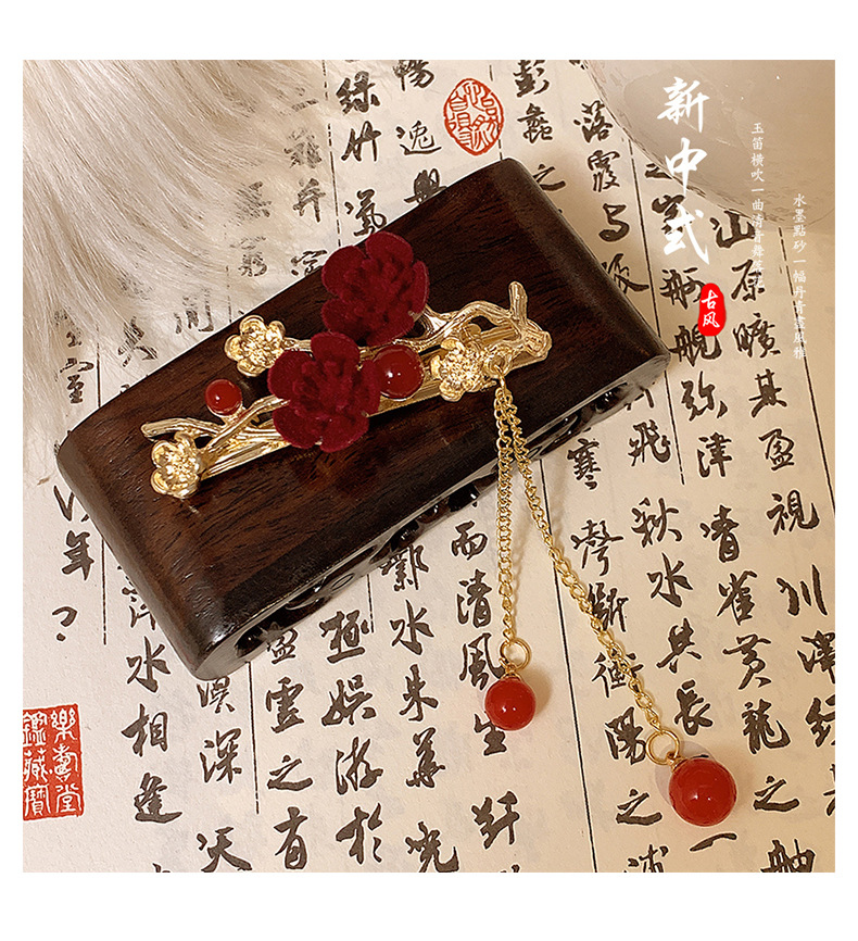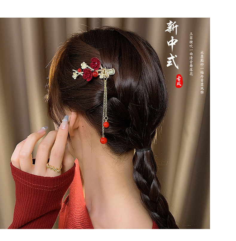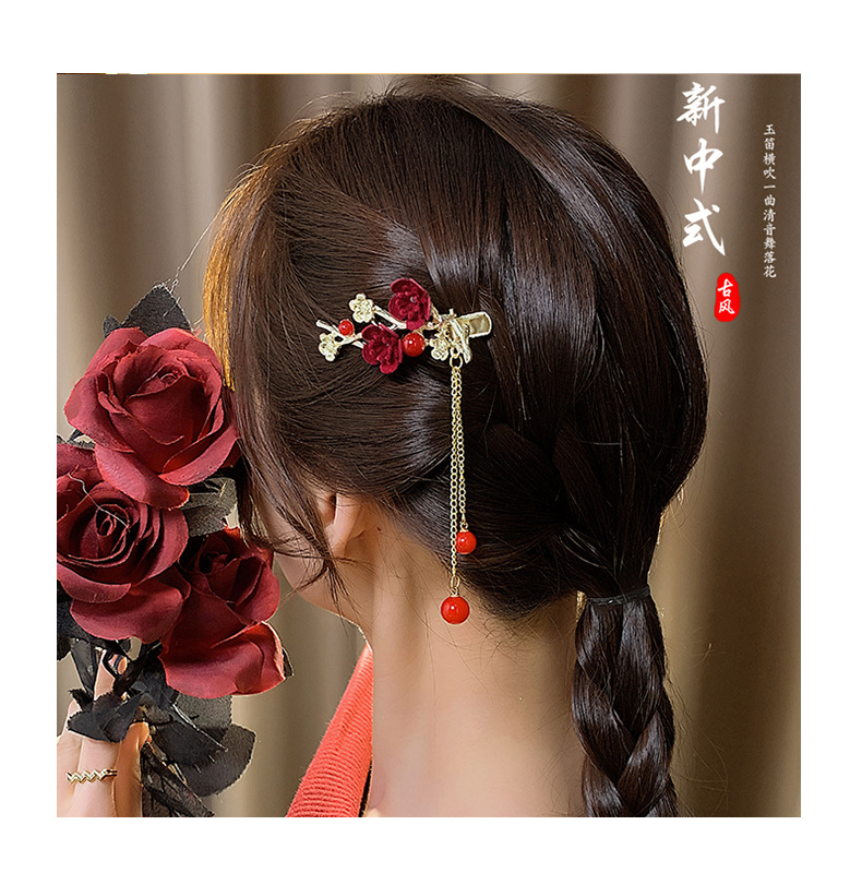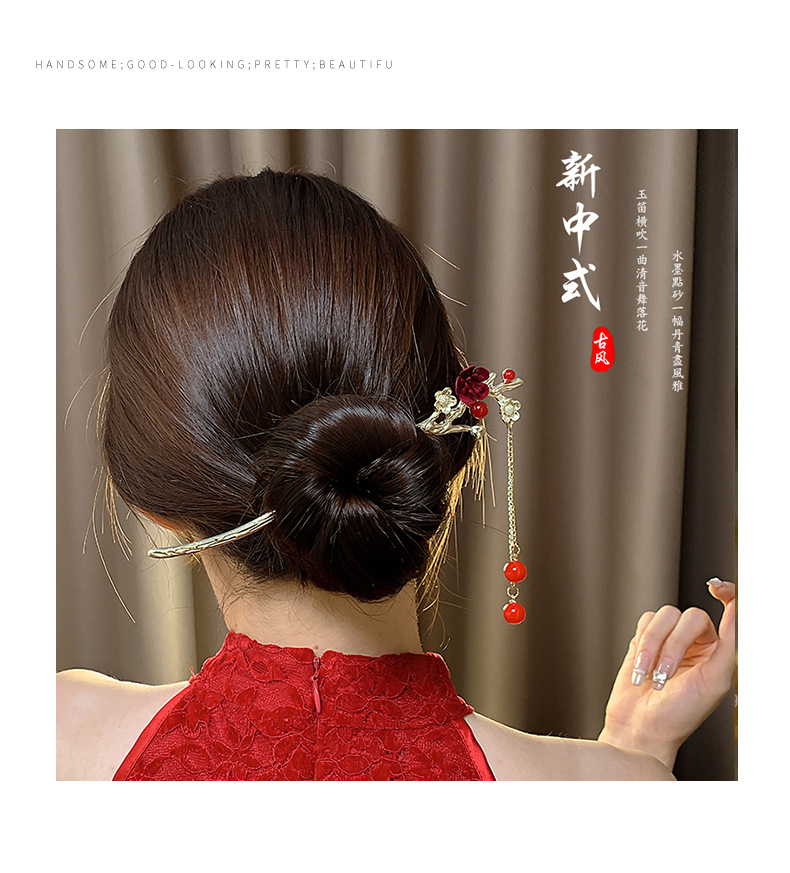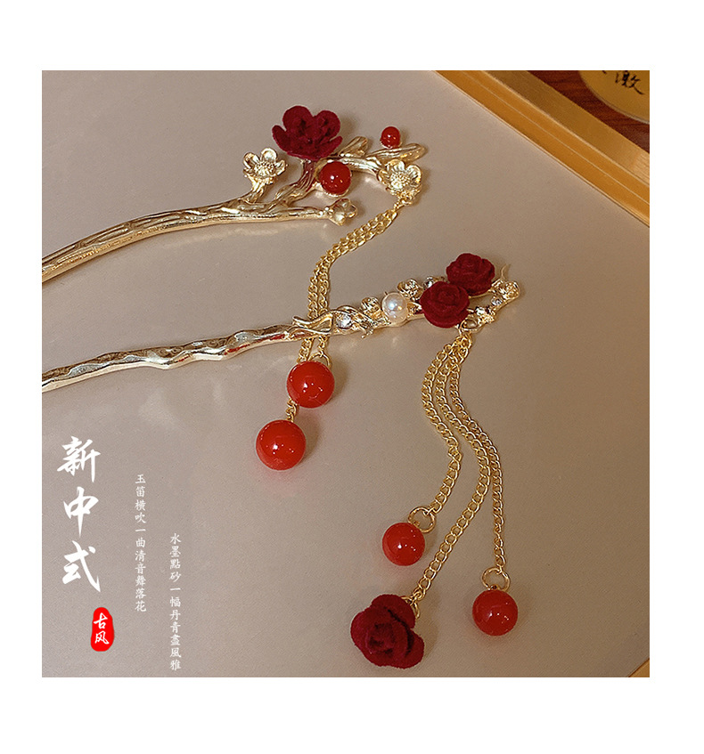 红色山茶花发簪女秋冬感后脑勺盘发发钗古风汉服头饰流苏簪子国风