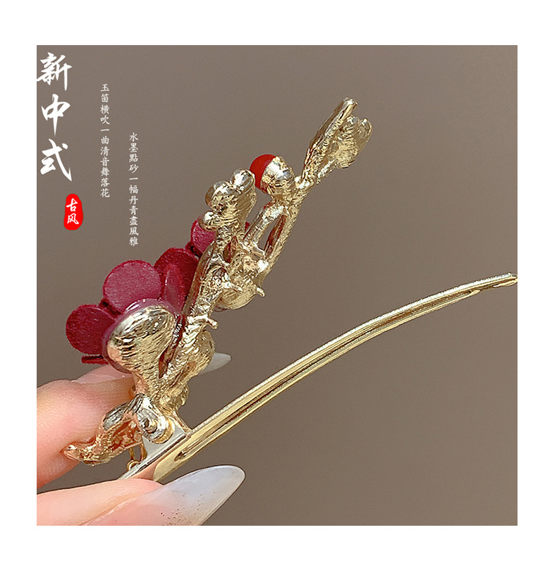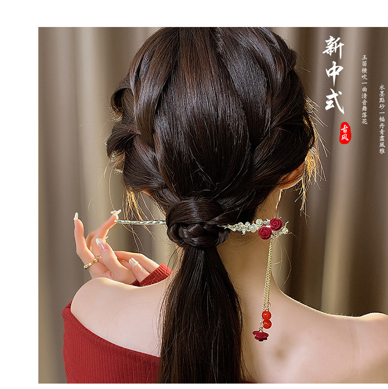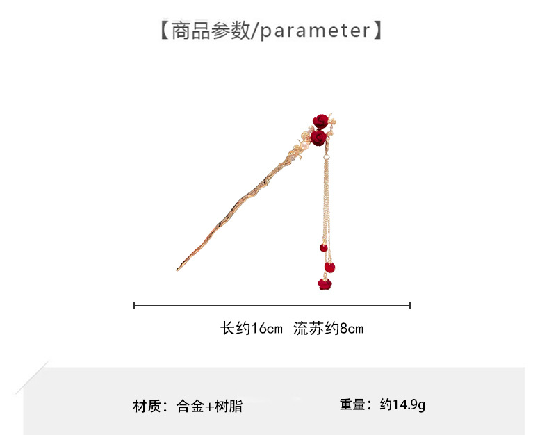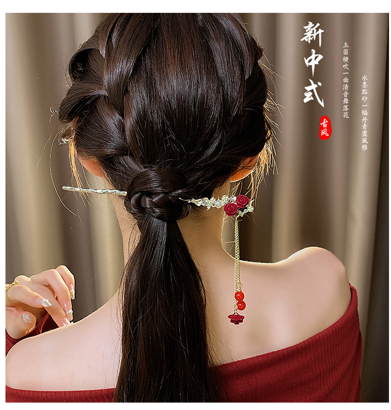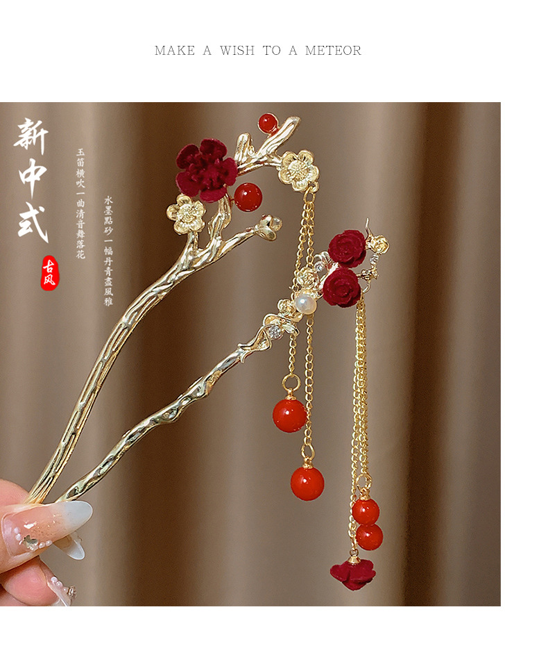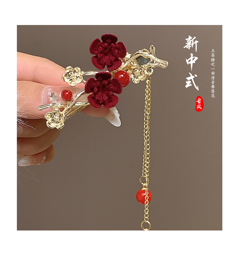 红色山茶花发簪女秋冬感后脑勺盘发发钗古风汉服头饰流苏簪子国风