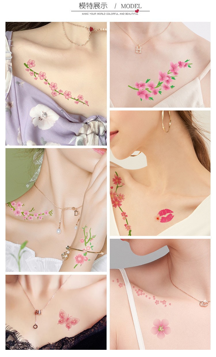 桃花纹身贴防水女古风仙女性感锁骨粉色少女花朵持久仿真刺青贴纸
