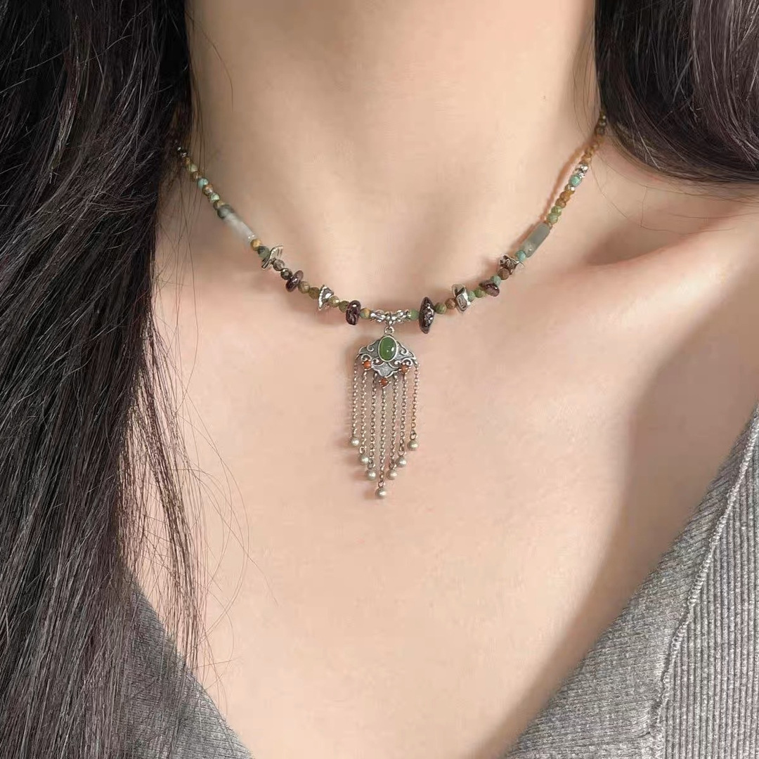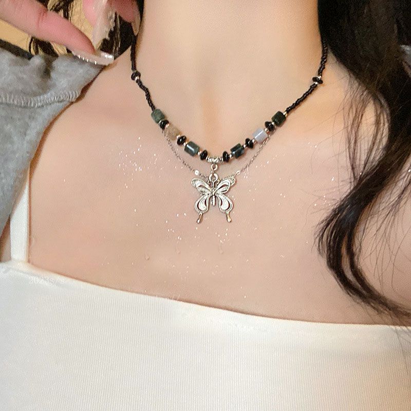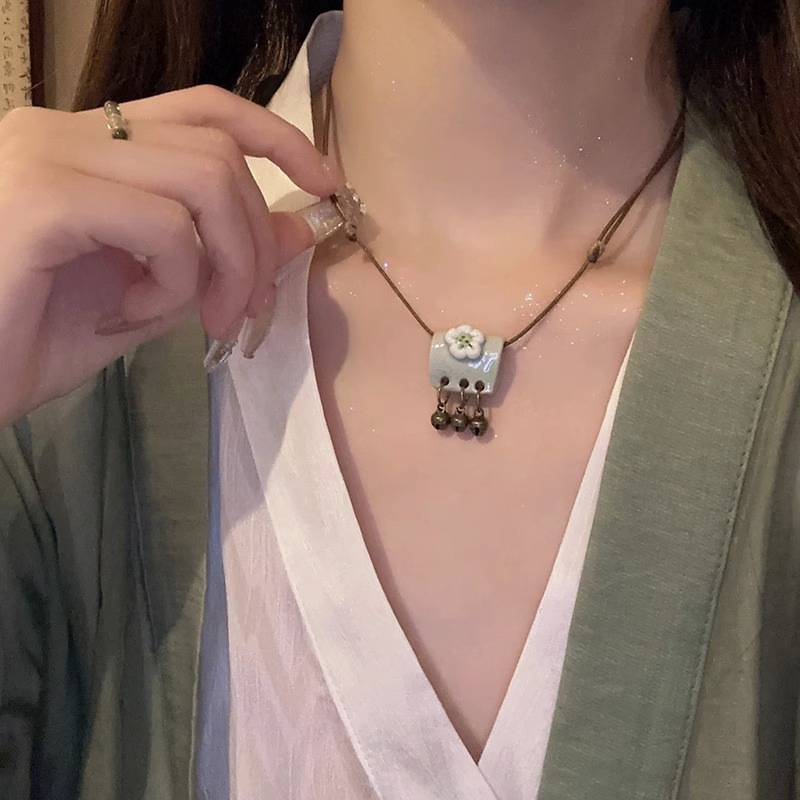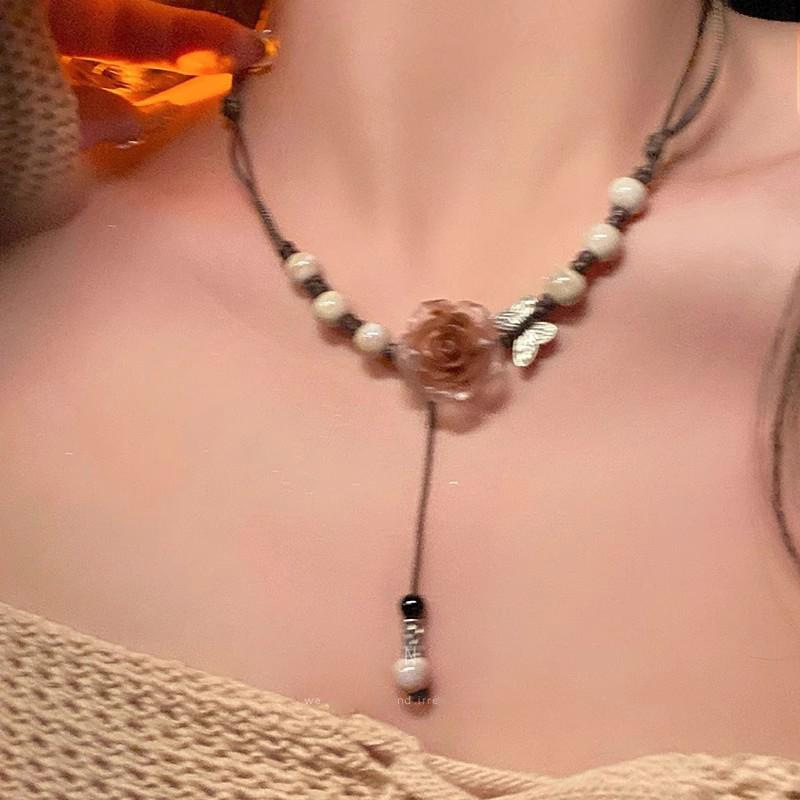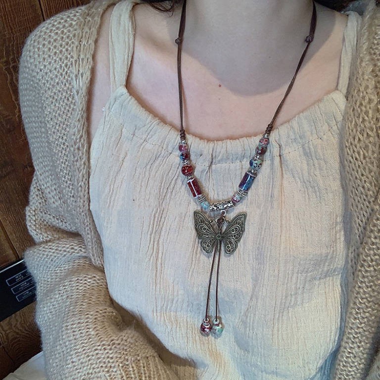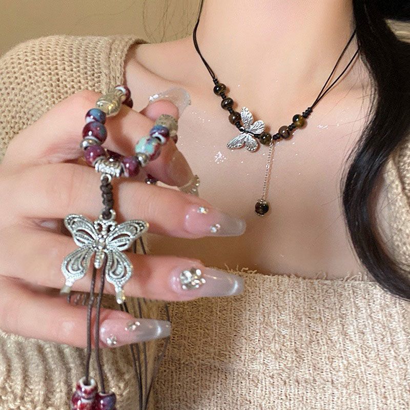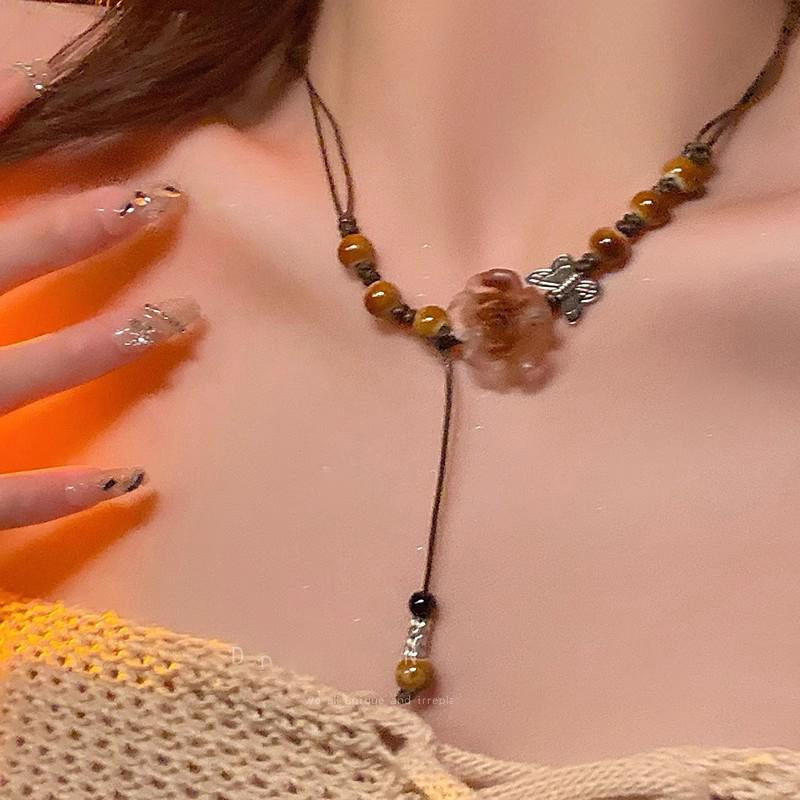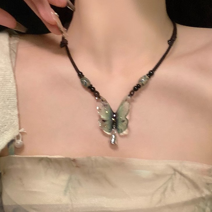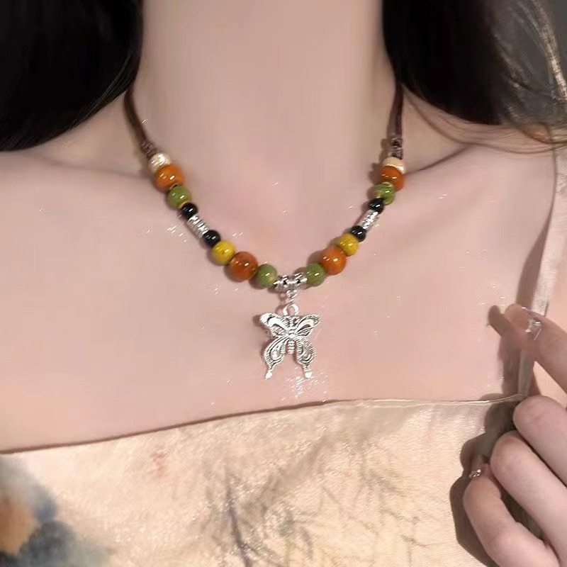 新中式陶瓷串珠蝴蝶编织绳项链女2024款民族配饰高级感锁骨链饰品