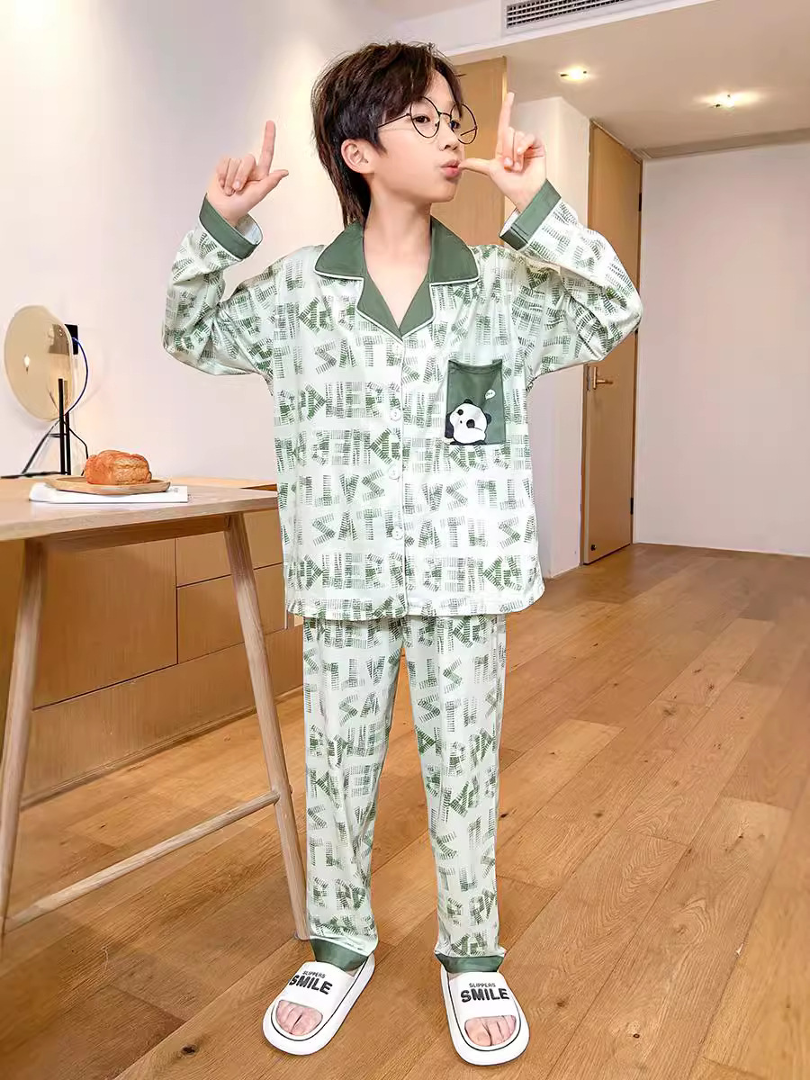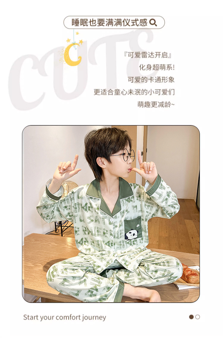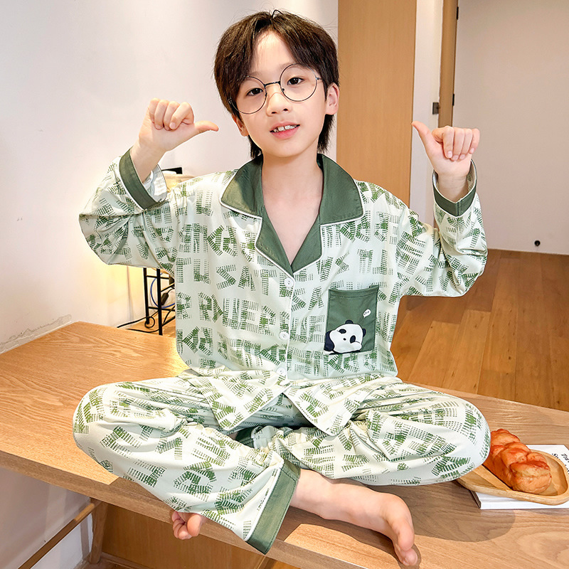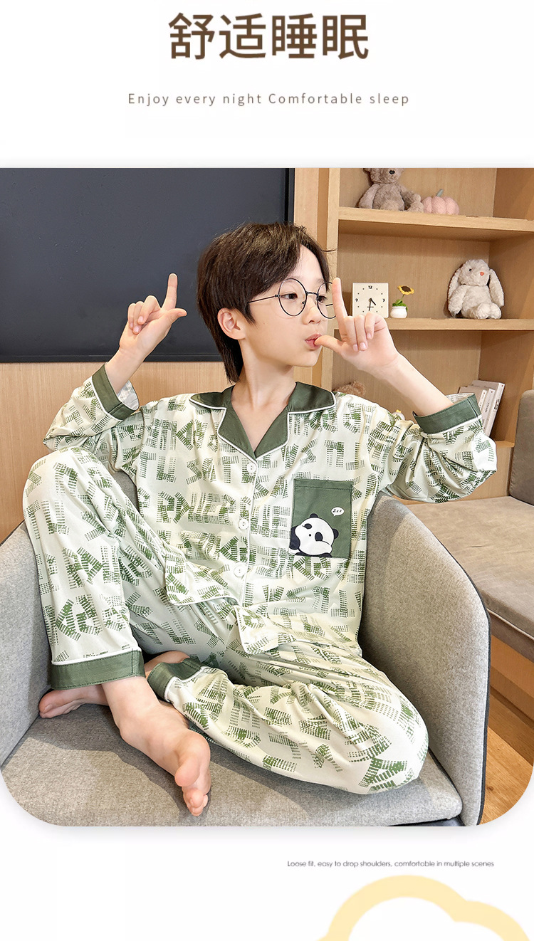 男童睡衣春秋季长袖薄款大童男孩卡通熊猫口袋儿童开衫家居服套装
