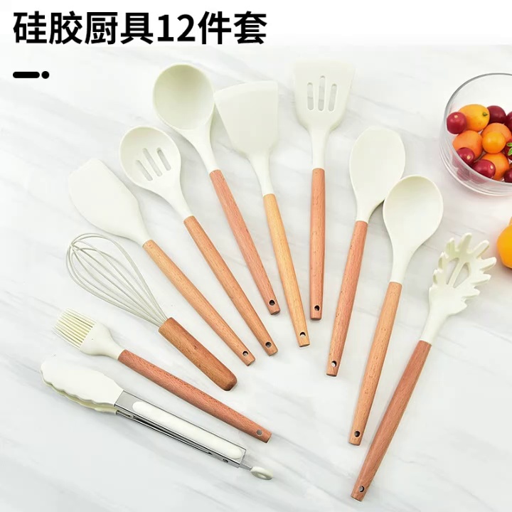 新款12件套硅胶厨具亚马逊锅铲炒菜铲汤勺白色木柄锅铲硅胶厨具 |