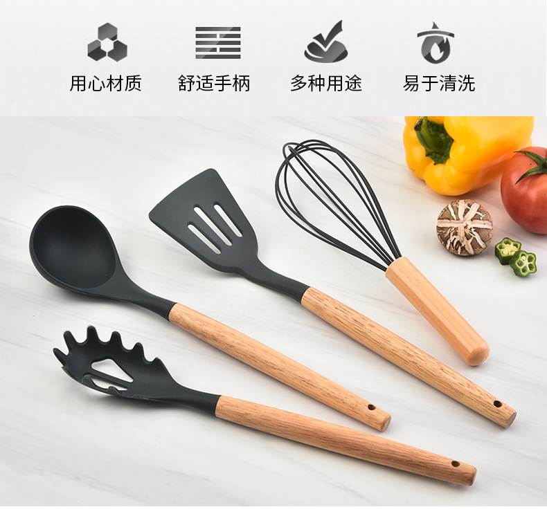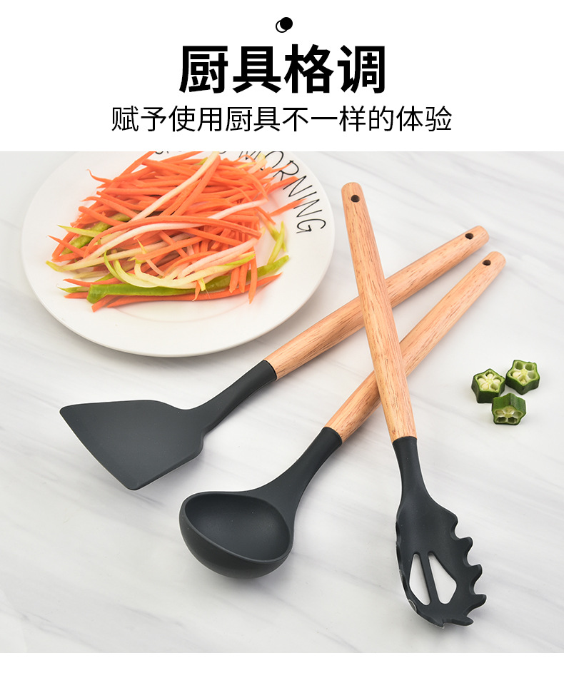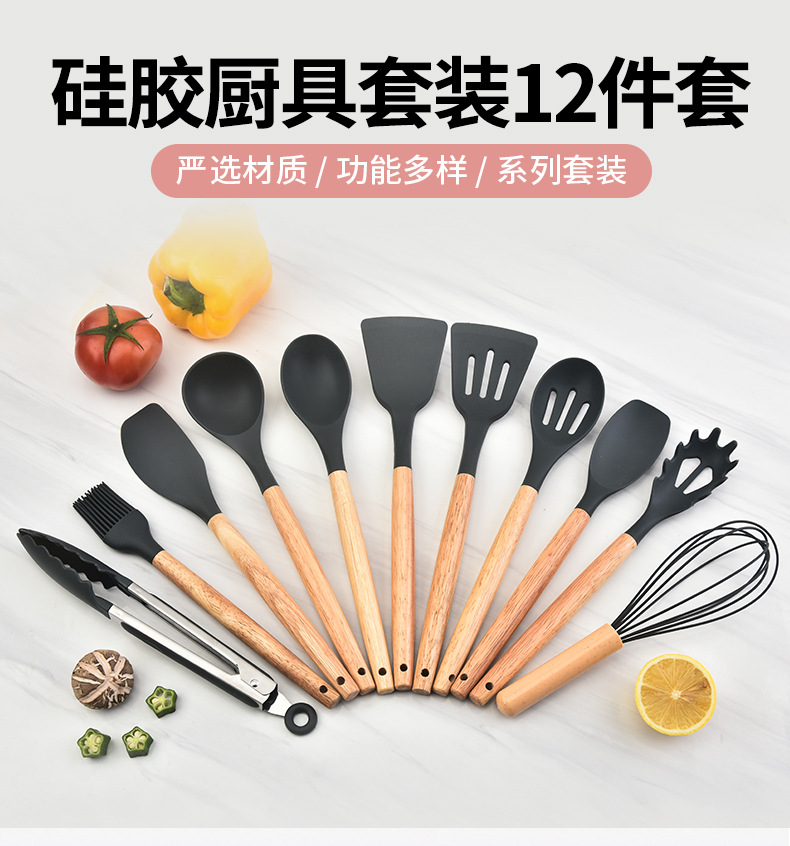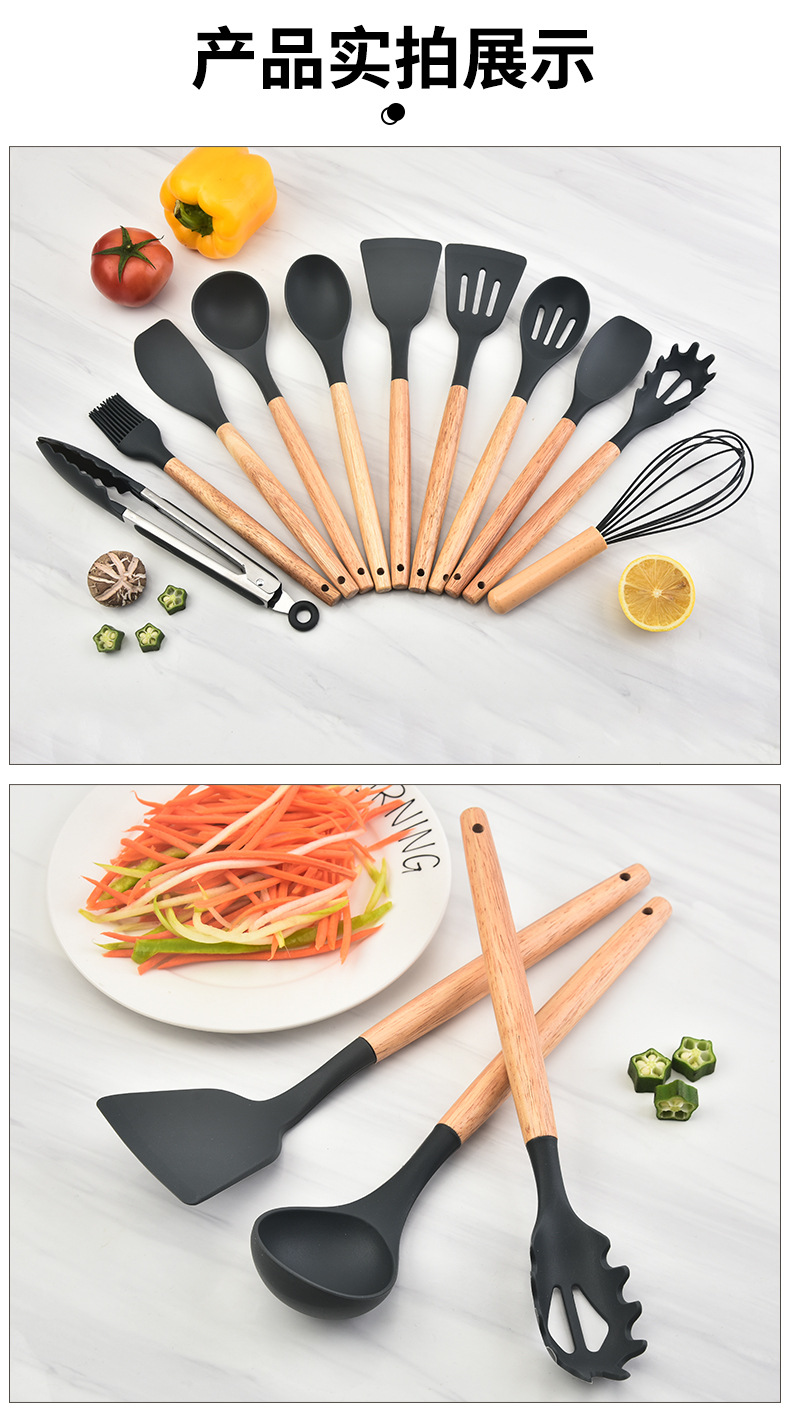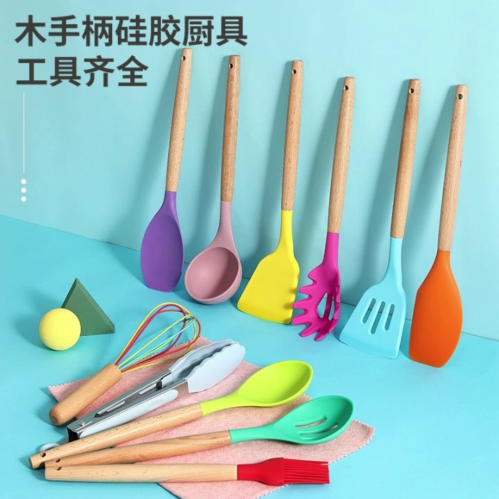木柄硅胶铲勺套装硅胶厨具12件套 烹饪铲勺硅胶厨具套装彩盒包装 |