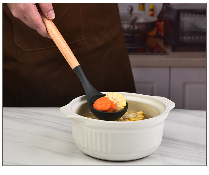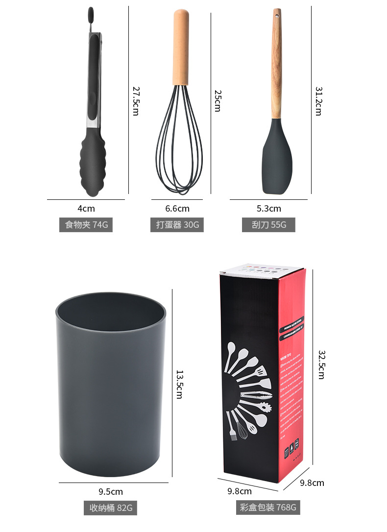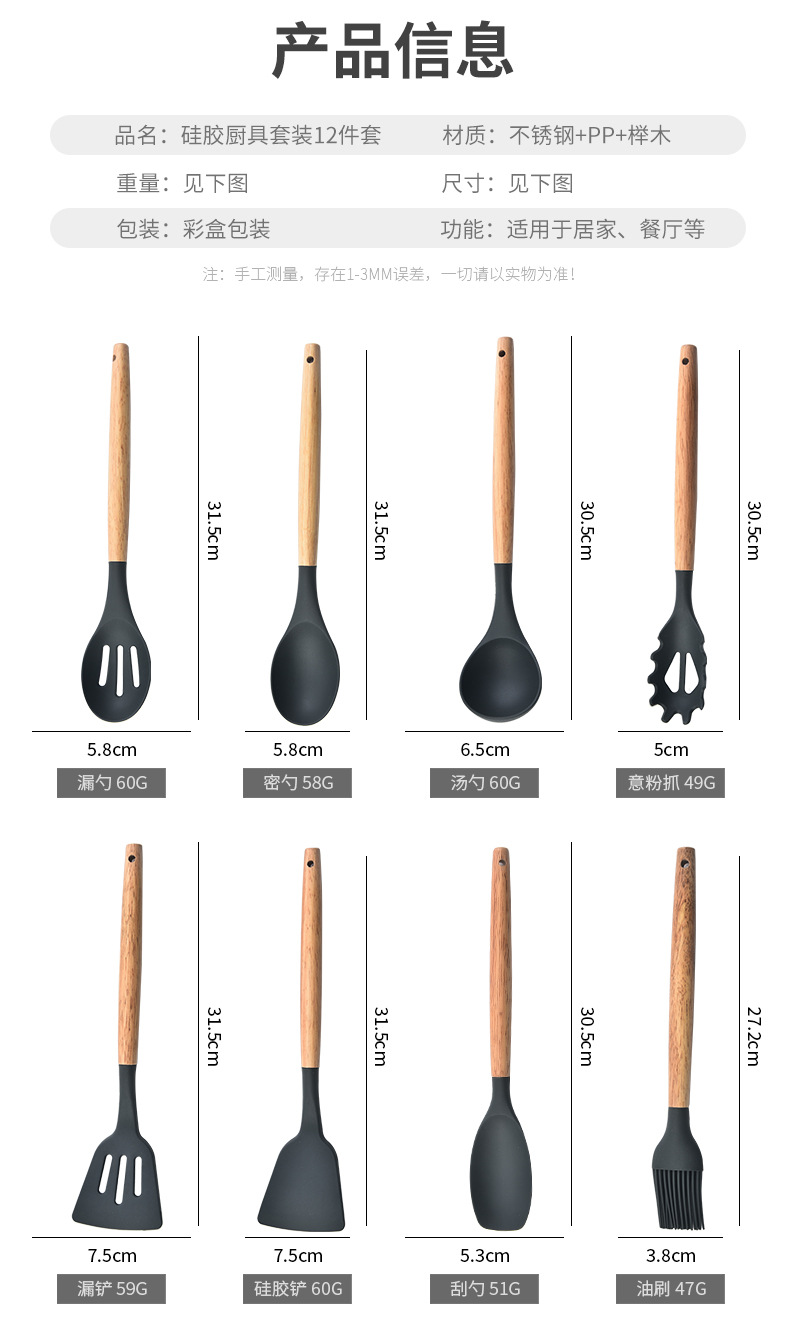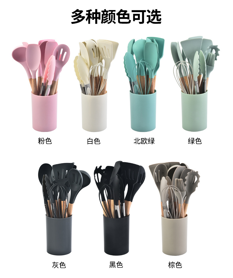 木柄硅胶铲勺套装硅胶厨具12件套 烹饪铲勺硅胶厨具套装彩盒包装 |