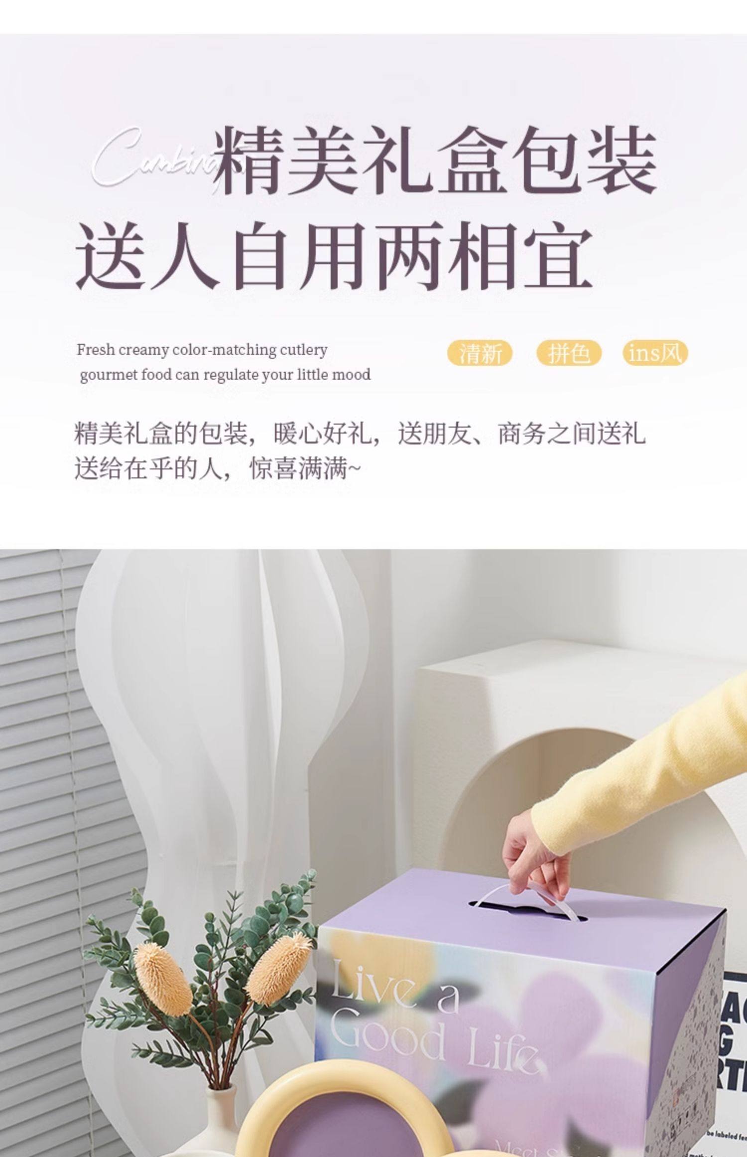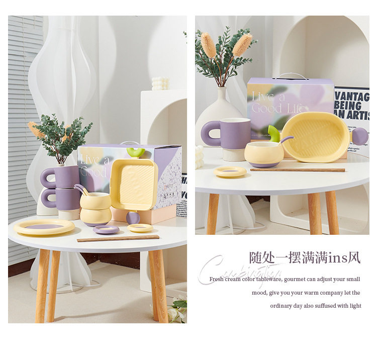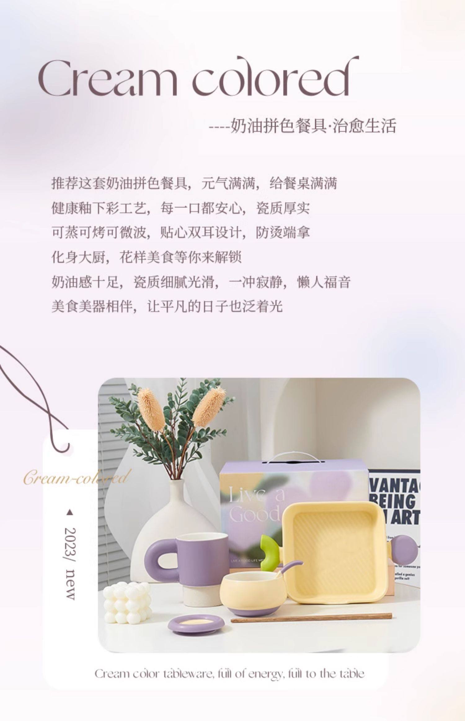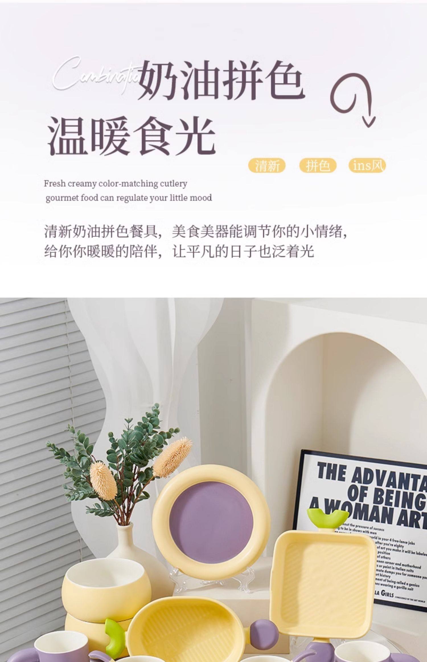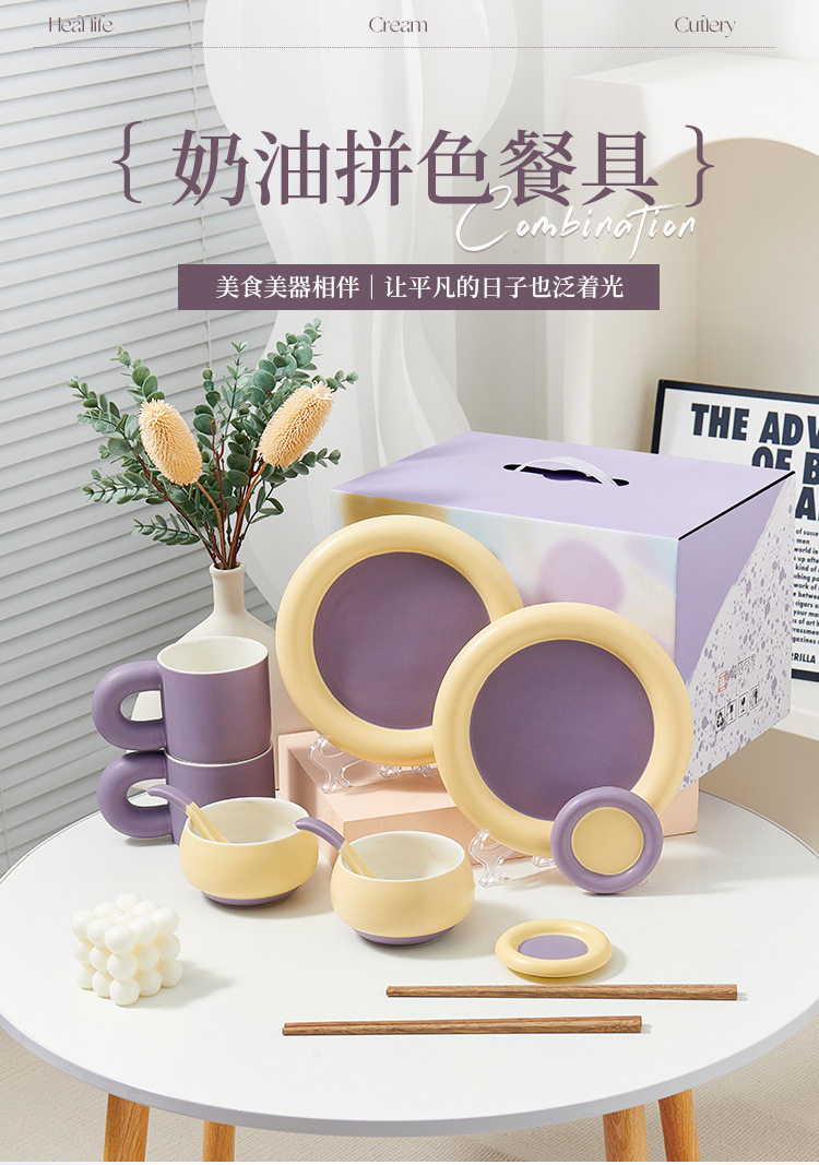 奶油拼色系列创意家用陶瓷晚盘组合高颜值碗筷碗碟简约风餐具套装
