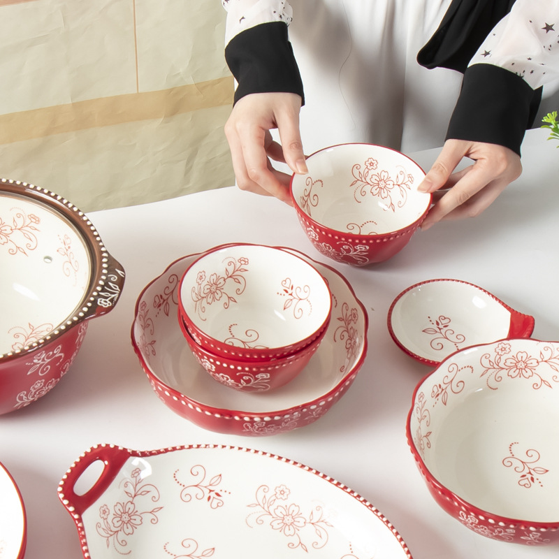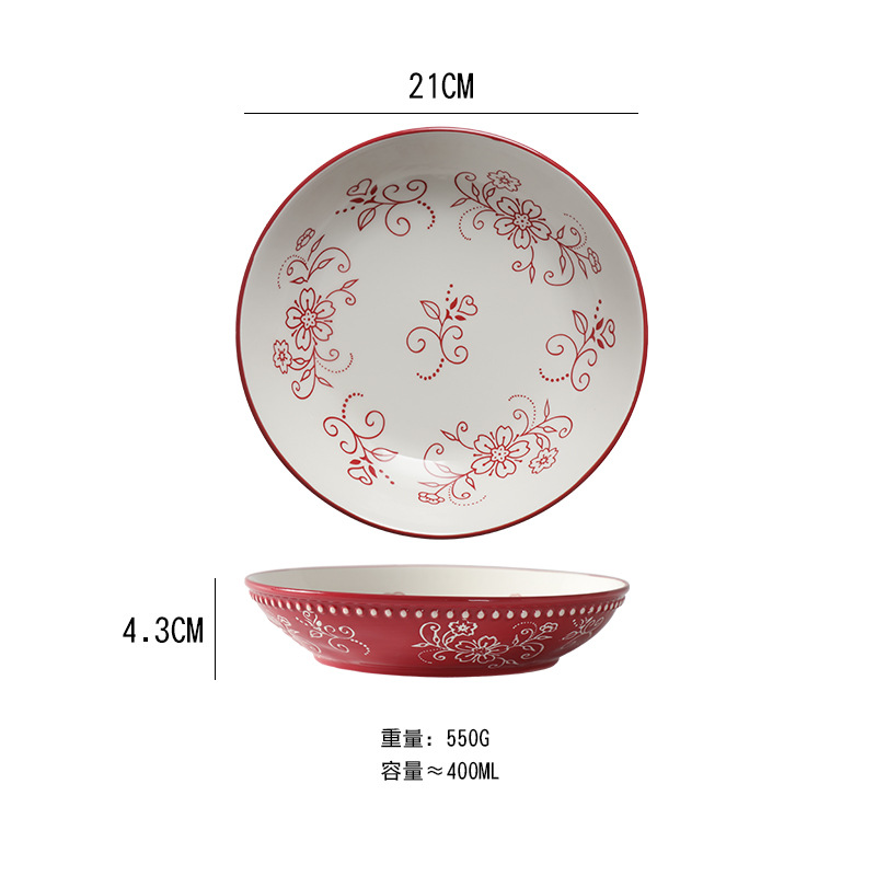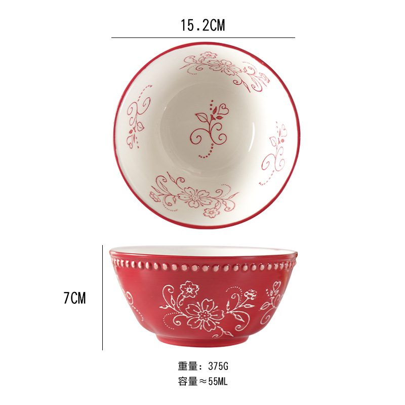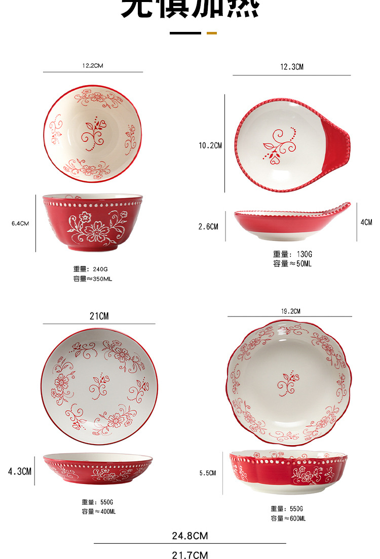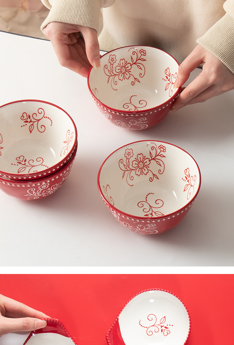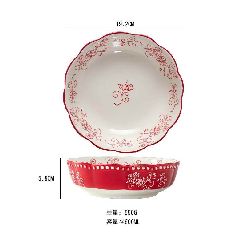 (红勾花)家用陶瓷餐具ins风米饭碗高温釉下彩花型碗高颜值圆盘