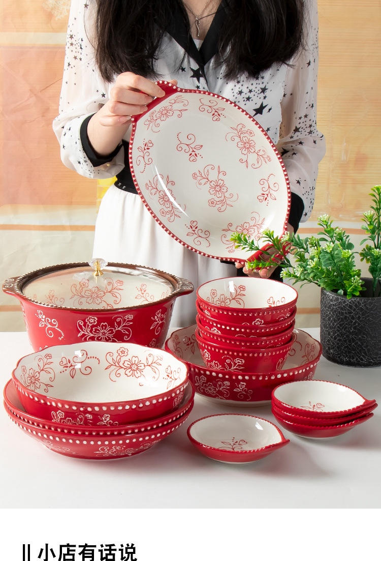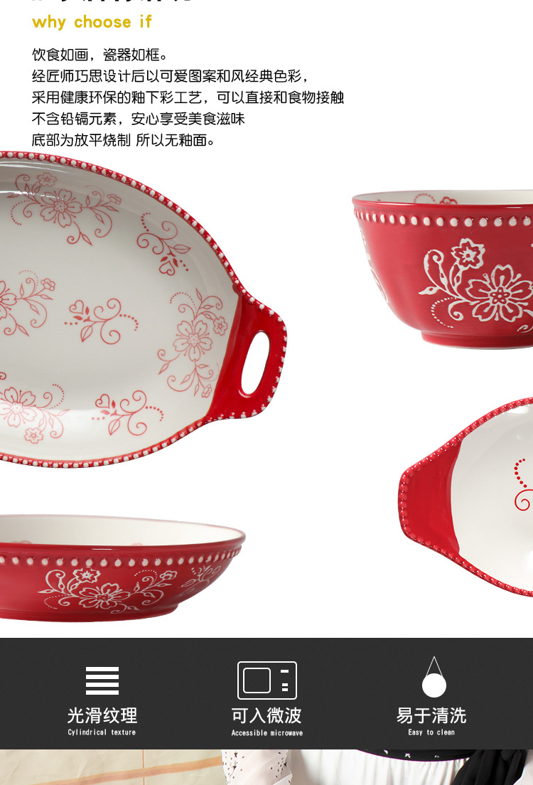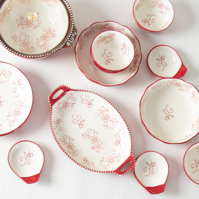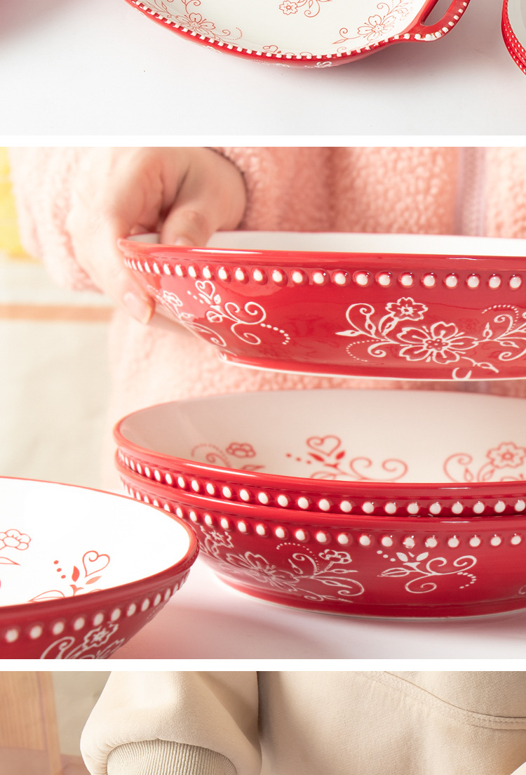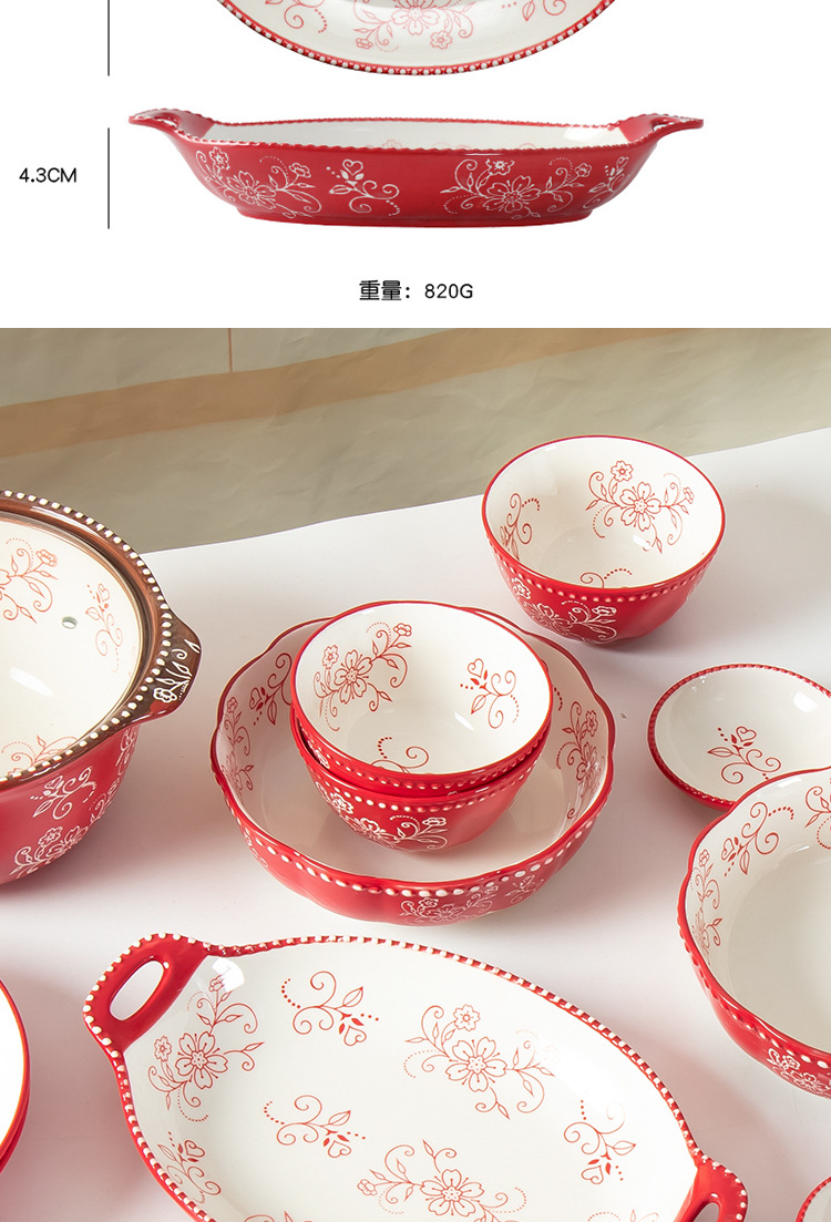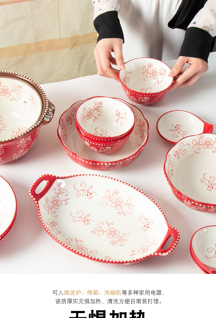 (红勾花)家用陶瓷餐具ins风米饭碗高温釉下彩花型碗高颜值圆盘