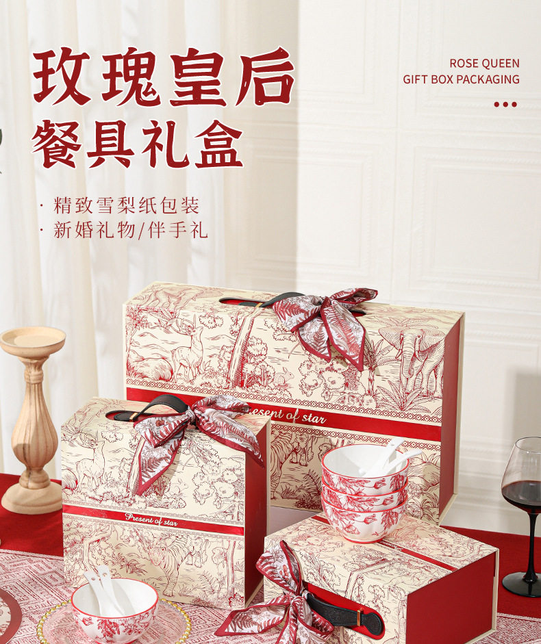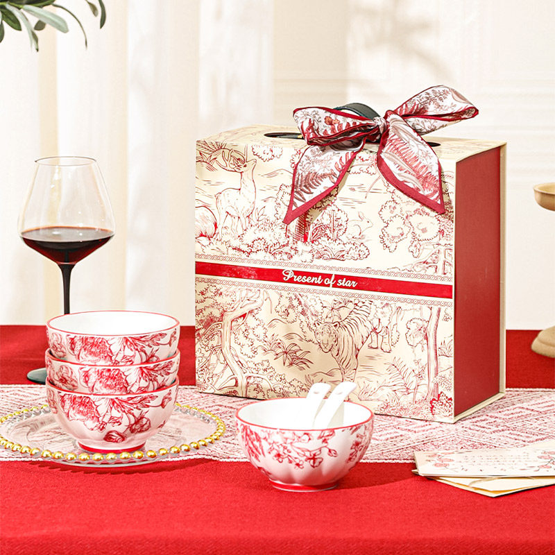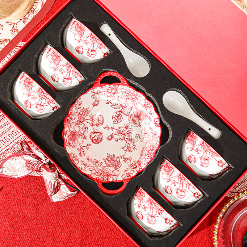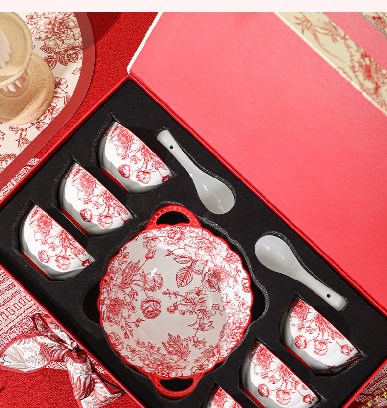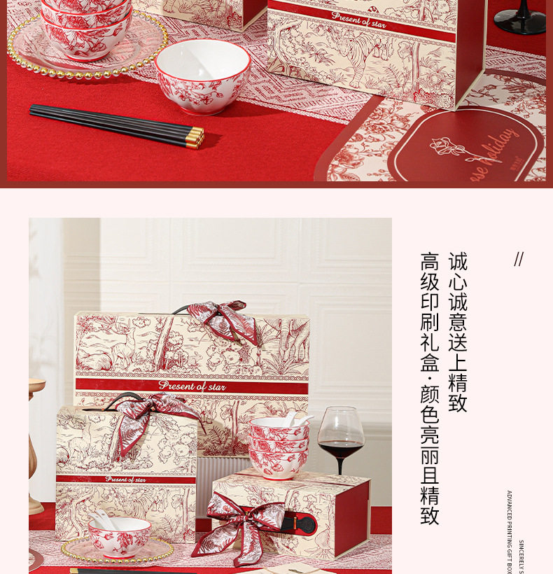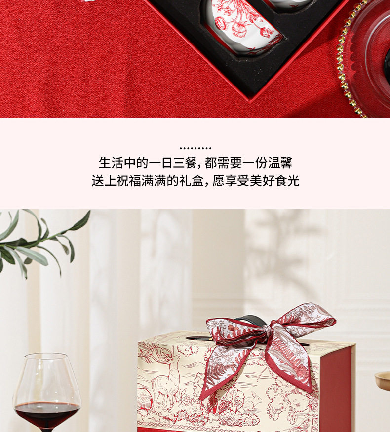 2024新款中式红色喜庆陶瓷碗盘筷勺餐具套装高档礼盒装结婚送礼品