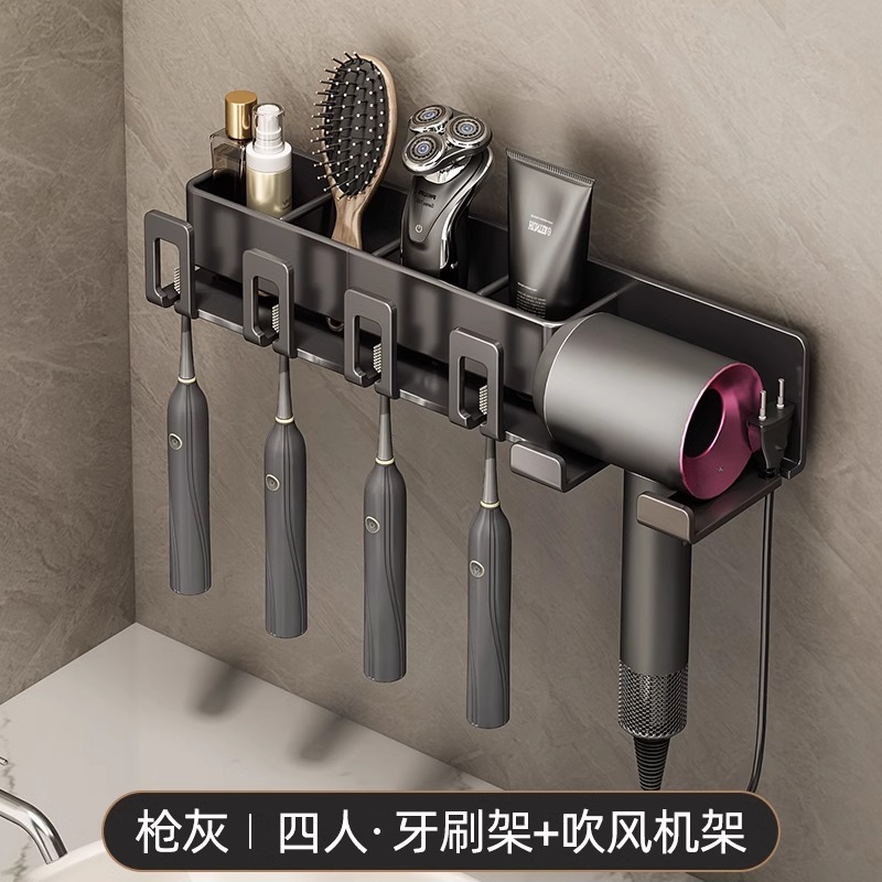 电动牙刷置物架免打孔带漱口杯浴室墙上壁挂式吹风机多功能收纳架