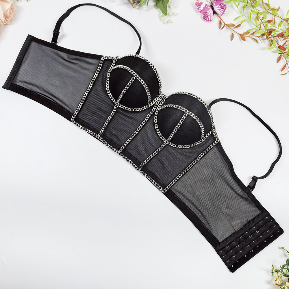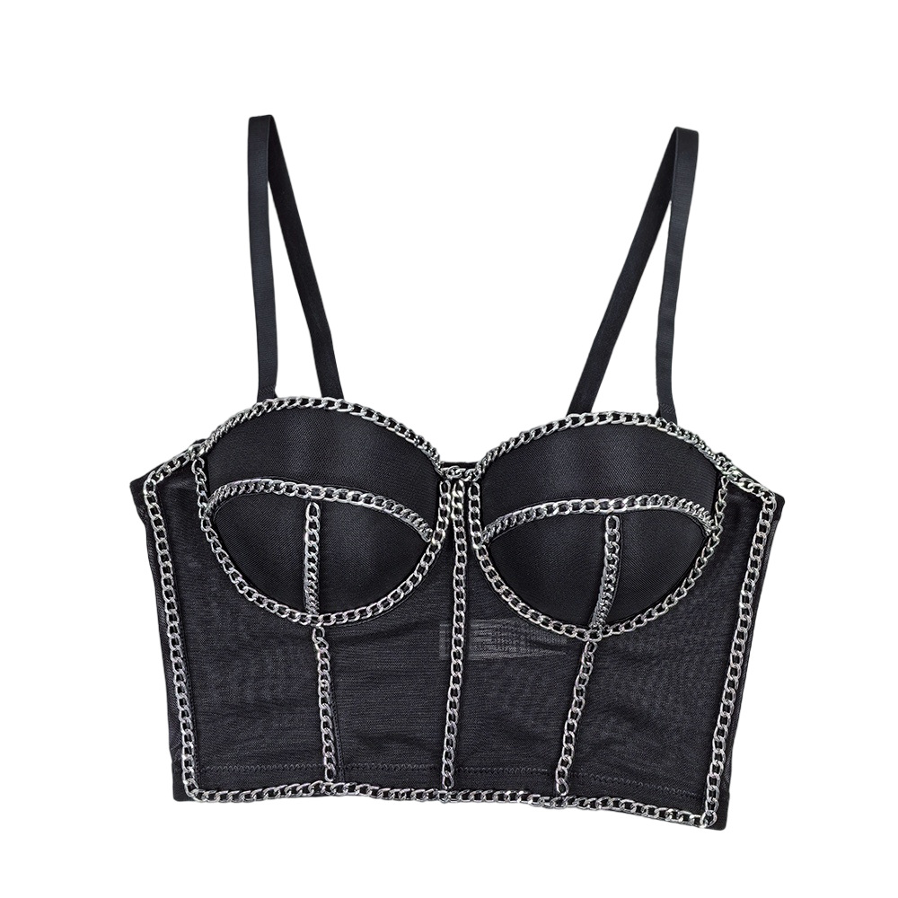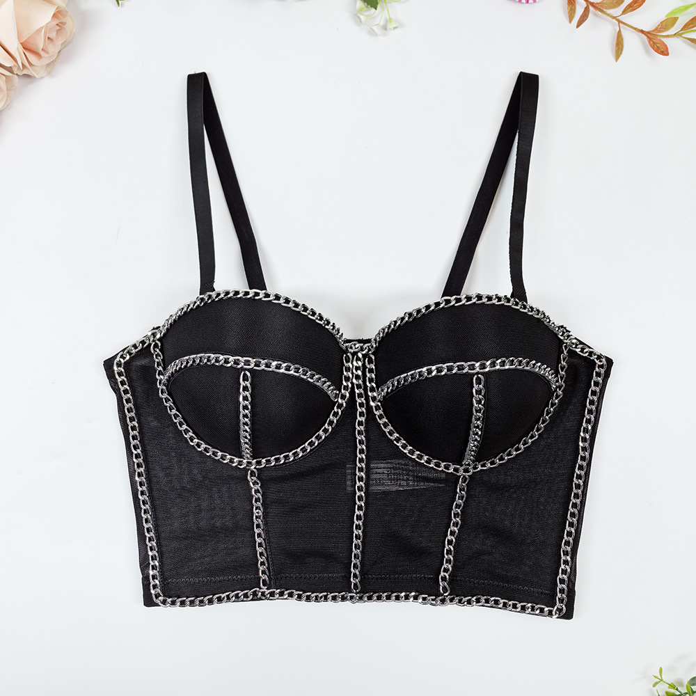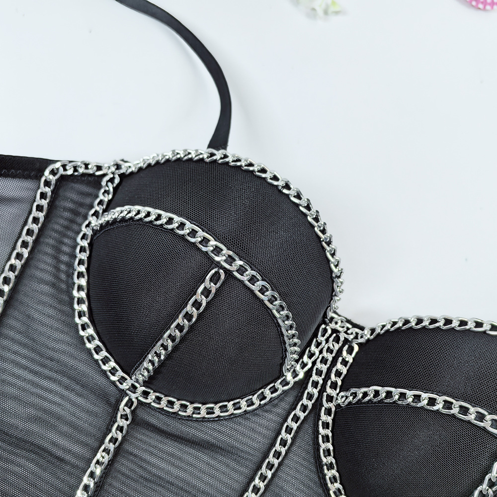 欧美跨境透气网纱抹胸外穿一体杯鱼骨内衣露背性感链条装饰吊带女