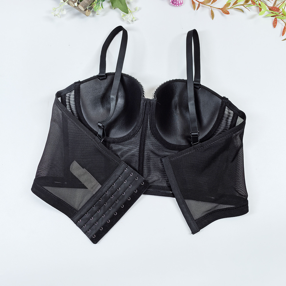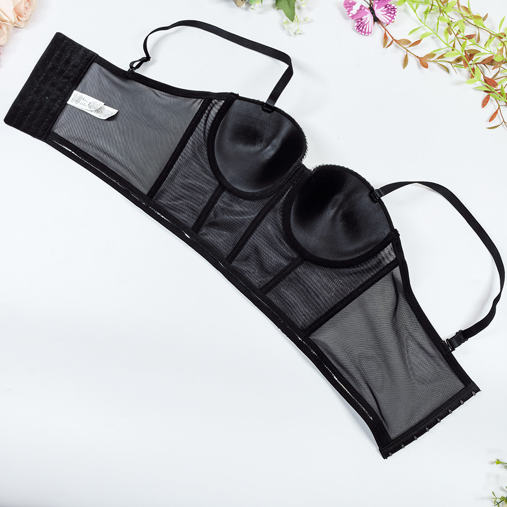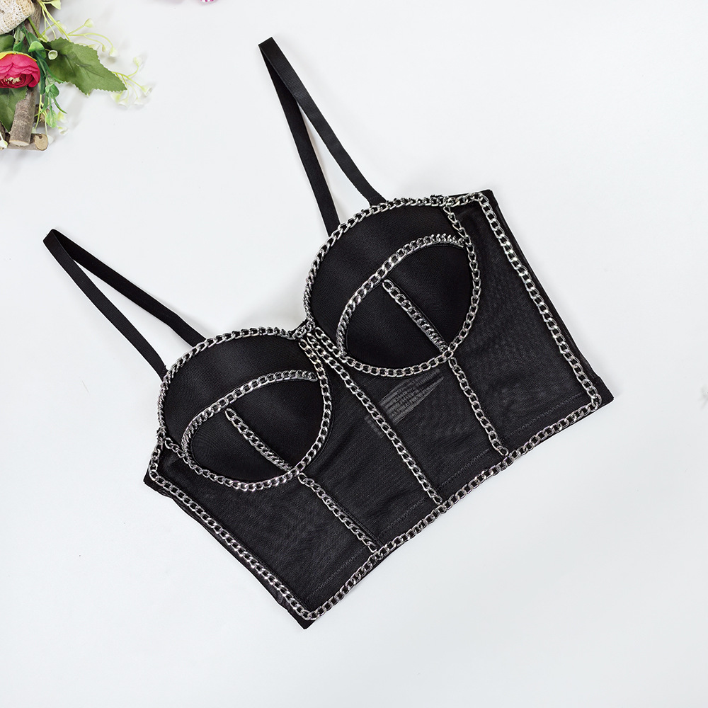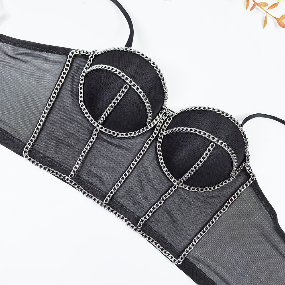 欧美跨境透气网纱抹胸外穿一体杯鱼骨内衣露背性感链条装饰吊带女