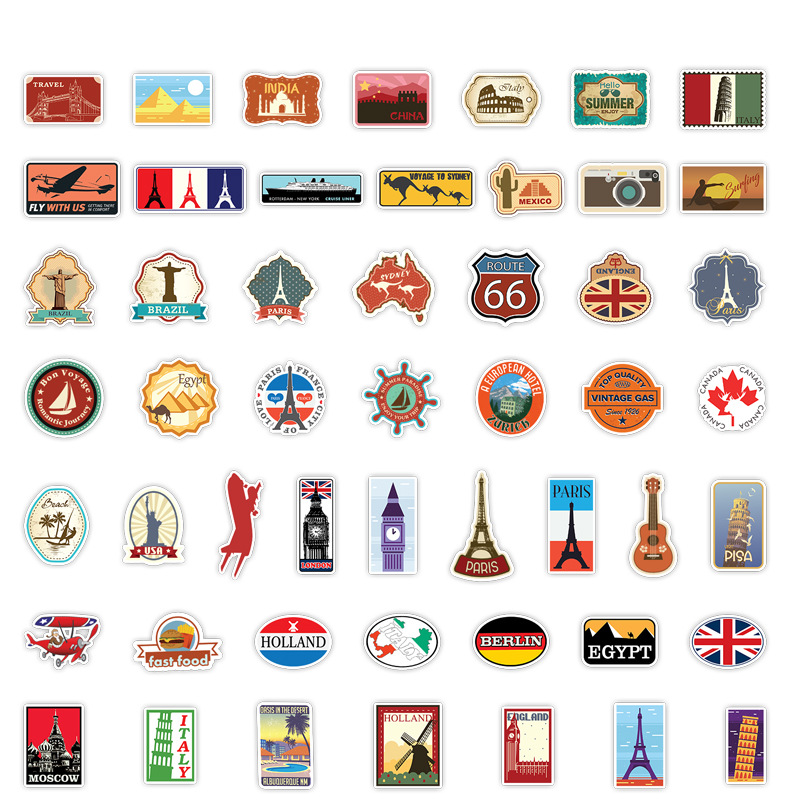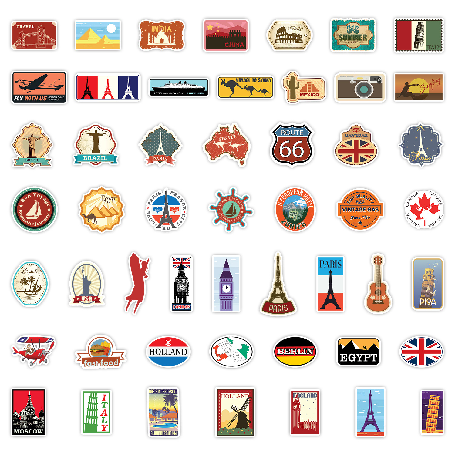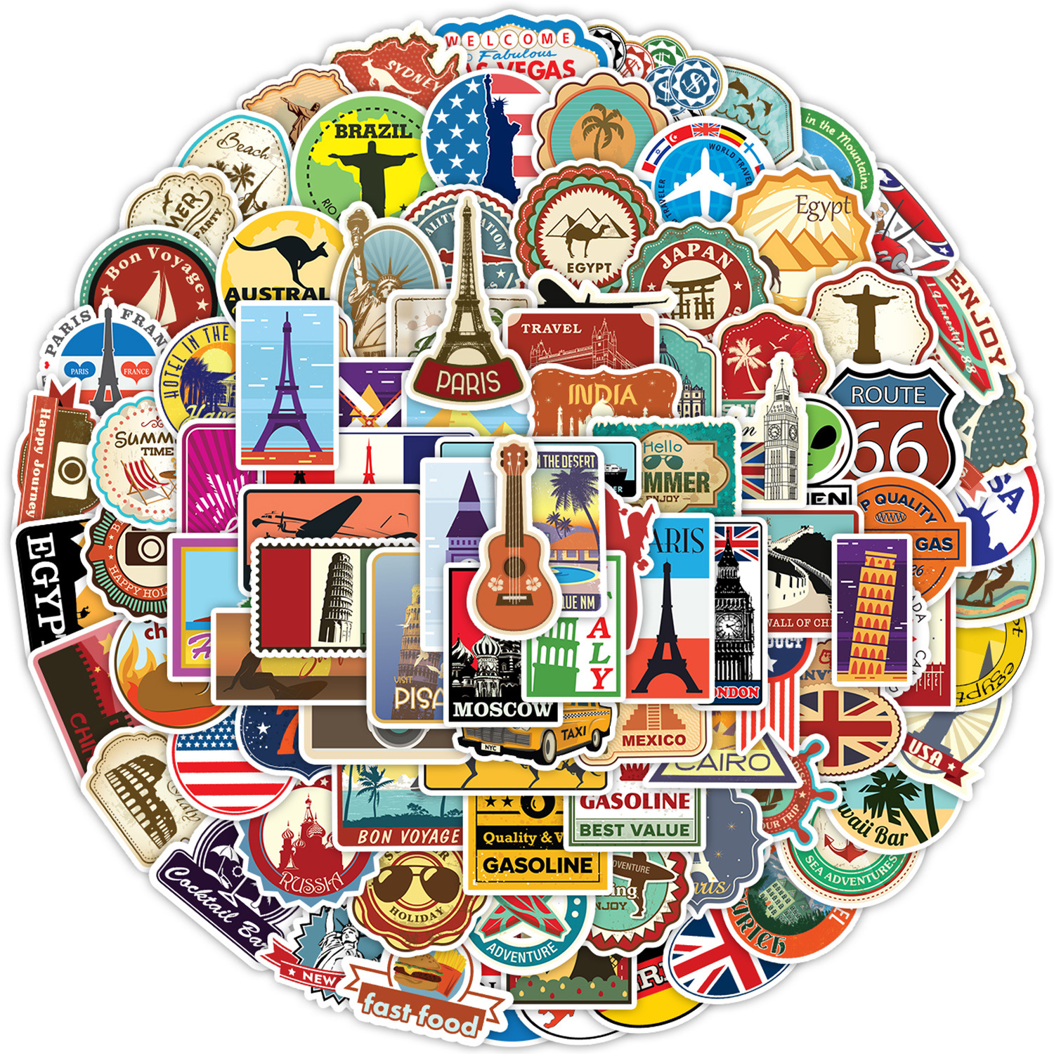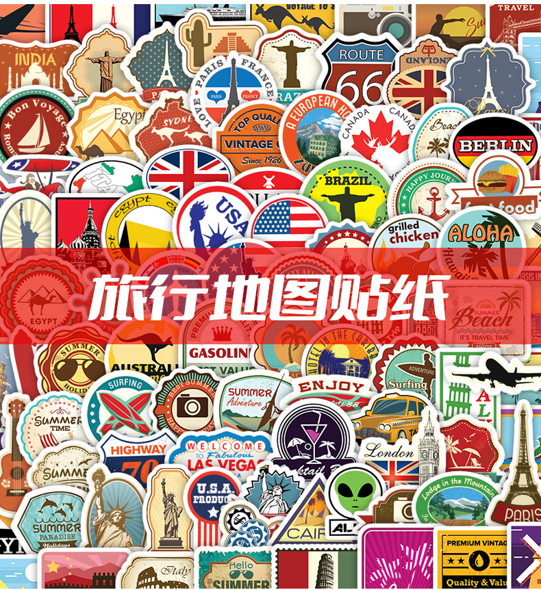 100张不重复旅行地图涂鸦贴纸旅行箱手机汽车滑板装饰贴画防水