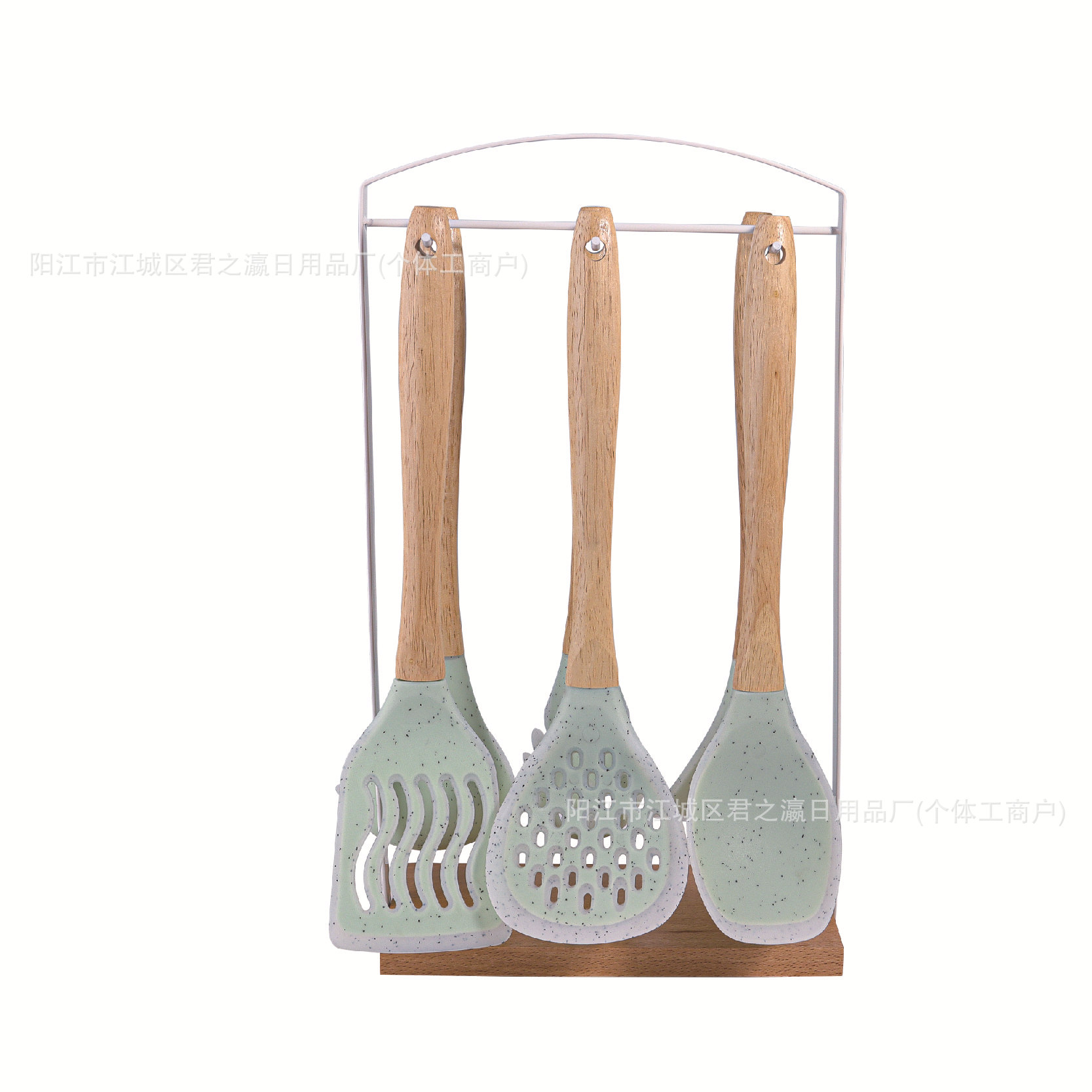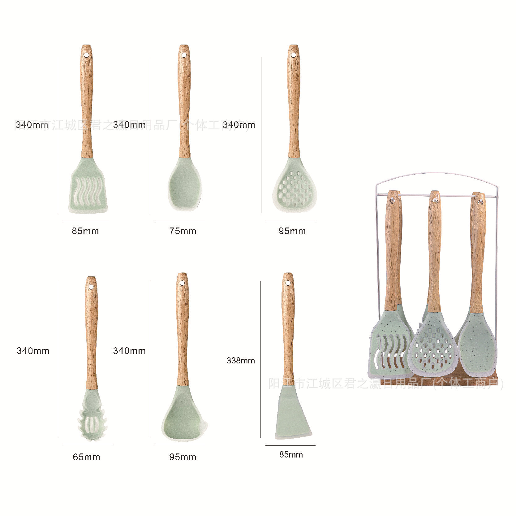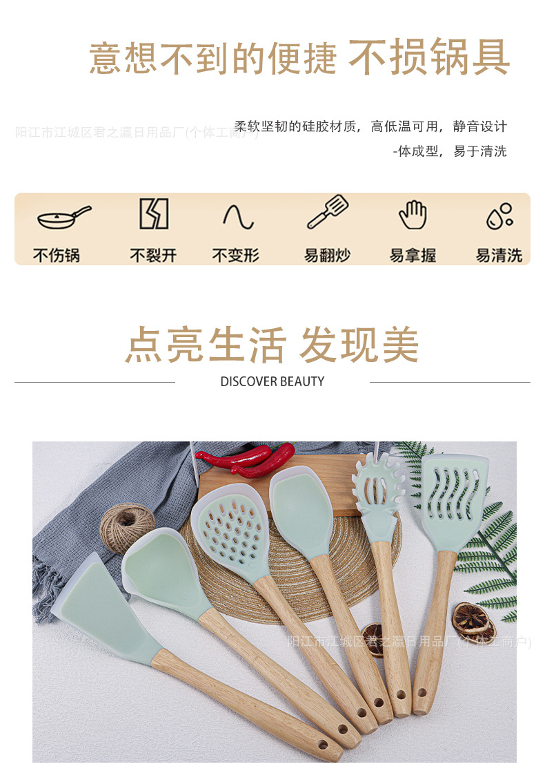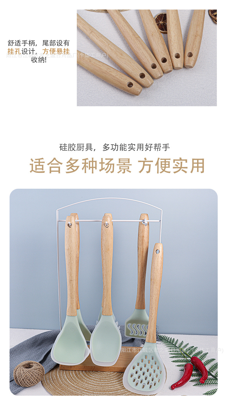 跨境木柄硅胶厨具七套装厨房用品锅铲汤勺收纳架漏勺面捞铲勺套装