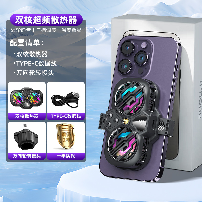 2024新款三档风速可开关RGB灯效双涡轮半导体数显直播手机散热器