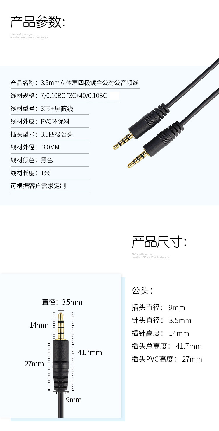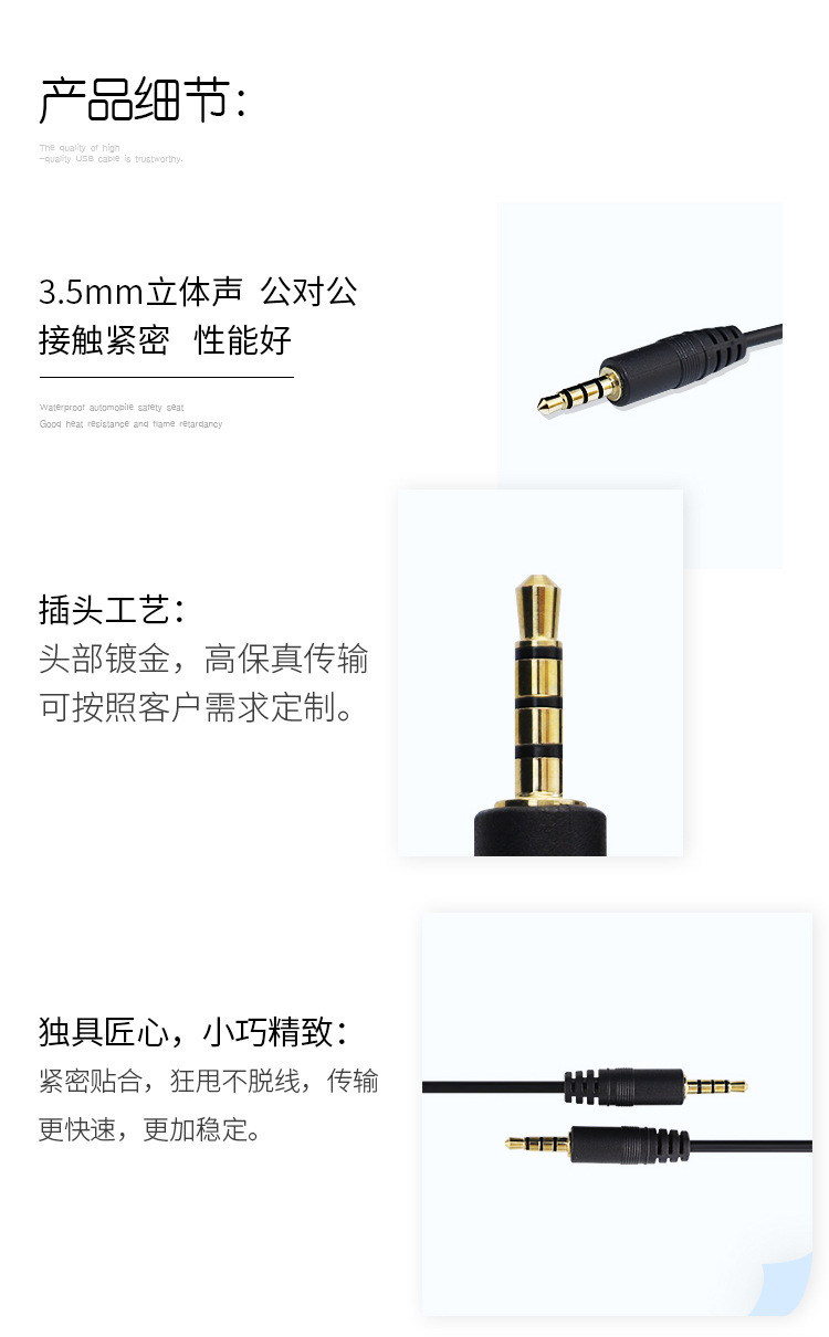 批发3.5MM立体声带屏蔽音频线3.5mm公头对公头四节镀金耳机连接线