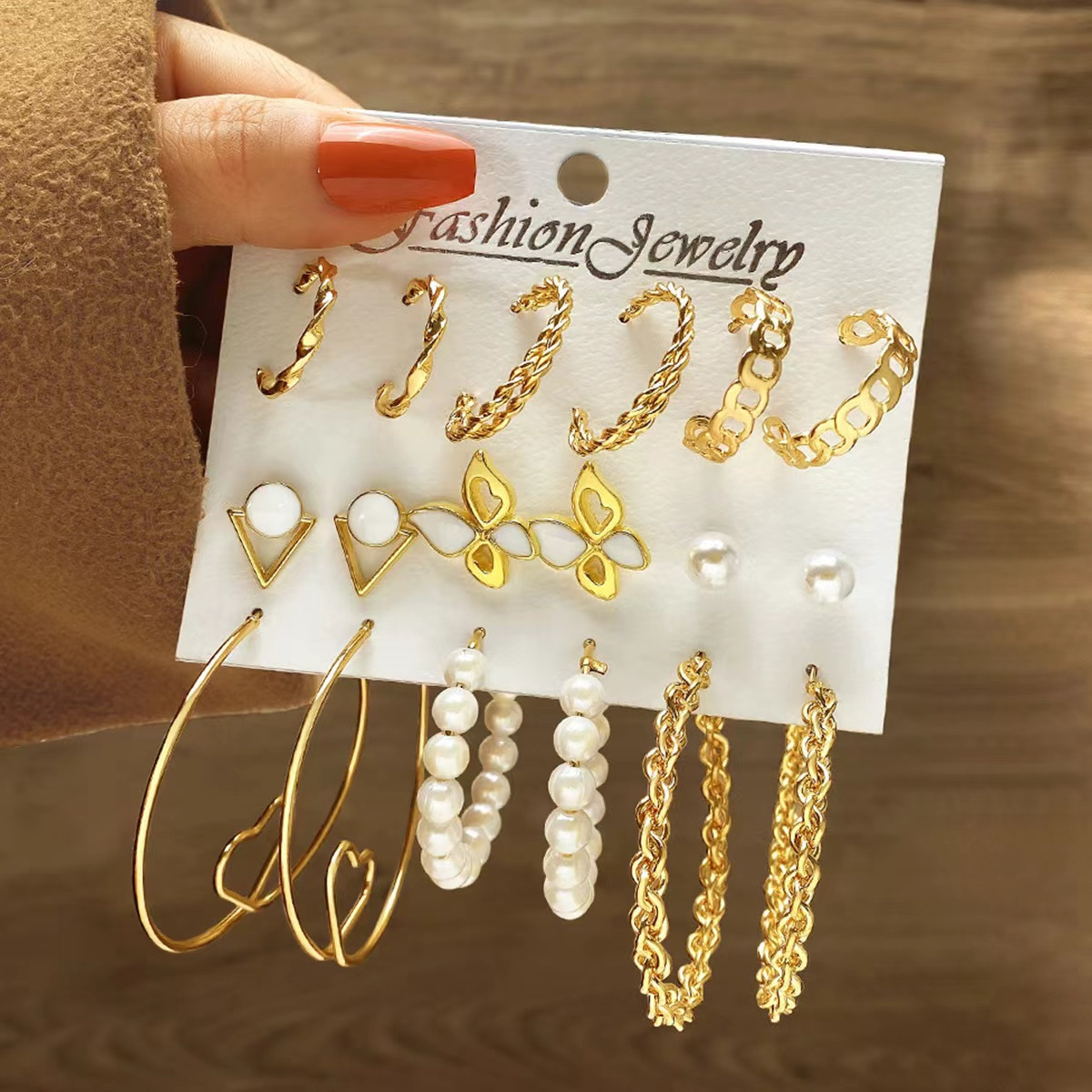 欧美跨境镶嵌珍珠女卡装耳环 创意法式复古金色耳圈套装6件套
