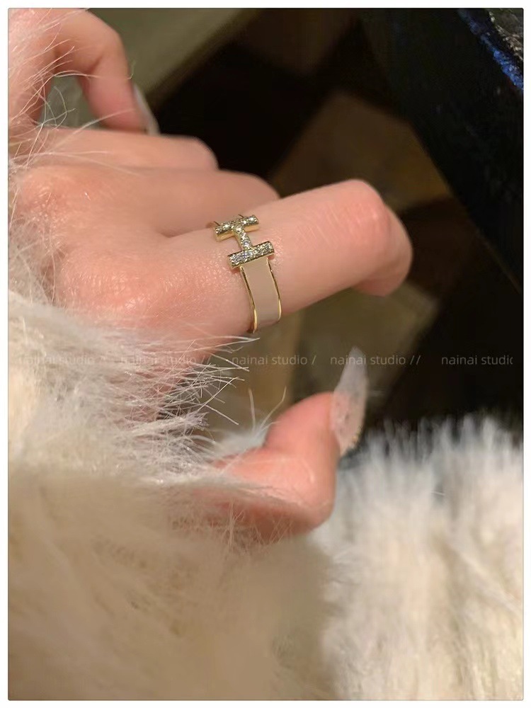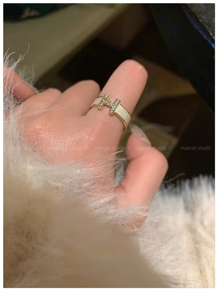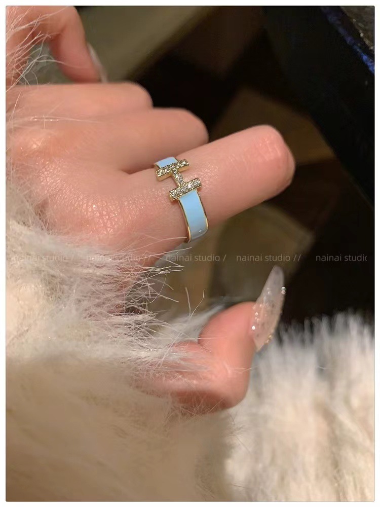 字母H戒指女ins小众设计珐琅锆石高级感食指戒法式网红开口指环