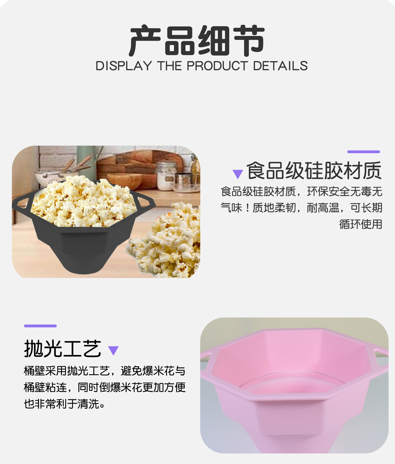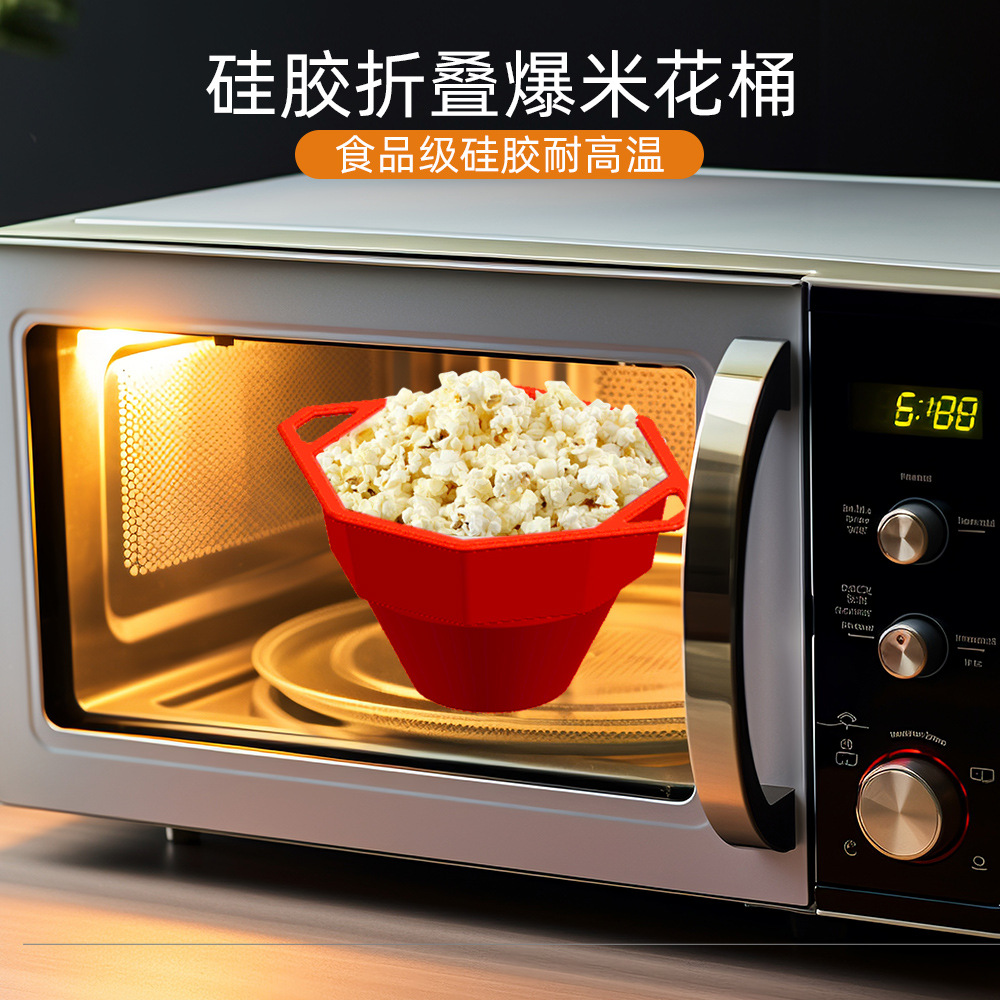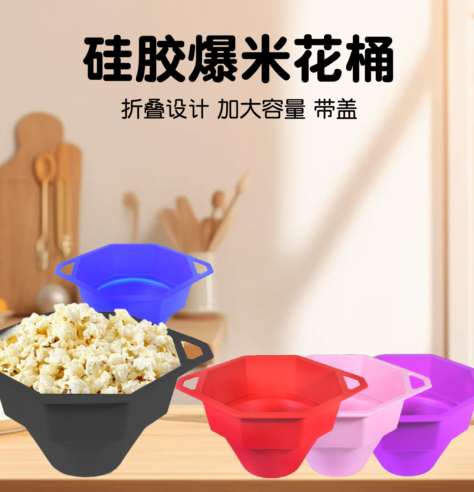 亚马逊新品食品级硅胶爆米花碗耐高温可折叠微波炉爆米花桶带盖子