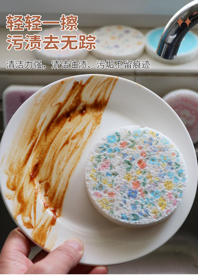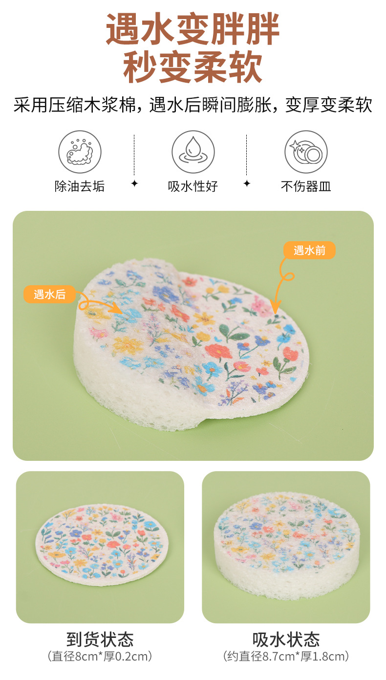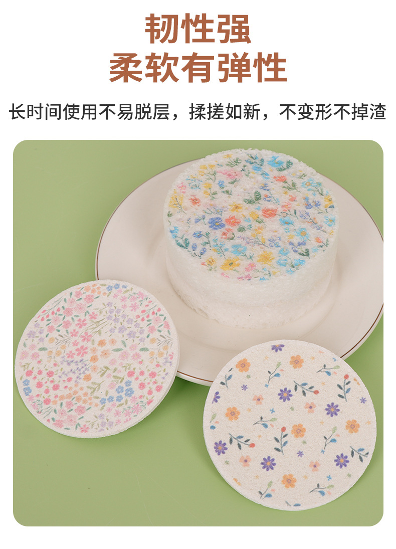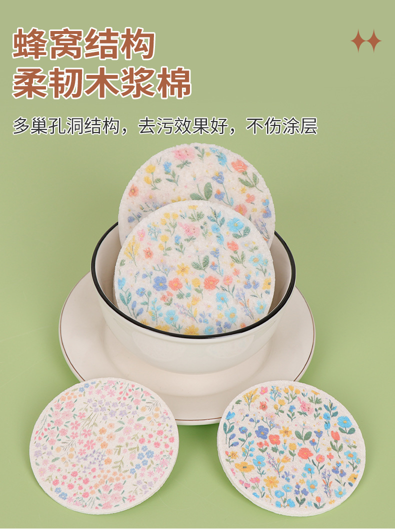 圆形花朵木浆棉海绵擦厨房抹布洗碗棉不沾油吸水压缩木桨海棉工厂