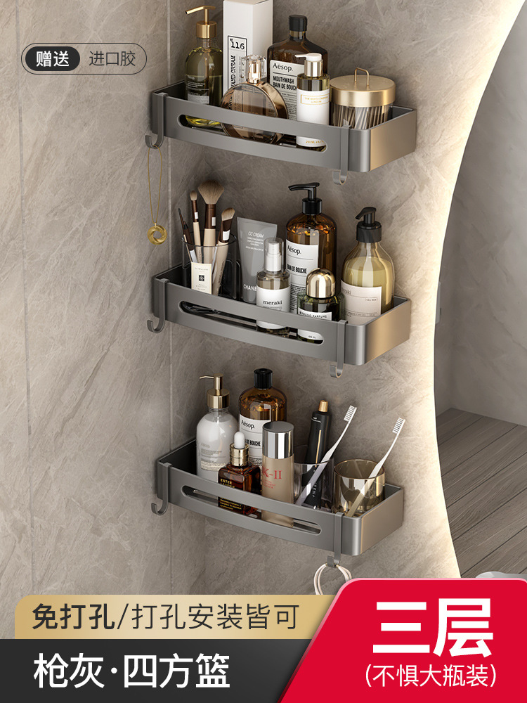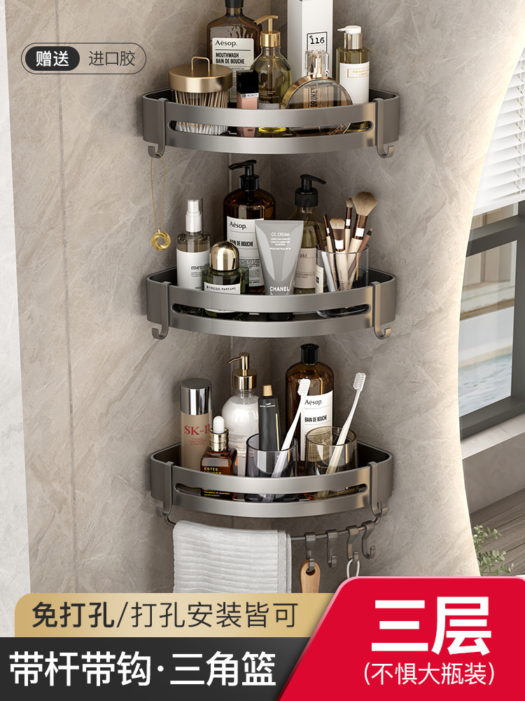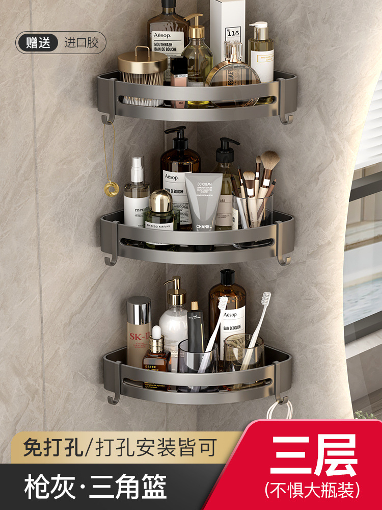 免打孔枪灰浴室置物架双层三角壁挂卫生间太空铝厕所转角卫浴收纳