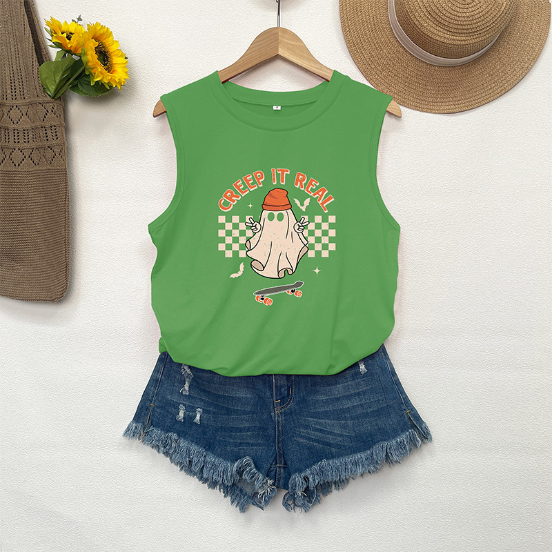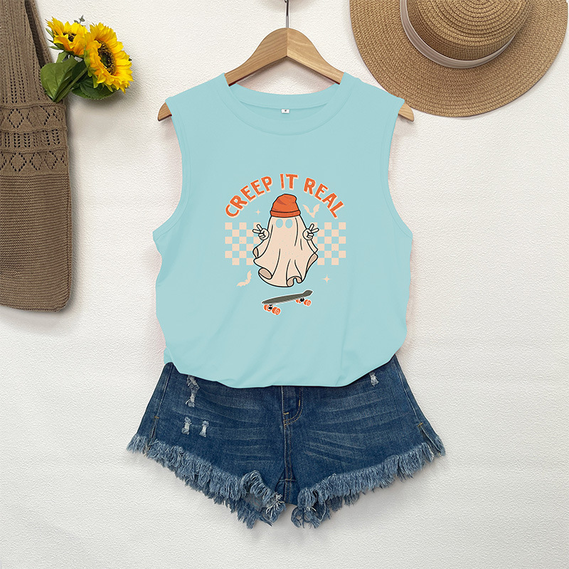 跨境女装热转印小幽灵印花圆领背心上衣现货 无袖夏季t恤休闲外贸