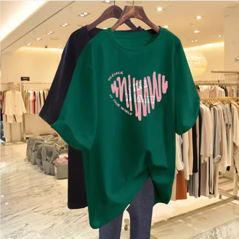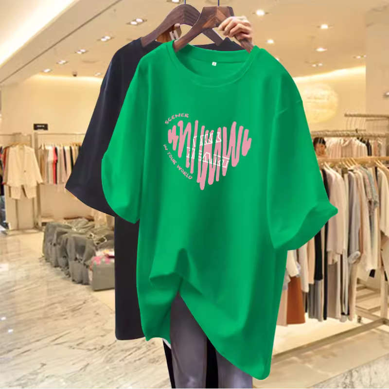 粉色t恤女夏季纯棉短袖2024新款爱心中长款上衣宽松欧货半袖体恤