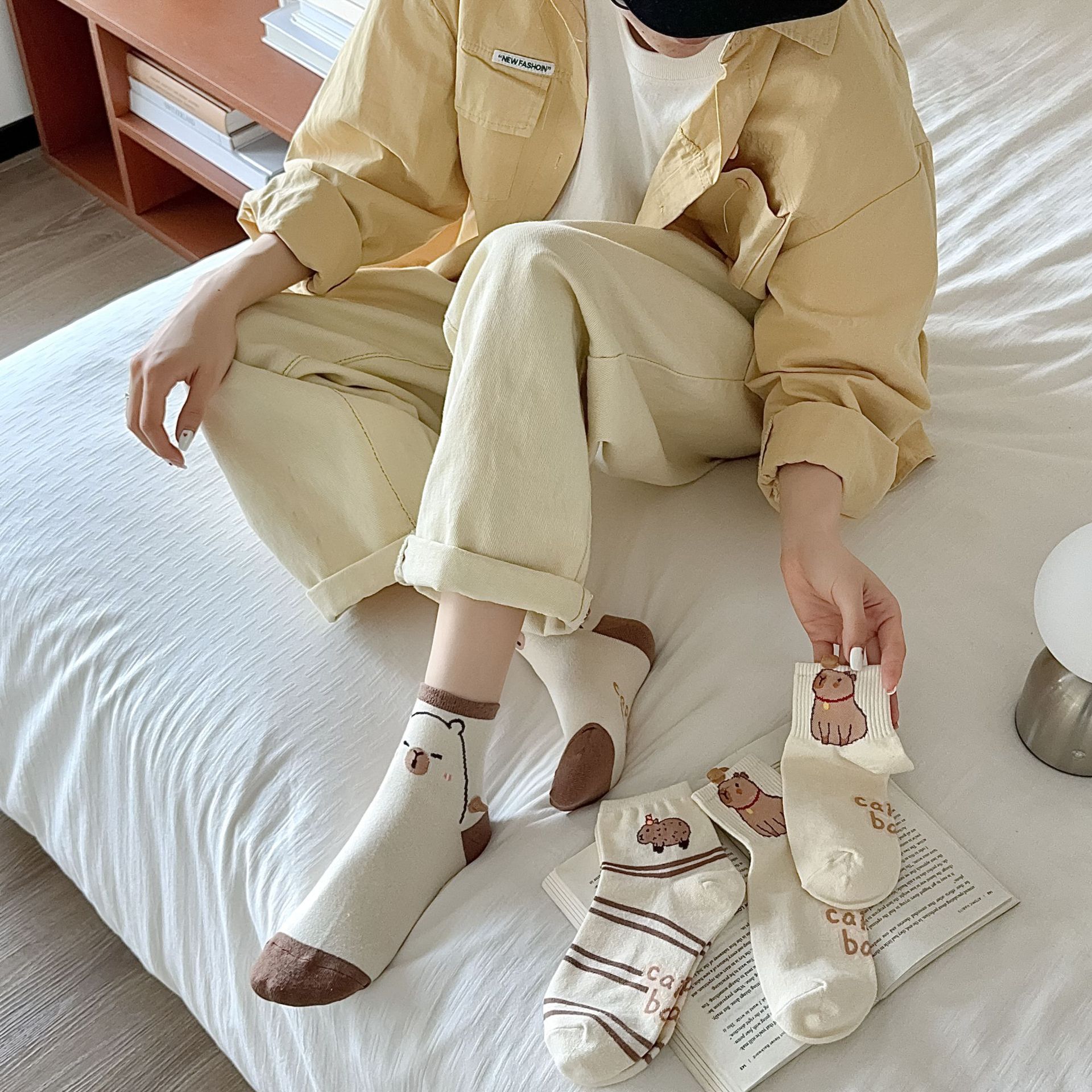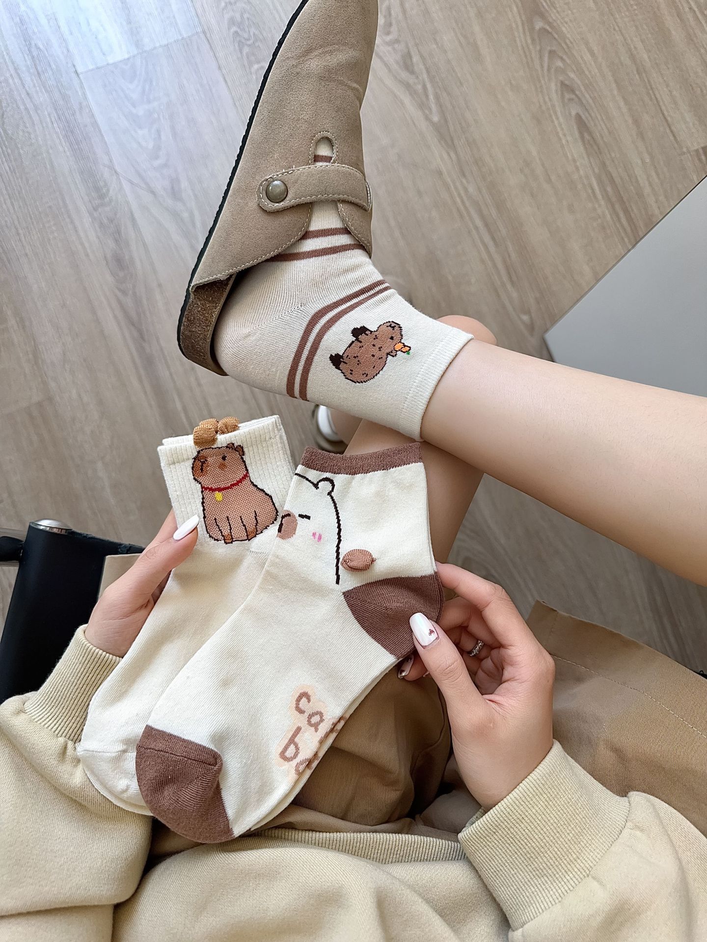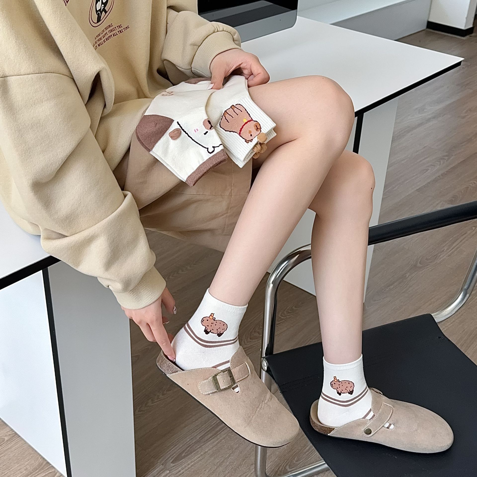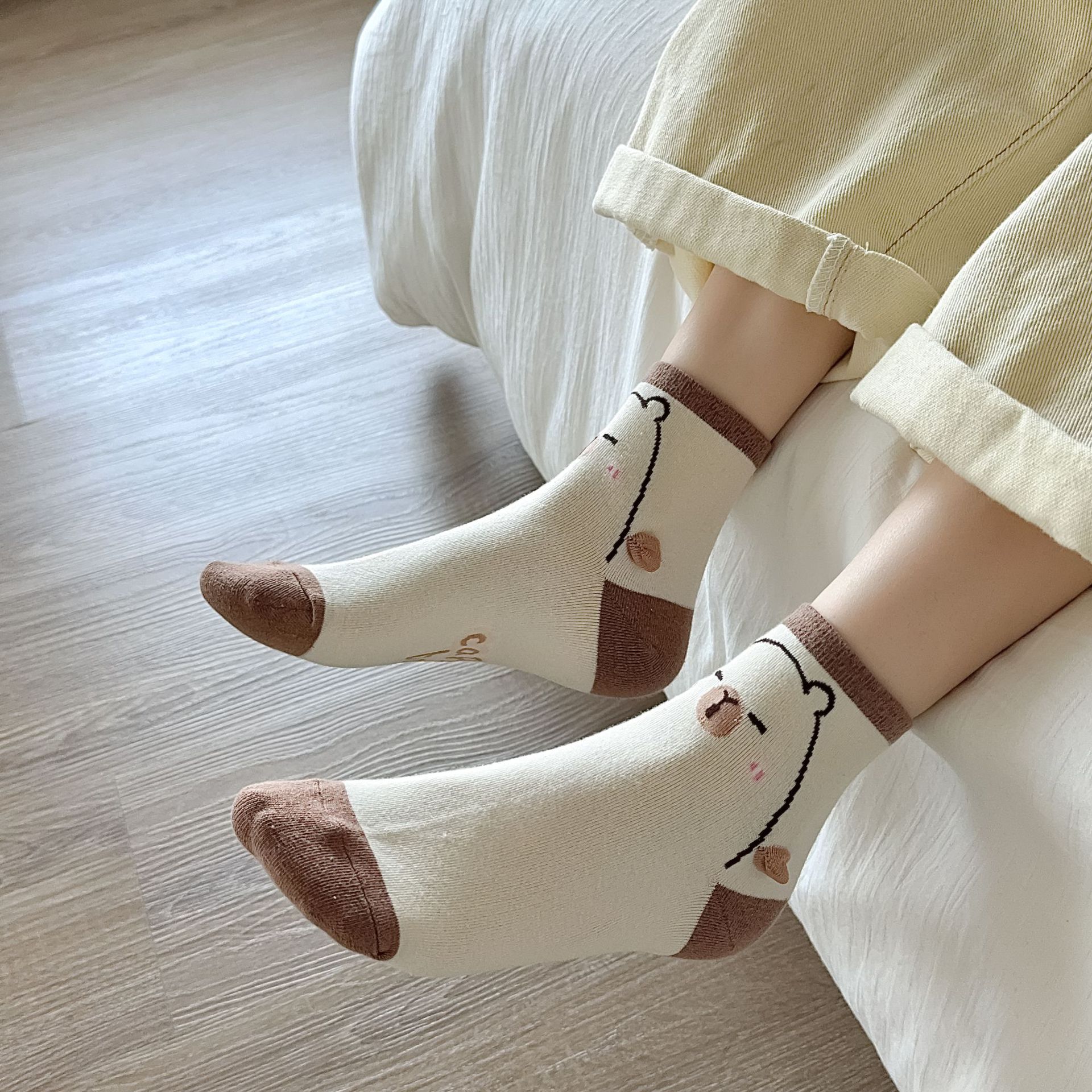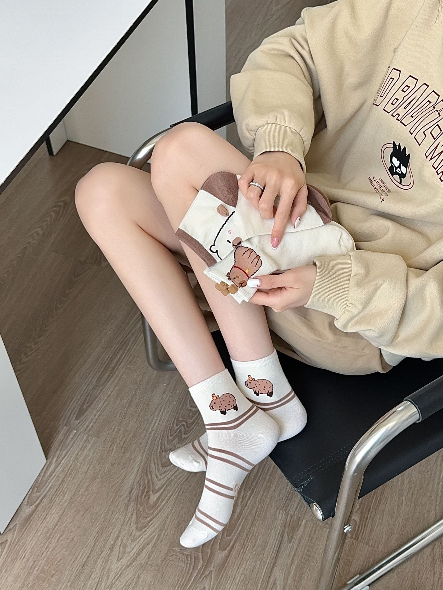 春夏薄款咖色可爱卡通小熊中筒袜袜子个性镂空堆堆袜日系诸暨袜子