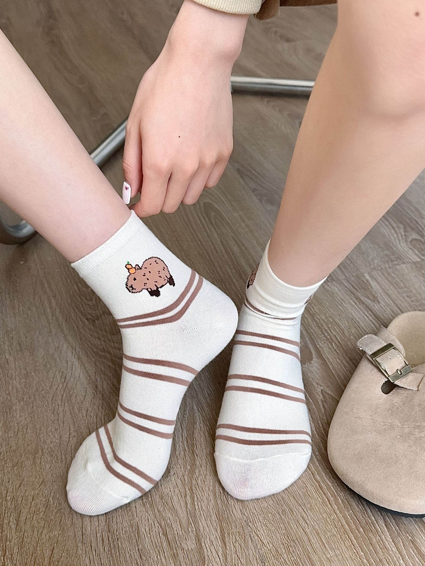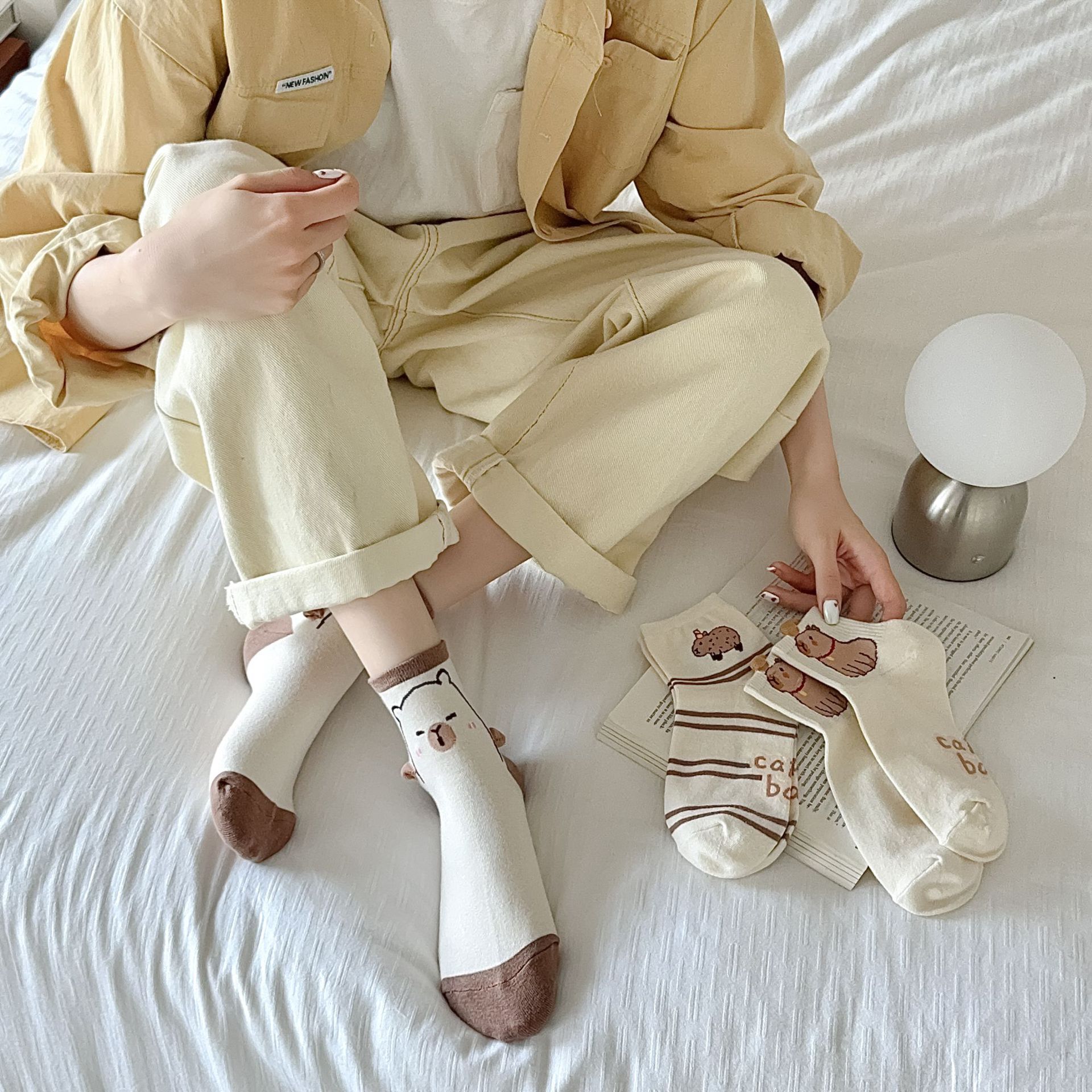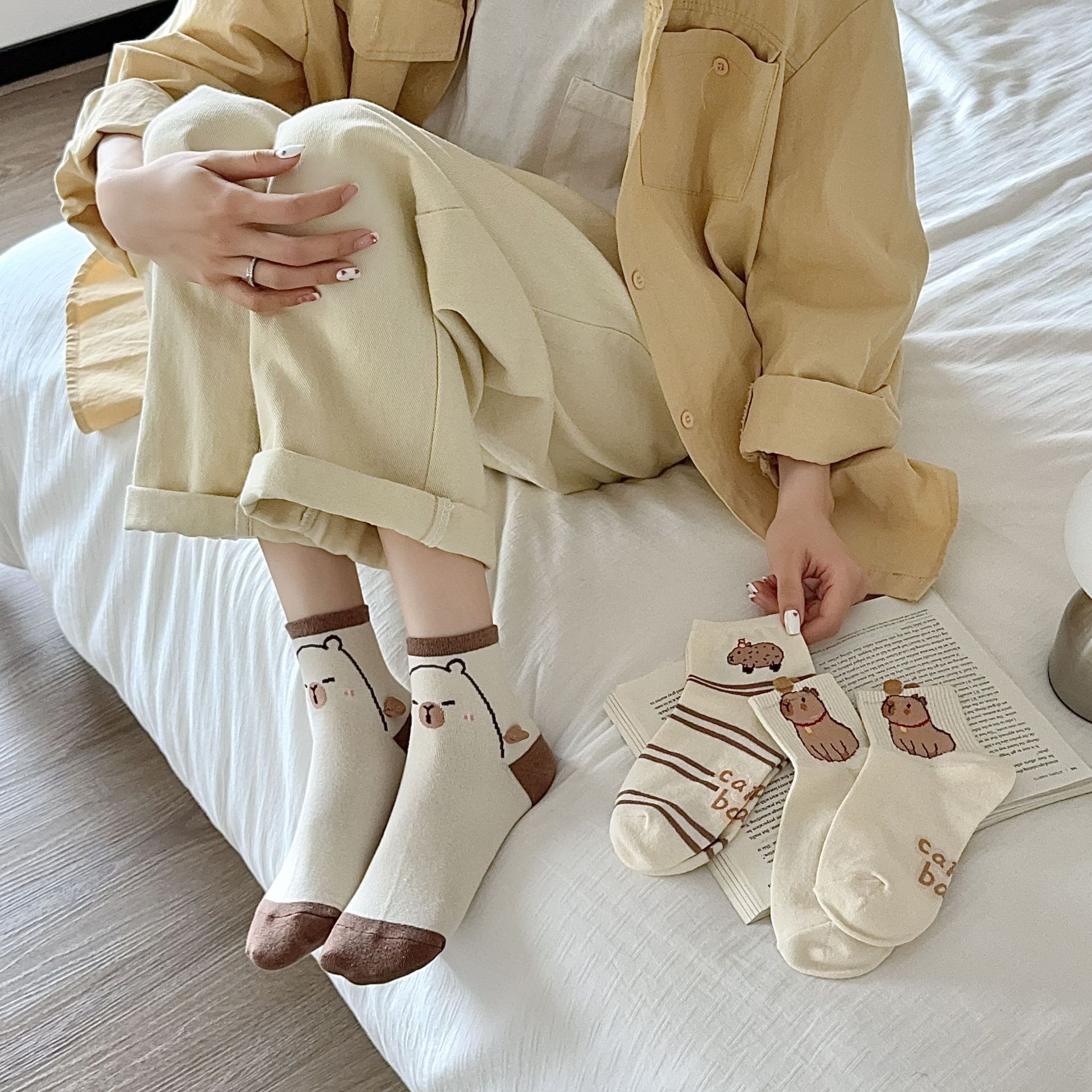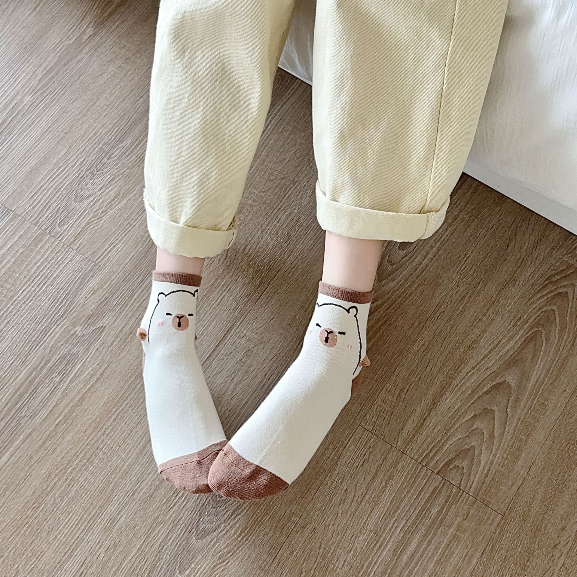 春夏薄款咖色可爱卡通小熊中筒袜袜子个性镂空堆堆袜日系诸暨袜子