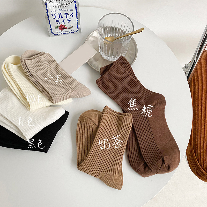 跨境袜子女暖色竖条中筒袜子新款日系奶茶纯色秋冬简约螺纹堆堆袜
