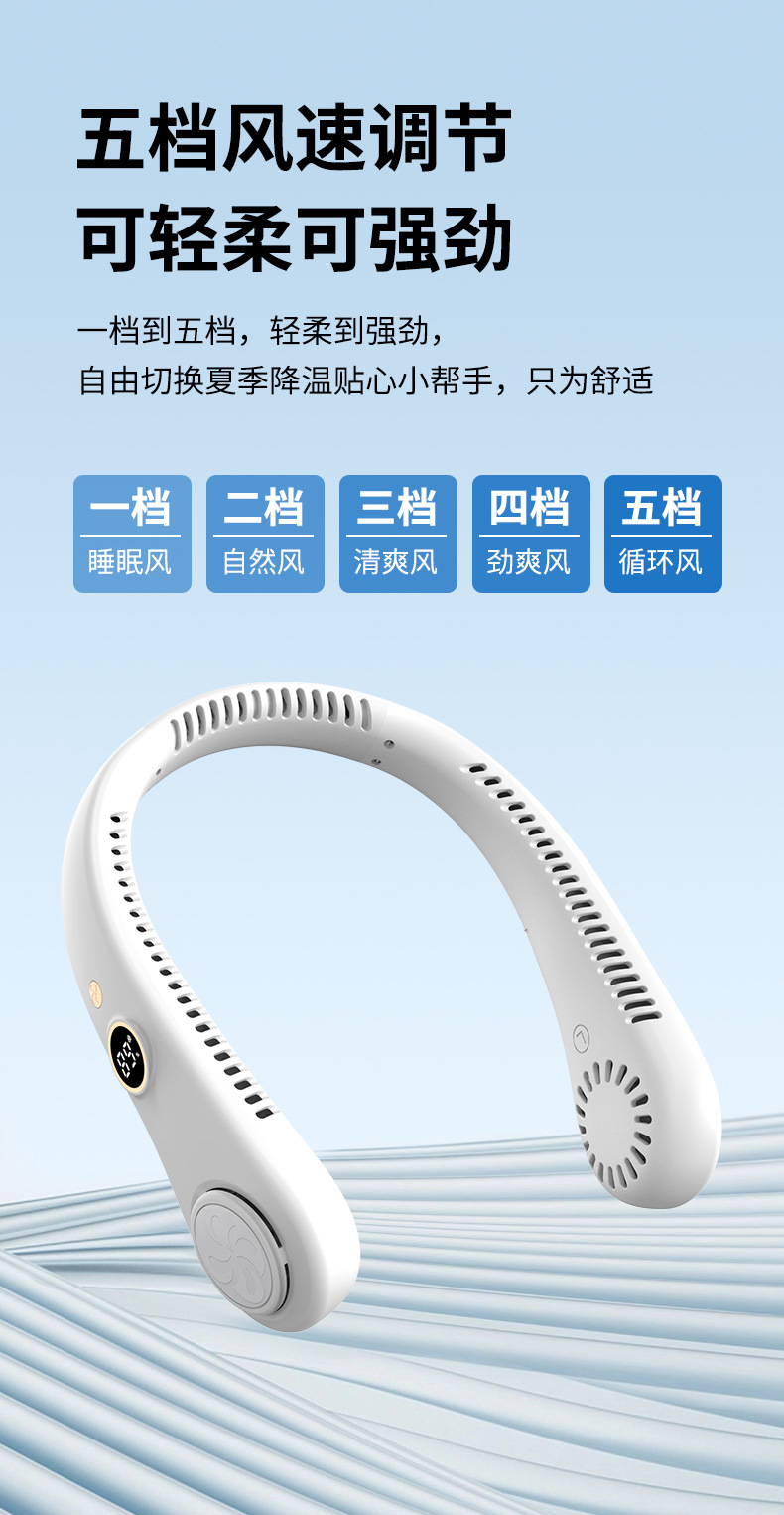 新款跨境无叶挂脖风扇 usb户外便携五档数显学生迷你挂脖小风扇