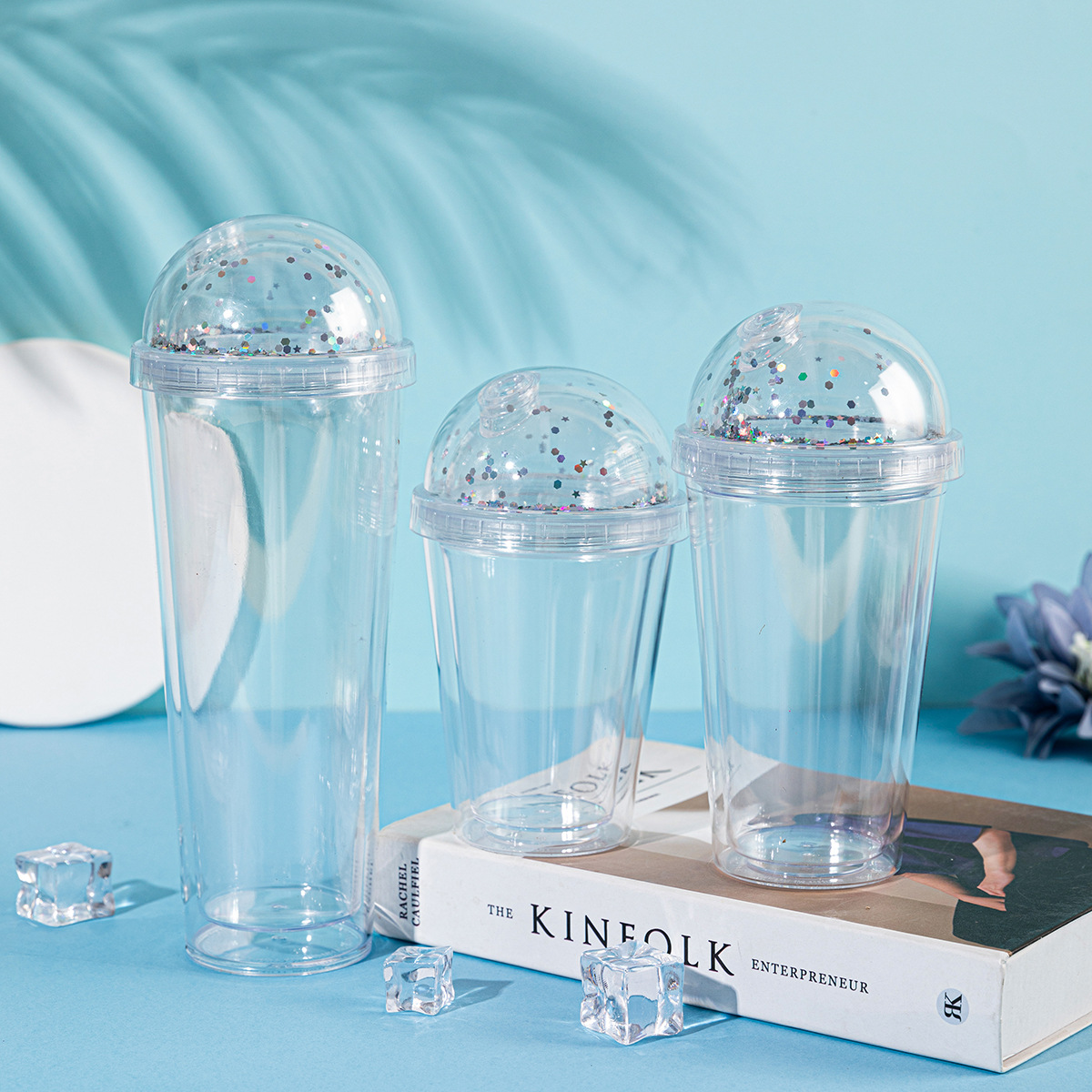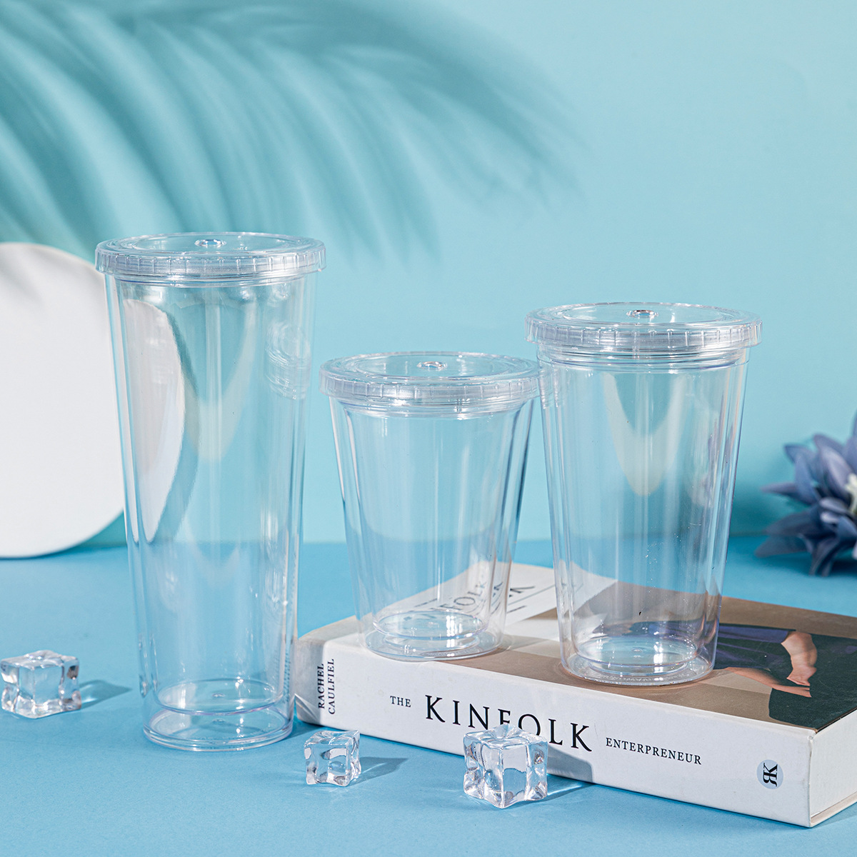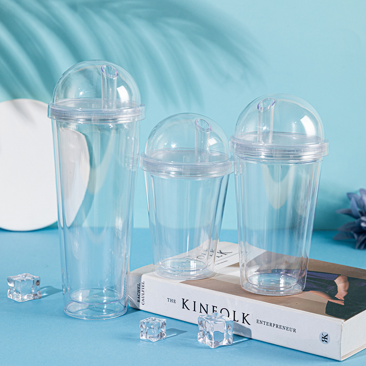 新款简约透明塑料水杯批发创意双层塑料杯户外运动带吸管随手杯子