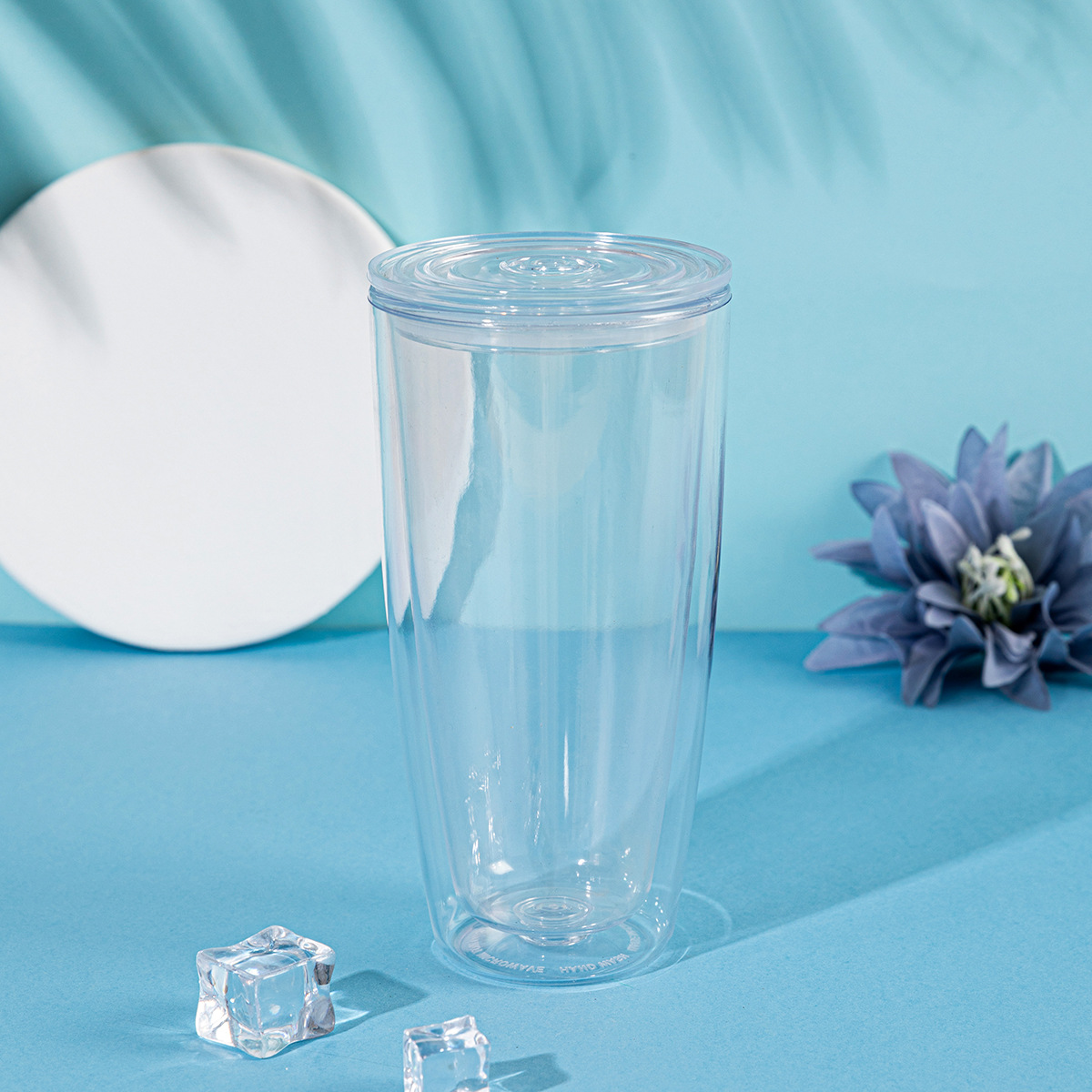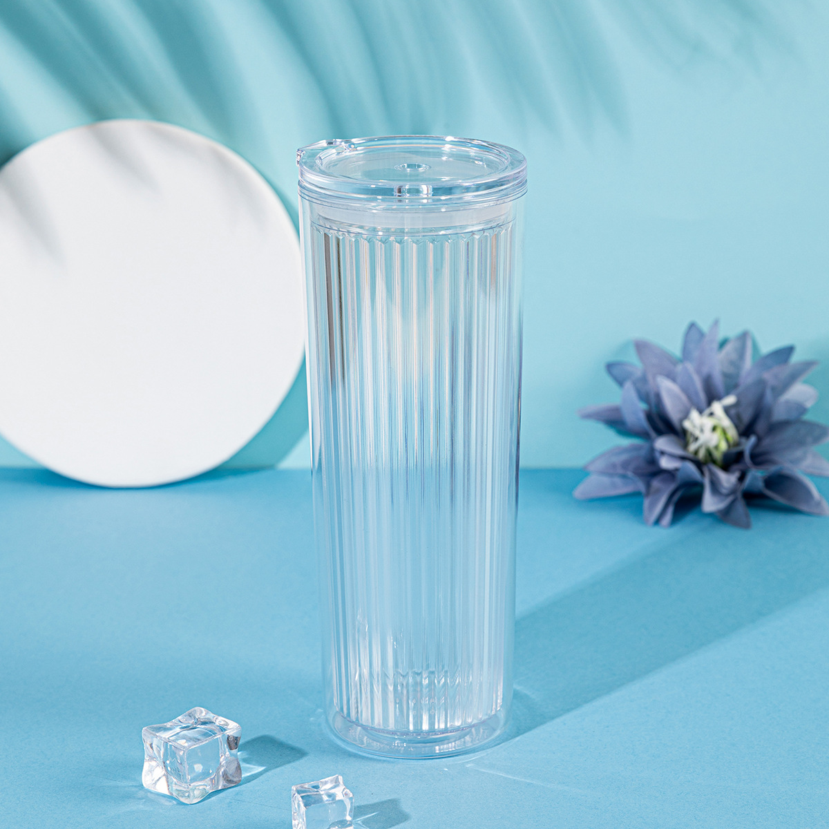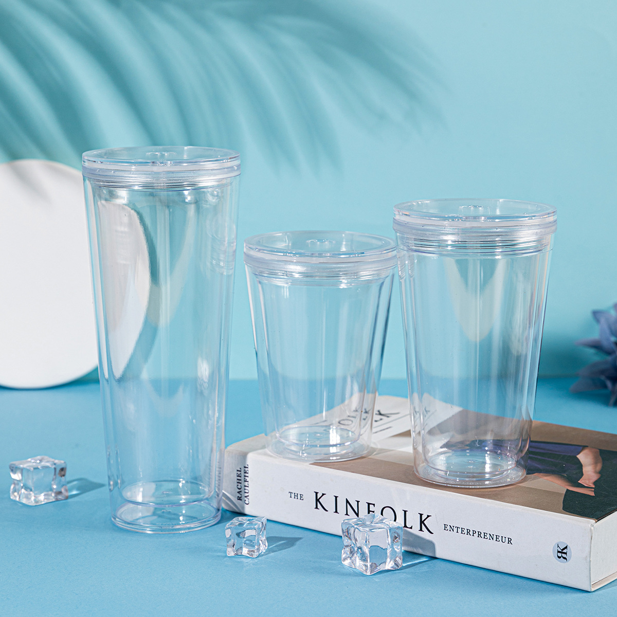 新款简约透明塑料水杯批发创意双层塑料杯户外运动带吸管随手杯子