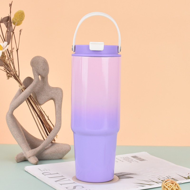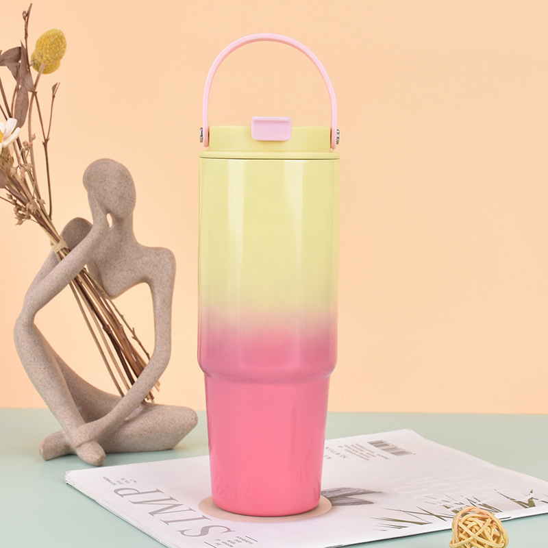 跨境304不锈钢30oz保温杯渐变色双层吸管冰霸杯真空带提手汽车杯