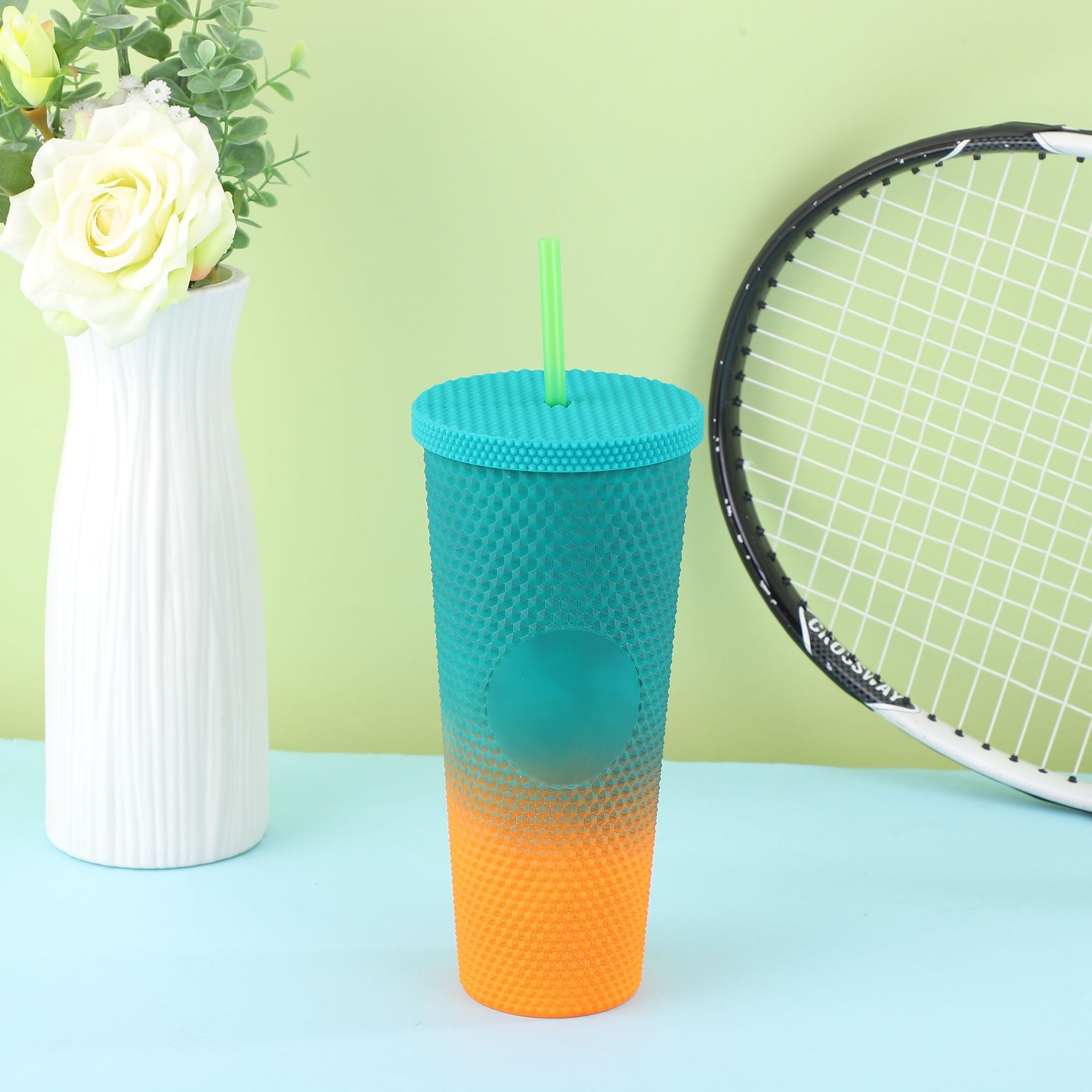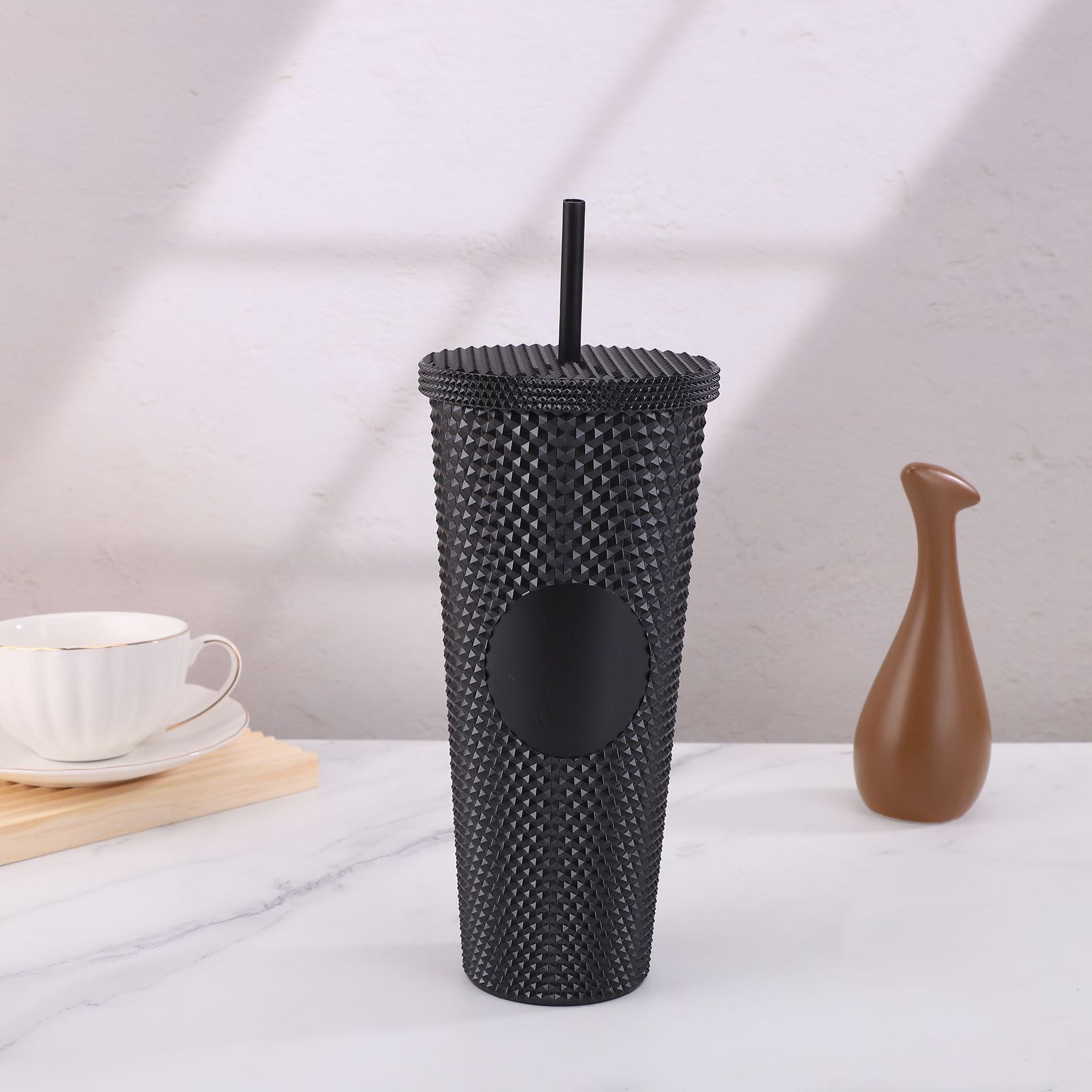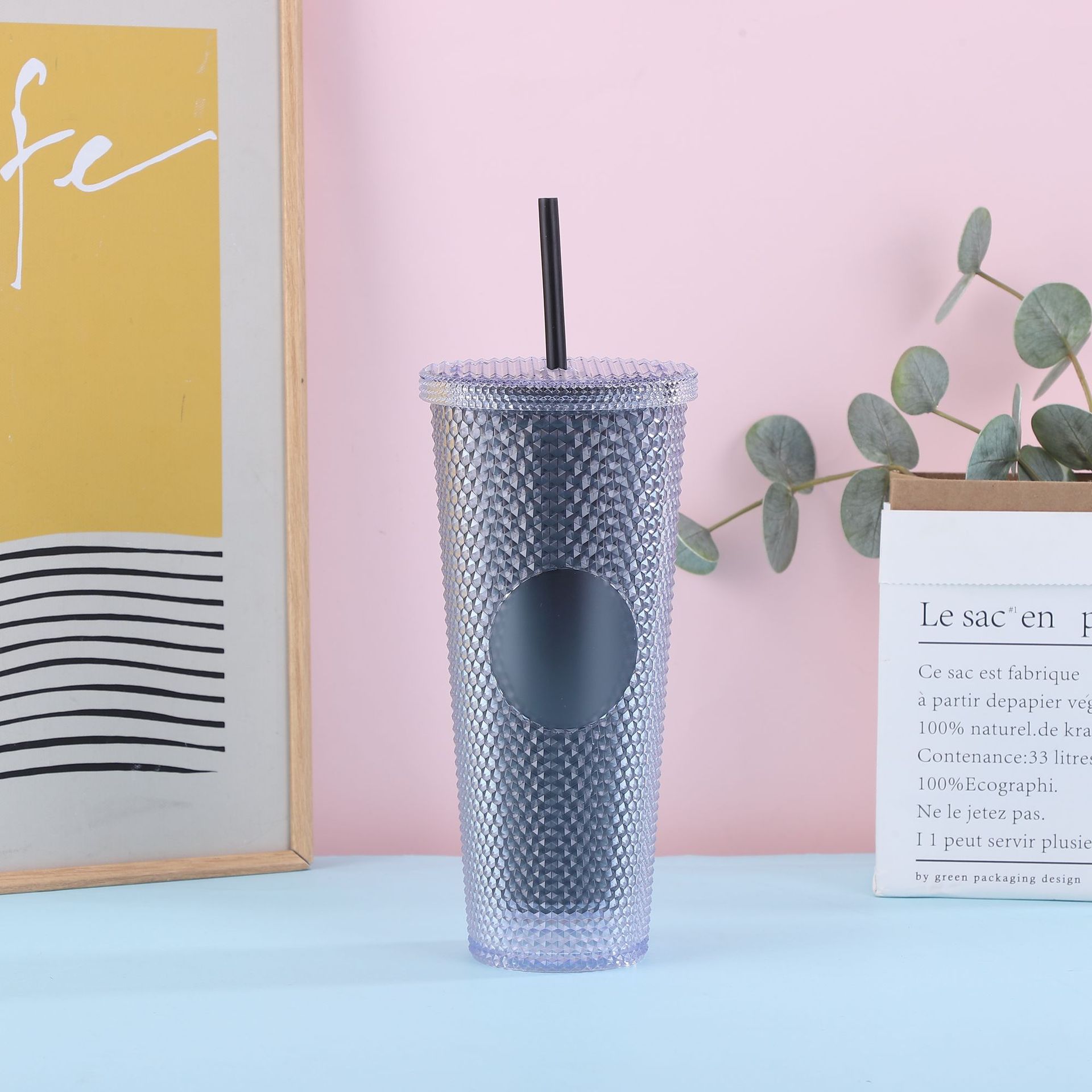 跨境厂家创意双层塑料杯学生夏季带吸管便携大容量PS扎手榴莲杯