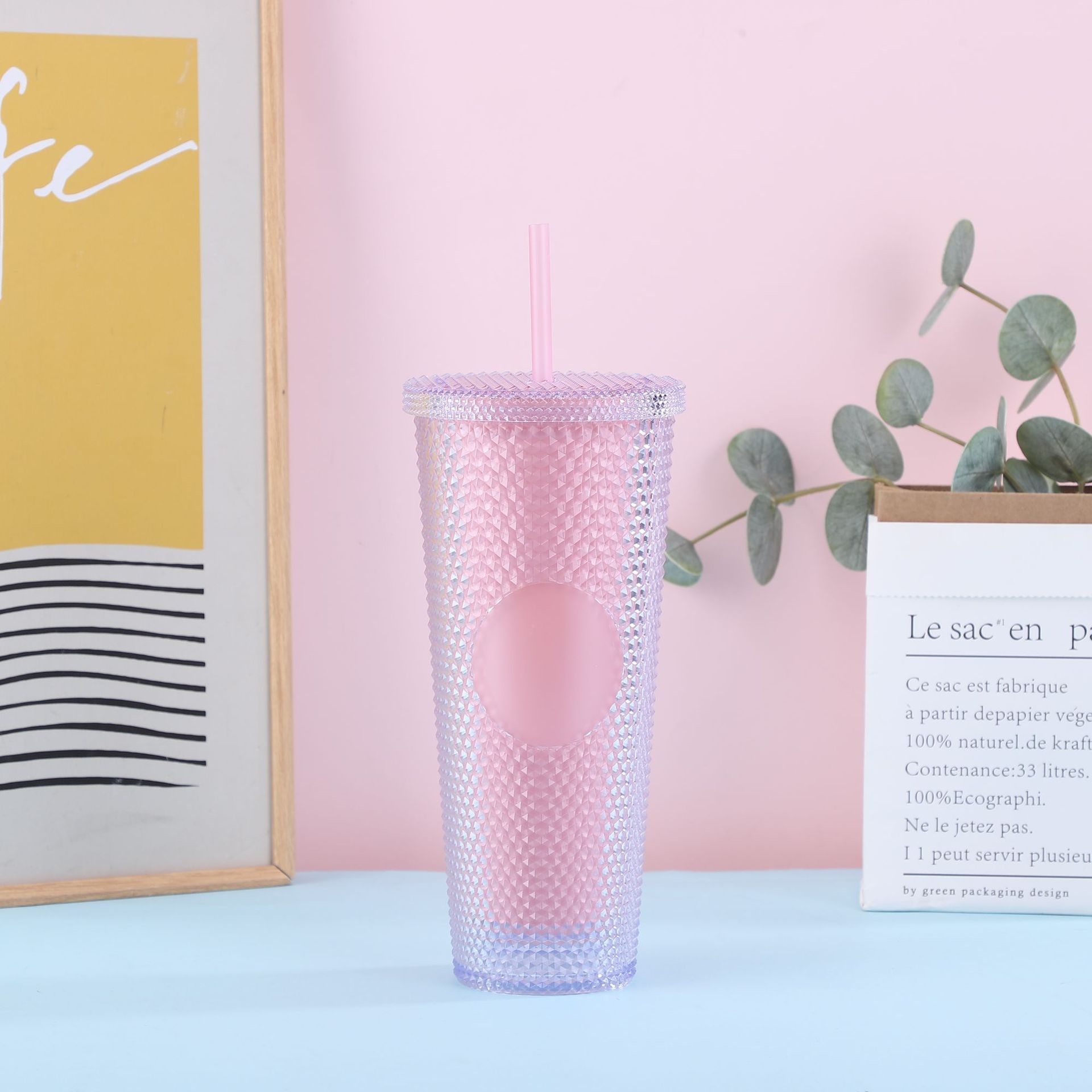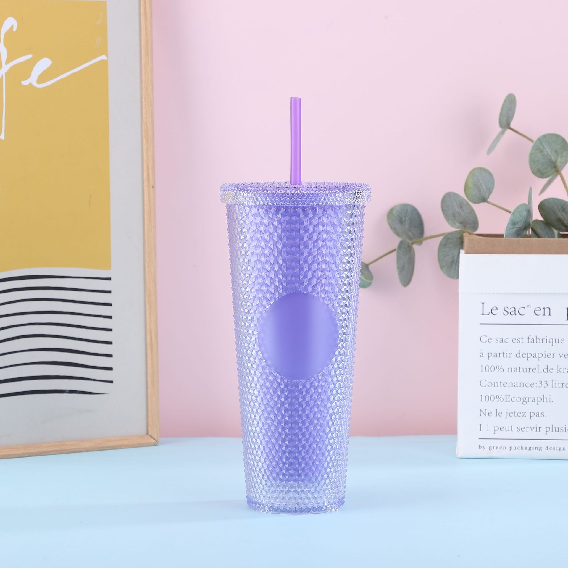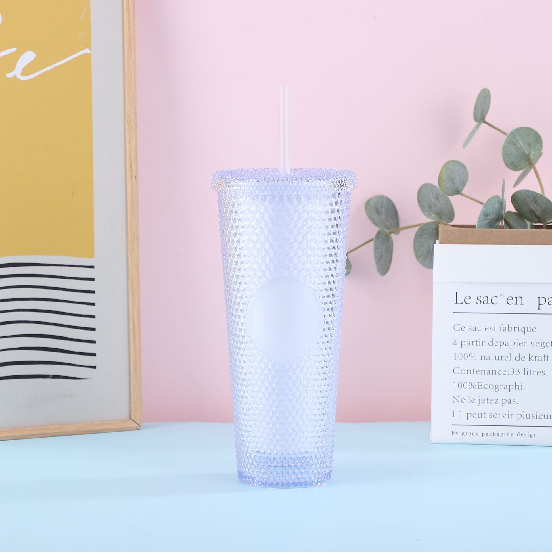 跨境厂家创意双层塑料杯学生夏季带吸管便携大容量PS扎手榴莲杯